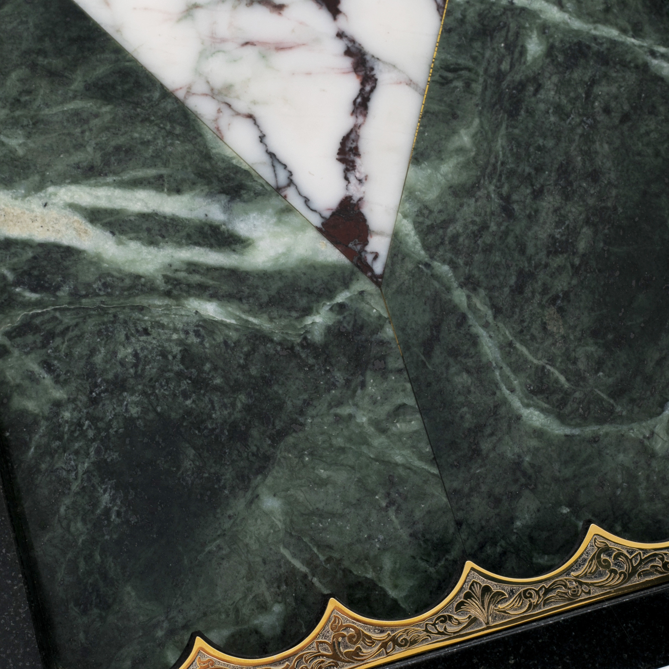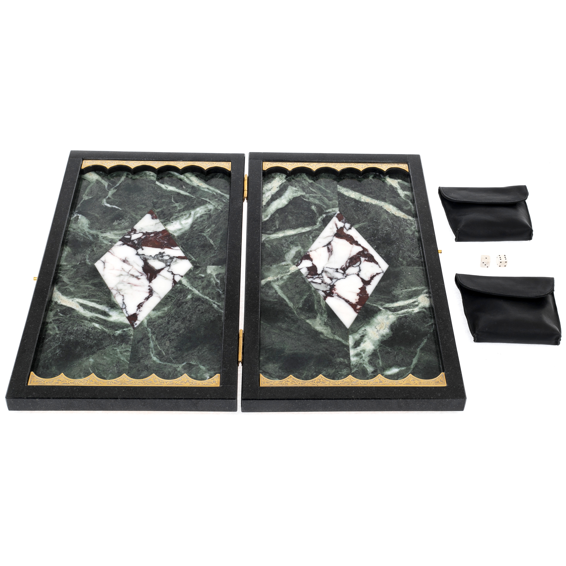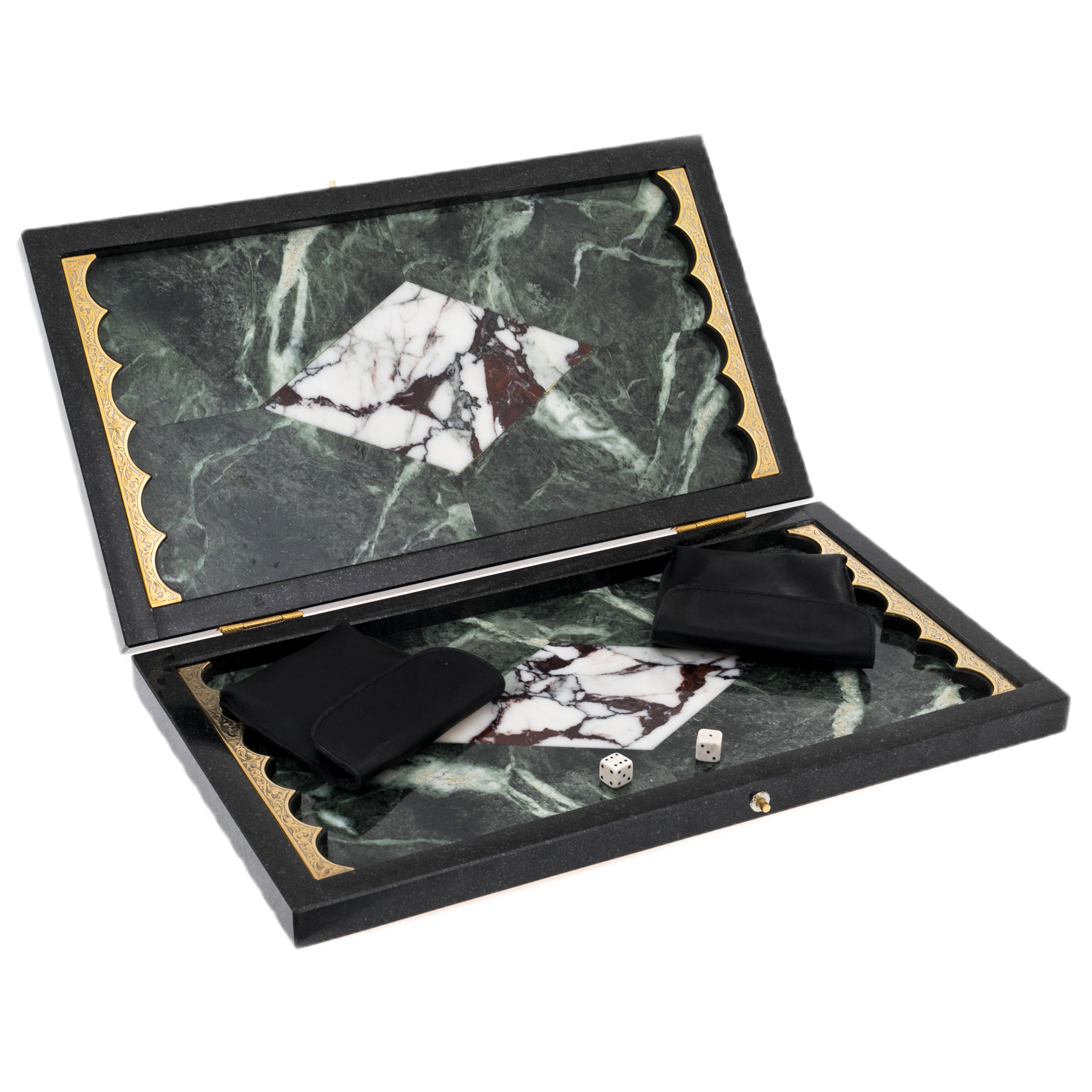 Внутренняя часть поражает гармонией линий и материалов. Игровое поле выполнено из полированного мрамора с глубокими зелёными и белыми оттенками, создающими ощущение мраморной волны, замершей в камне. Каждая деталь — от аккуратных углов до идеально пригнанных соединений — говорит о мастерстве златоустовских мастеров. Золотые накладки с узорным тиснением завершают композицию, превращая функциональный предмет в произведение искусства, достойное коллекции знатока и эстета.