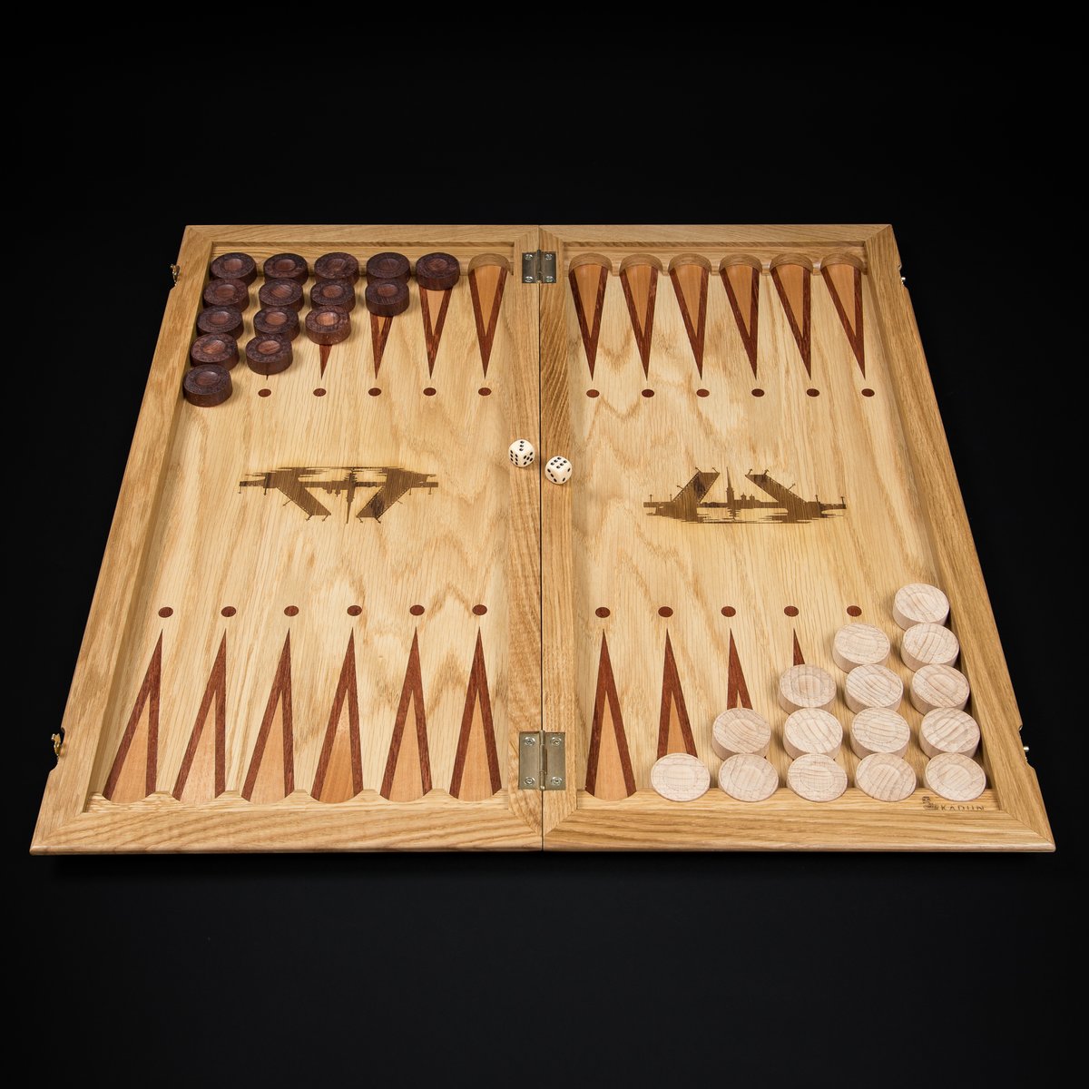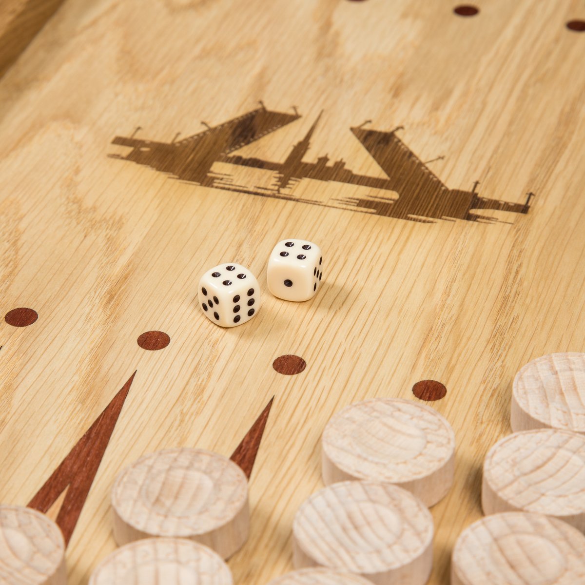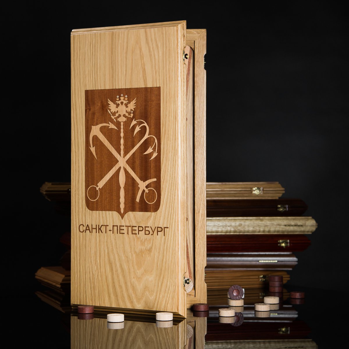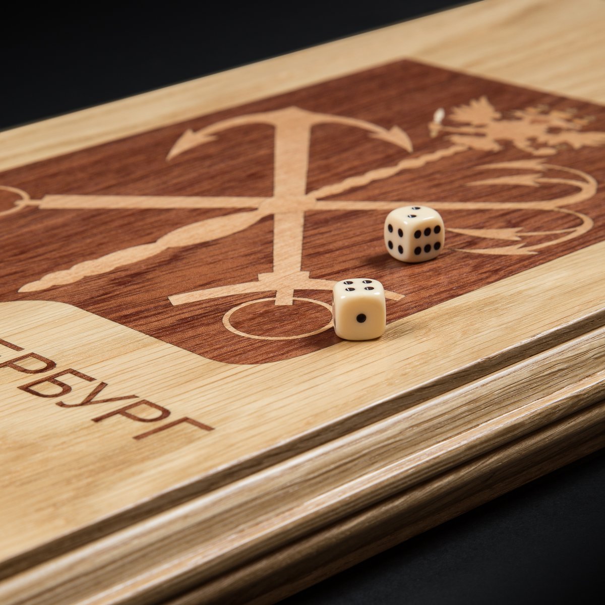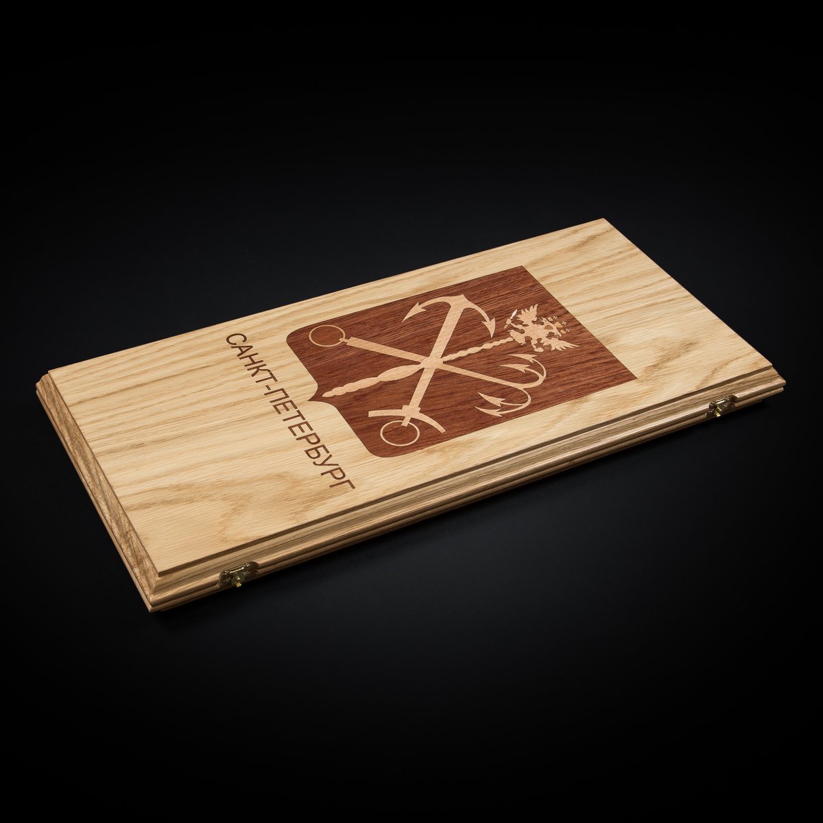 Нарды из полевого дуба "Герб Петербурга" светлый корпус