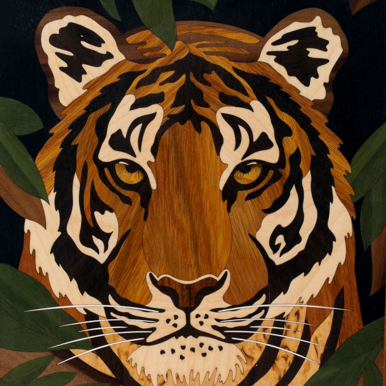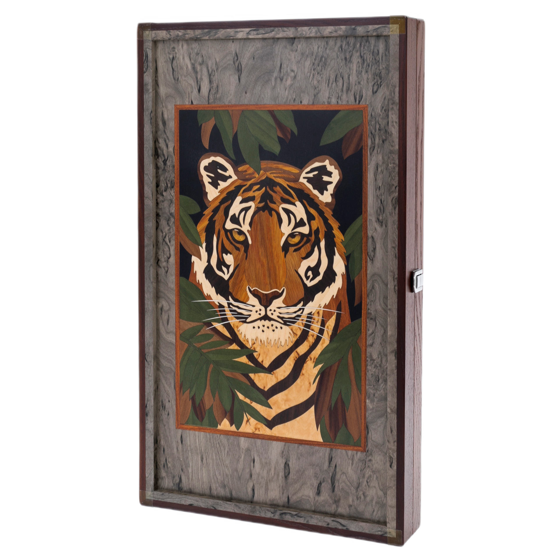 Нарды из тонированной карельской берёзы «Тигр» — редкое произведение искусства, соединяющее мастерство инкрустации и природную мощь благородного дерева. На крышке — изображение тигра, выполненное в технике маркетри из ценных пород деорева. Его взгляд — пронзительный и властный — будто воплощает дух победителя, того, кто всегда идёт вперёд, ведомый инстинктом и внутренним равновесием.