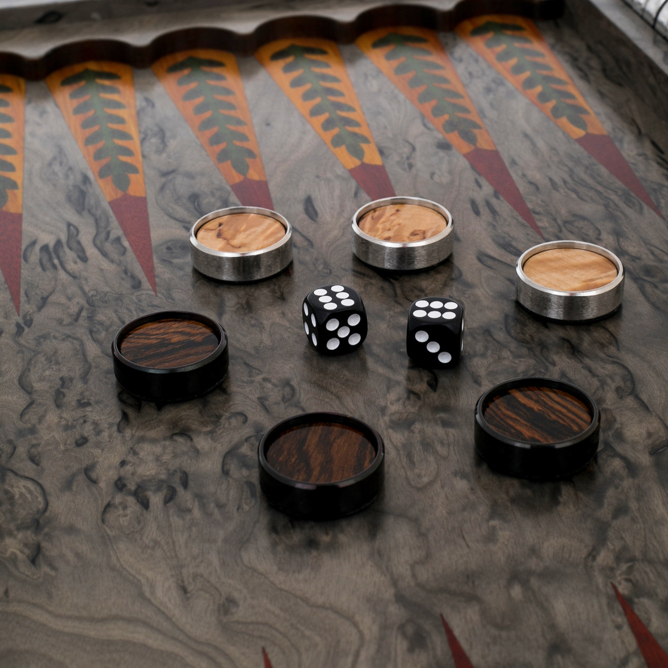 Внутренняя поверхность поля создана с филигранной точностью: насыщенная текстура тонированной карельской берёзы обрамлена тонкими стрелами из инкрустированного шпона, придающими композиции динамику и глубину. Контраст природных оттенков древесины усиливает ощущение движения, будто сама природа участвует в игре. Каждая шашка идеально отполирована, а тактильное тепло дерева делает процесс игры не просто развлечением, а своеобразным ритуалом, наполненным эстетикой и внутренним спокойствием.