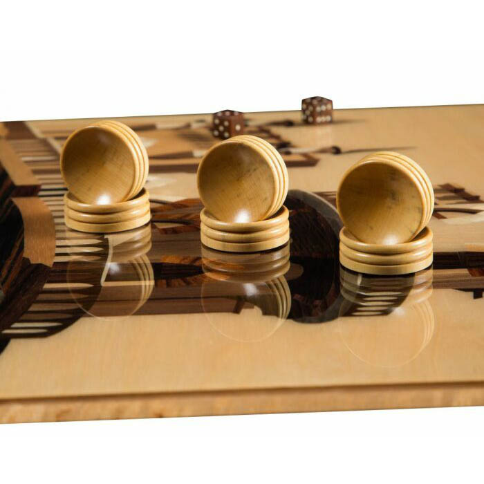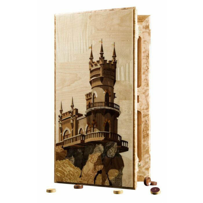 Эти нарды — не просто предмет для игры, а подлинное произведение декоративно-прикладного искусства. Фасад украшен изысканной маркетри: образ замка Ласточкино гнездо, собранный вручную из сотен деталей различных пород дерева, вырисовывается с филигранной точностью. Основание выполнено из карельской берёзы — уникального материала с живым узором и тёплым янтарным свечением, созданным самой природой в течение столетий. Каждая фишка выточена вручную, отшлифована до шелковистой гладкости, как будто носит отпечаток благородной руки мастера.
