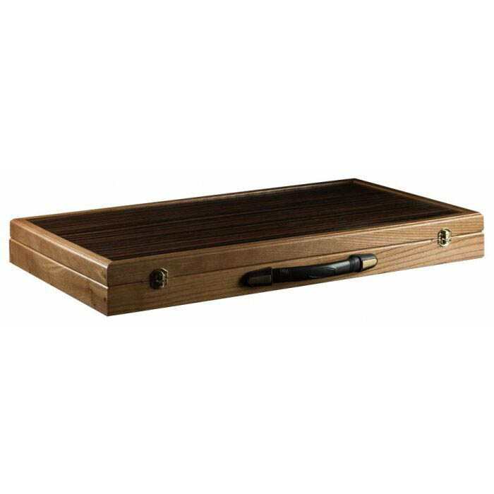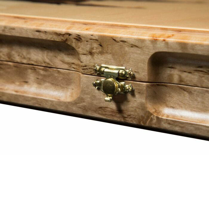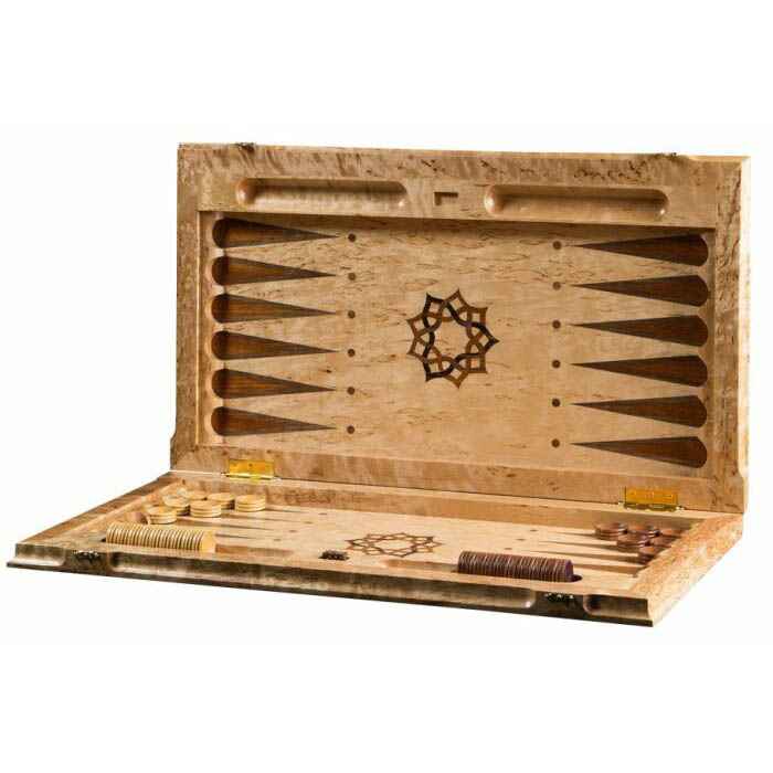 Внутреннее игровое поле обрамлено выразительным орнаментом, составленным методом инкрустации. Острые клинья направлены в центр композиции, где расположена звезда, символизирующая движение и стремительность — качества, так необходимые в игре. Контраст светлых и тёмных пород дерева подчёркивает динамику игрового пространства. Массивная латунная фурнитура фиксирует створки с мягким щелчком, создавая ощущение замкнутости и завершённости — как в сейфе, где хранятся личные артефакты и уединённые удовольствия.