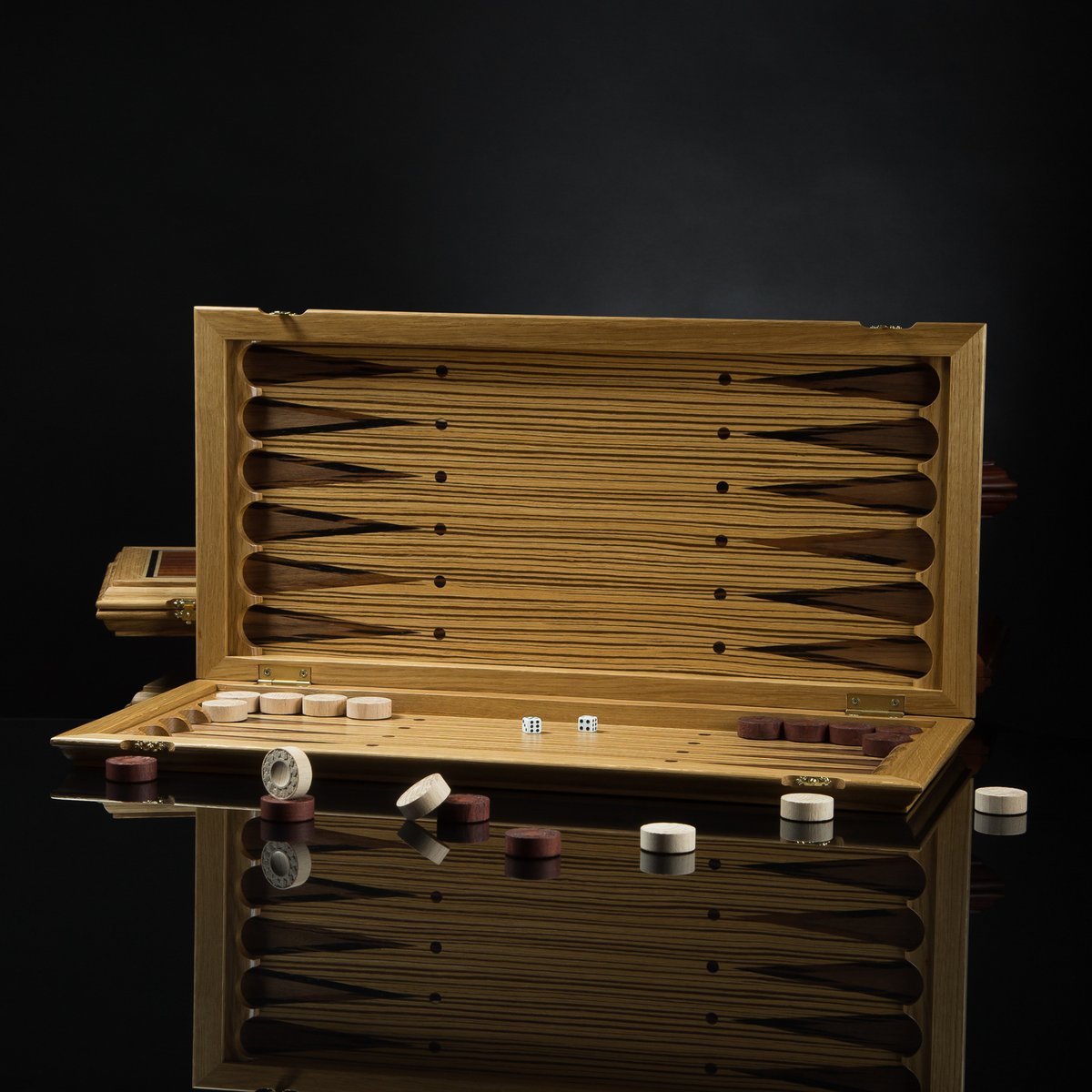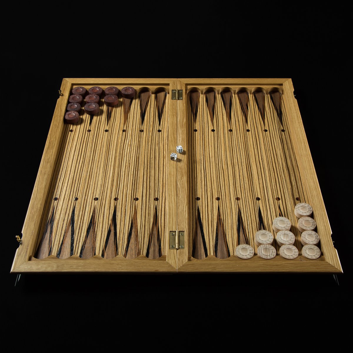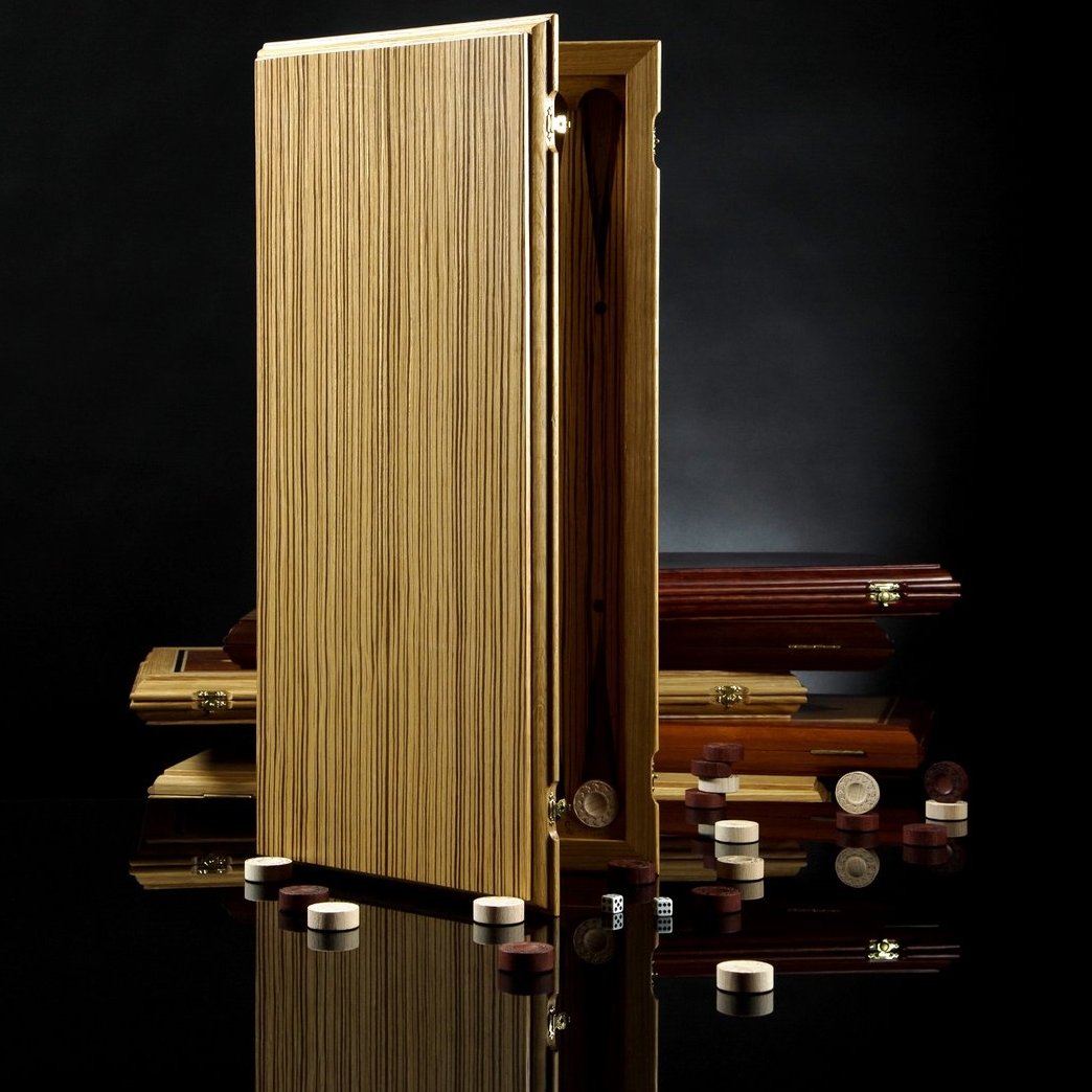 Материалы:шашки – самшит; корпус - зебрано, шелковисто-матовый лак; лицевая сторона – зебрано; поле внутри - зебрано, венге, сапеле; кубики - арамит.