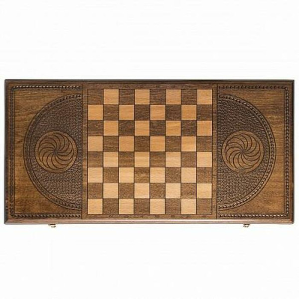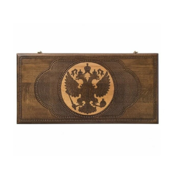Доска из натуральной древесины украшена фактурными резными узорами, которые не только красивы, но и тактильно приятны, а также гербом РФ. На обратной внешней стороне нанесено поле для шашек. Части доски скреплены фурнитурой из настоящей меди. Фишки стандартные, оснащенные противоцарапными подложками.