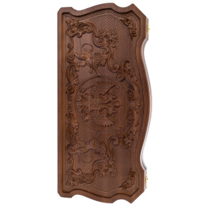 Нарды, выполненные из цельного бука и украшенные глубоким резным орнаментом, передают характер настоящего парадного подарка, в котором благородство материала сочетается с символической силой изображения. На внешней панели читается тщательно проработанный рельеф с двуглавым орлом, окружённым изящными завитками и аллегорическими фигурами. Мастер создавал объем, добиваясь игры света и теней на тёплой древесной поверхности, подчёркивая естественную текстуру бука и превращая крышку в подобие гербового щита.