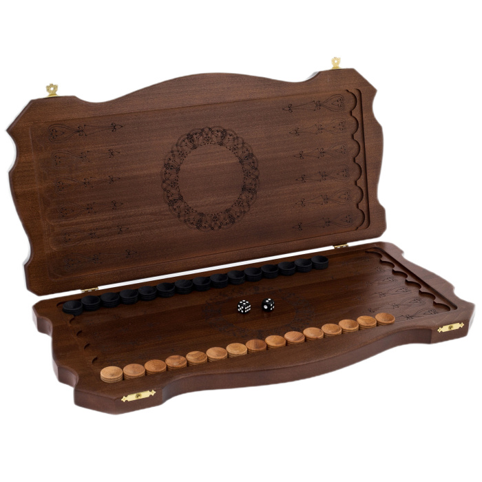 Внутренняя плоскость хранит ту же эстетику изысканной сдержанности: гладкая поверхность, украшенная тонкой лазерной графикой, создаёт чёткий рисунок игрового поля. Каждая выемка под фишки выточена вручную, образуя гармоничный ритм по краям доски. Контраст светлых и тёмных фишек, выточенных из натурального дерева, дополняется аккуратно огранёнными костями — небольшими акцентами, завершающими ансамбль. Латунные петли и замки придают изделию завершенность и надёжность, подчёркивая плотное прилегание половинок и плавность хода при открытии.