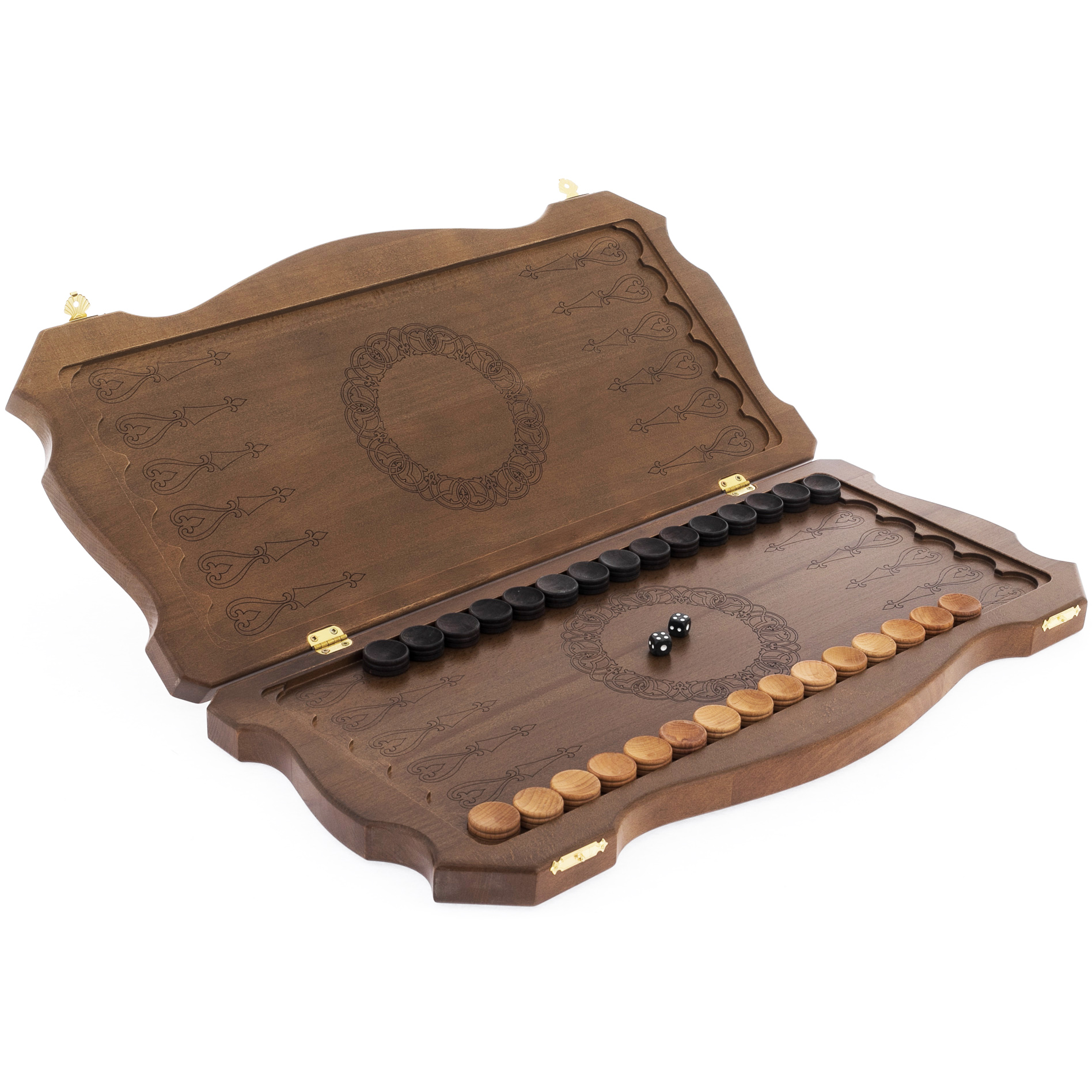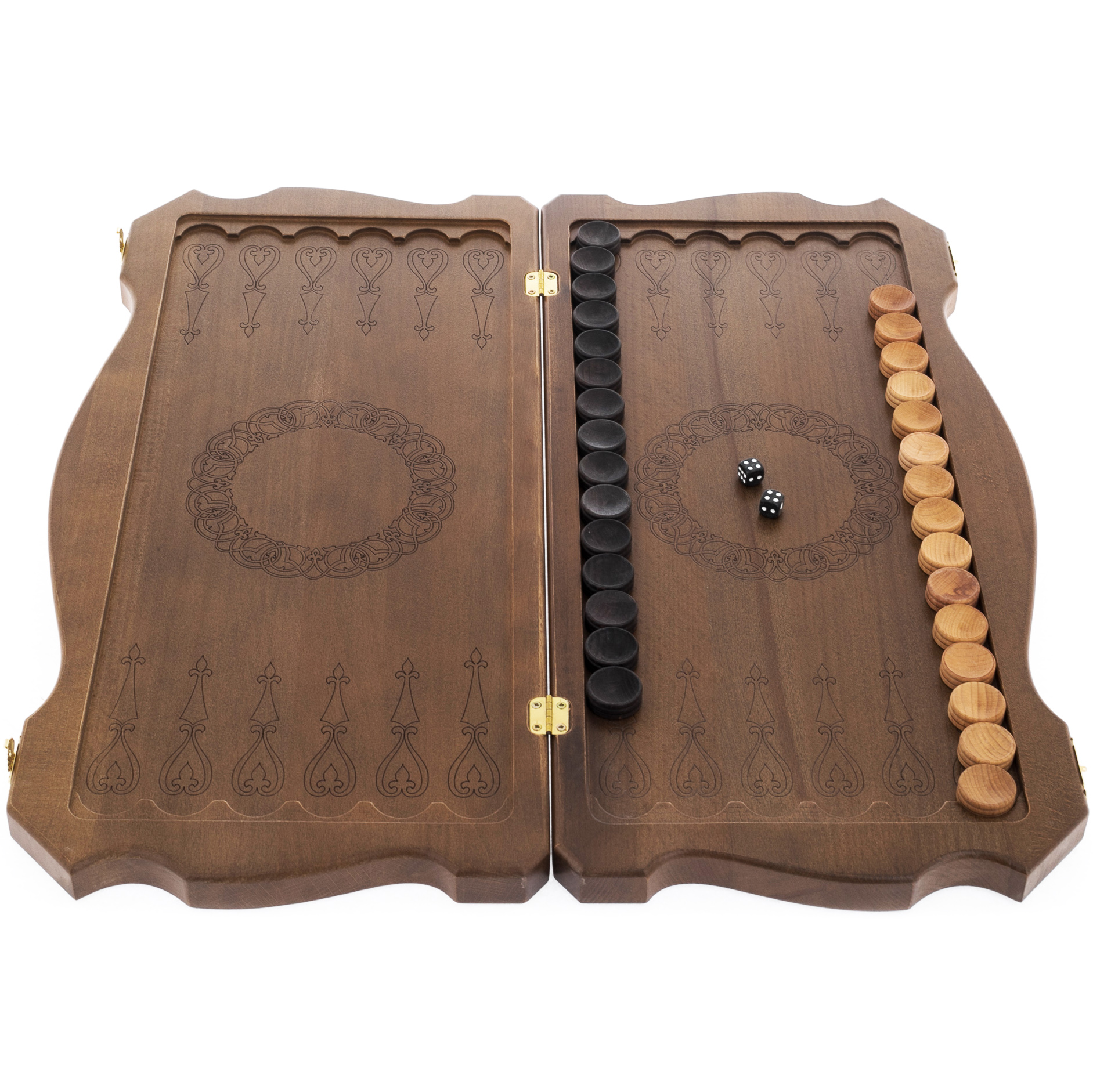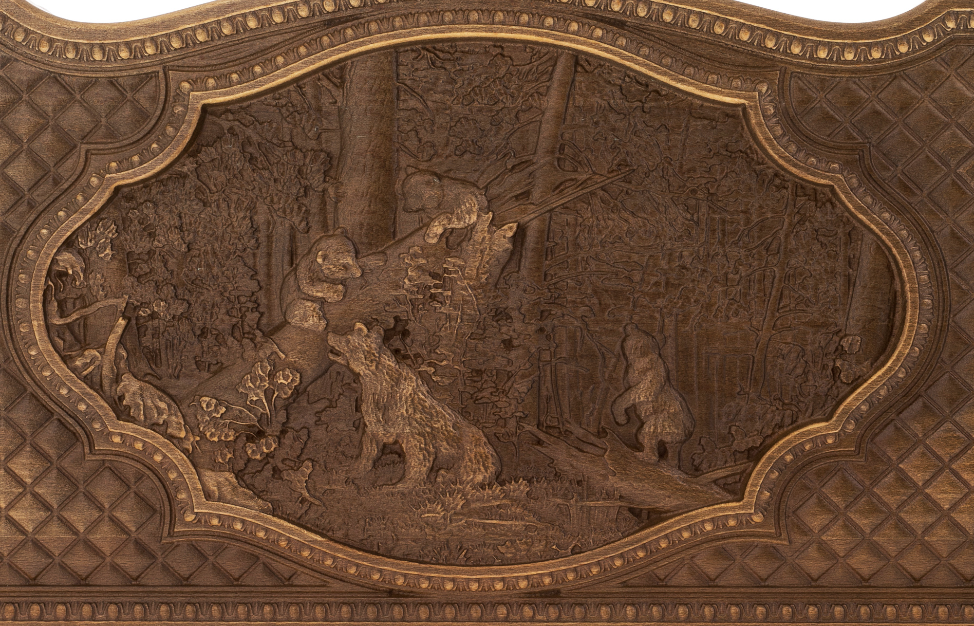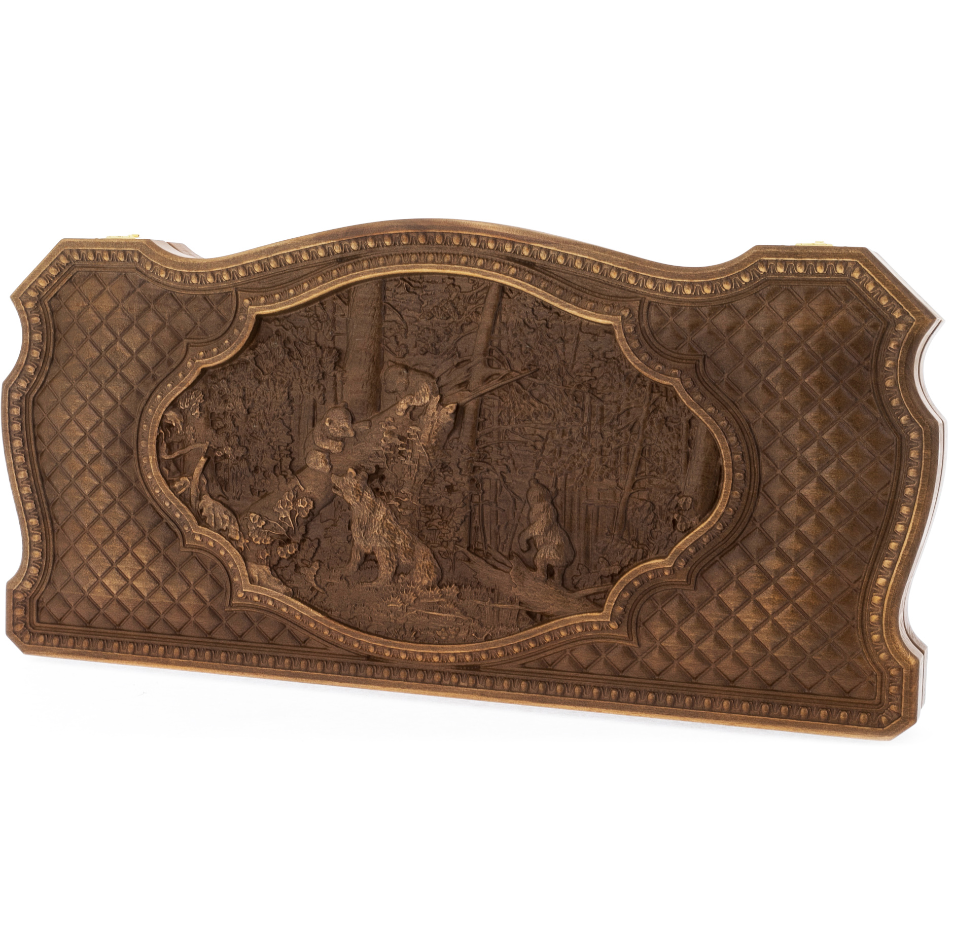 Нарды резные из бука "Мишки в лесу" выделяются своей фигурной основой и резьбой. Для придания эффекта благородной старины данная серия нард обрабатывается декоративной патиной. Эти нарды изготовлены из массива бука. Лицевая сторона украшена обильной резьбой. В комплект входят фишки и зары.