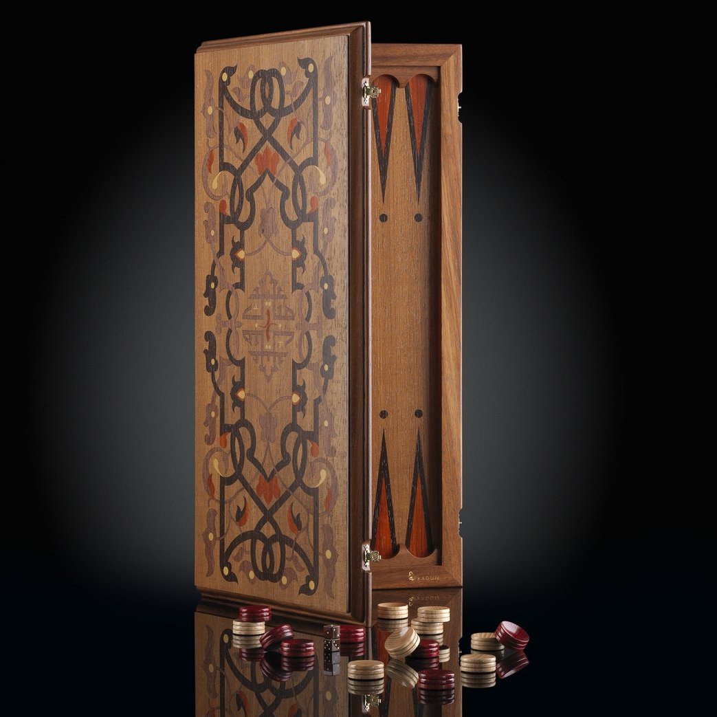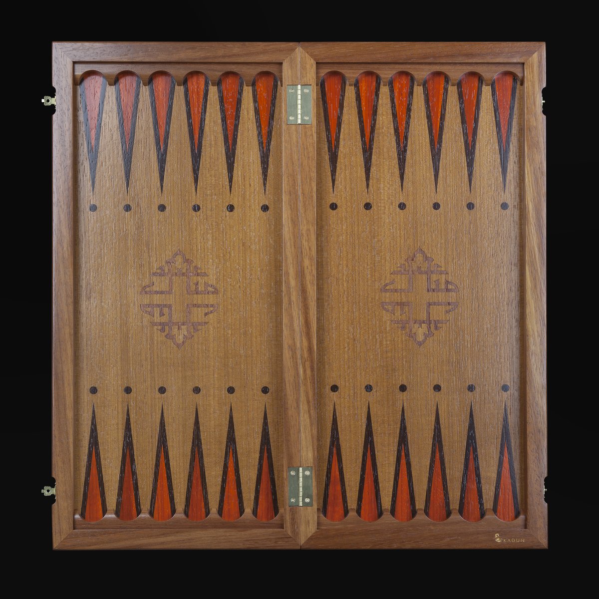 Материалы:шашки – ясень; корпус - ироко, матовый лак; лицевая сторона – ироко, венге, падук, лимонное дерево (мовингу), макоре; поле внутри - венге, падук, макоре; кубики - обсидиан.