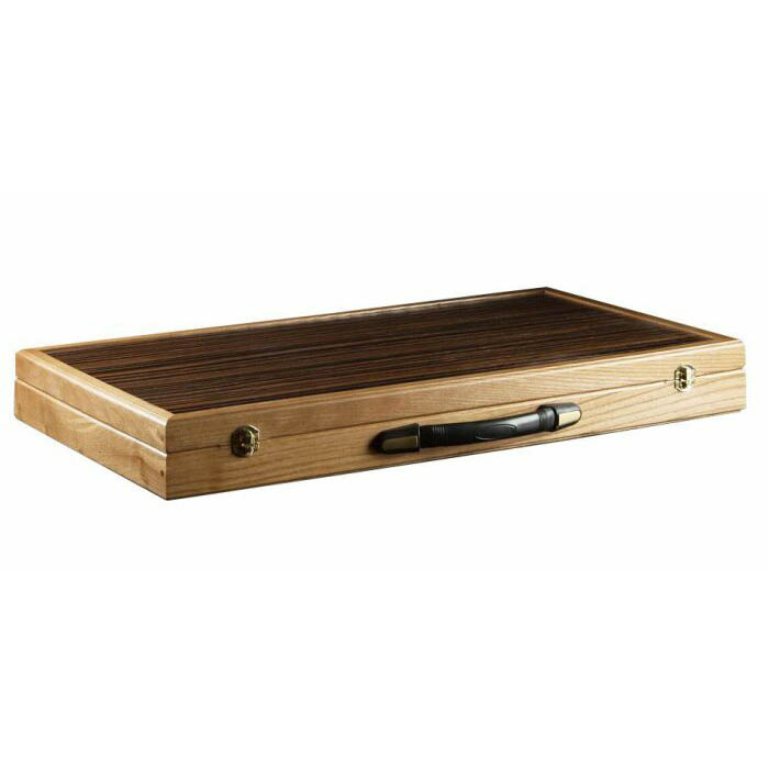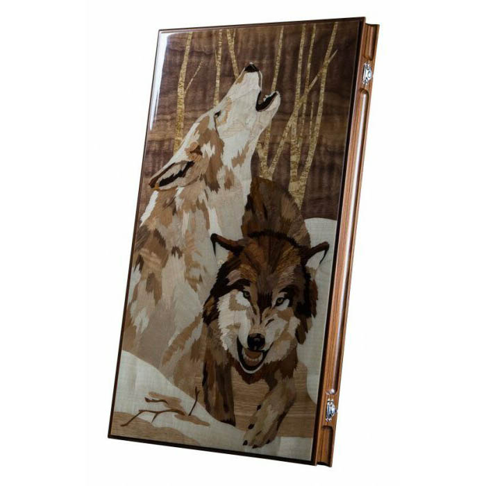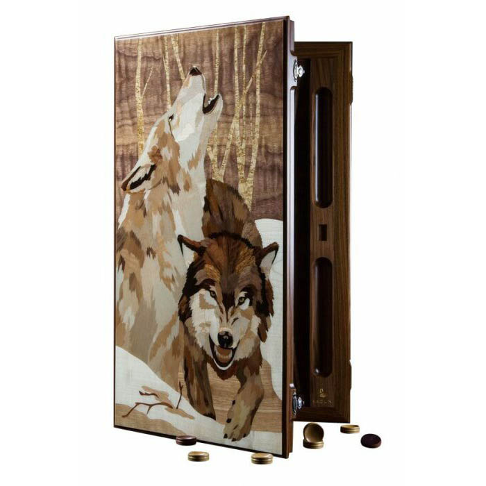 Эта коллекционная нардовая доска, выполненная из редкого палисандра, соединяет в себе эстетику прикладного искусства и природную мощь дикой природы. Поверхность крышки, украшенной сложной маркетри, воссоздаёт волков в лесной чаще: один с поднятой головой воет ввысь, другой — с хищным прищуром — будто выходит на охоту. Изображение собиралось вручную из множества пород дерева, каждая из которых добавила рисунку свой тон, глубину и фактуру. Внутри скрывается игровое поле с лаконичным дизайном, раскрывающим природную текстуру палисандра, а фишки двух цветов идеально сочетаются с общей цветовой гаммой.