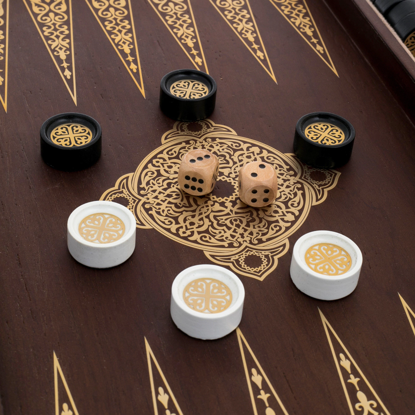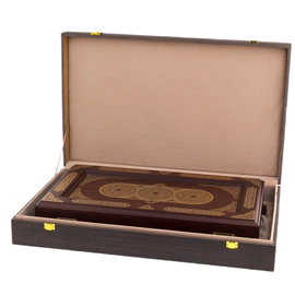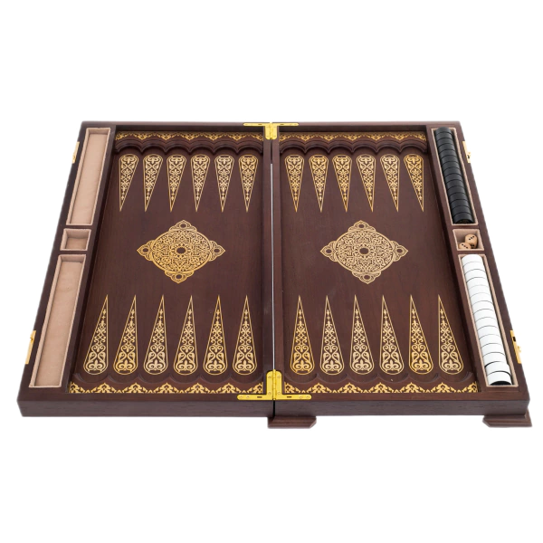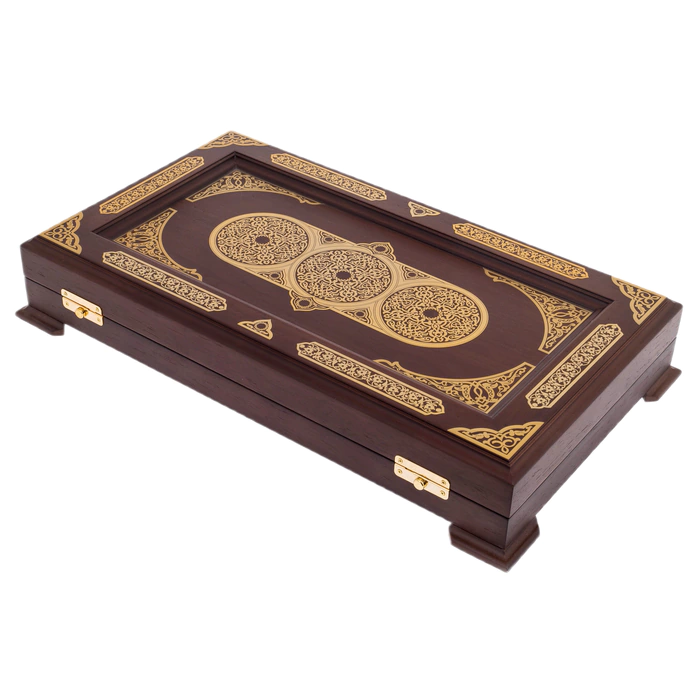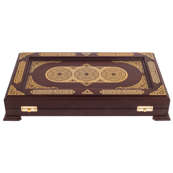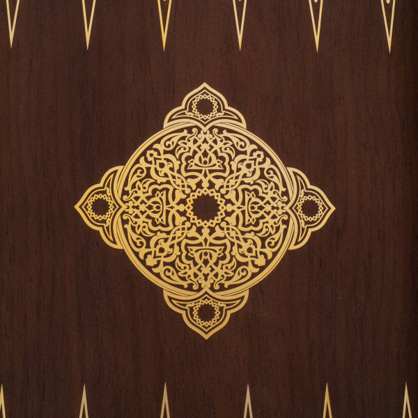 Нарды «Восточный узор» — изысканное настольное изделие, выполненное из древесины венге, обладающей глубокой насыщенной текстурой и благородным тёмным оттенком. Внешняя поверхность украшена сложной орнаментальной композицией с тонкой гравировкой и контрастными золотистыми элементами, создающими эффект ювелирной точности. Внутреннее поле оформлено симметричным узором, где каждая деталь — от вытянутых треугольных клиньев до центральной розетки — выверена и подчинена единой эстетике. Комплект дополнен фишками и костями, аккуратно размещёнными в предусмотренных отделениях.