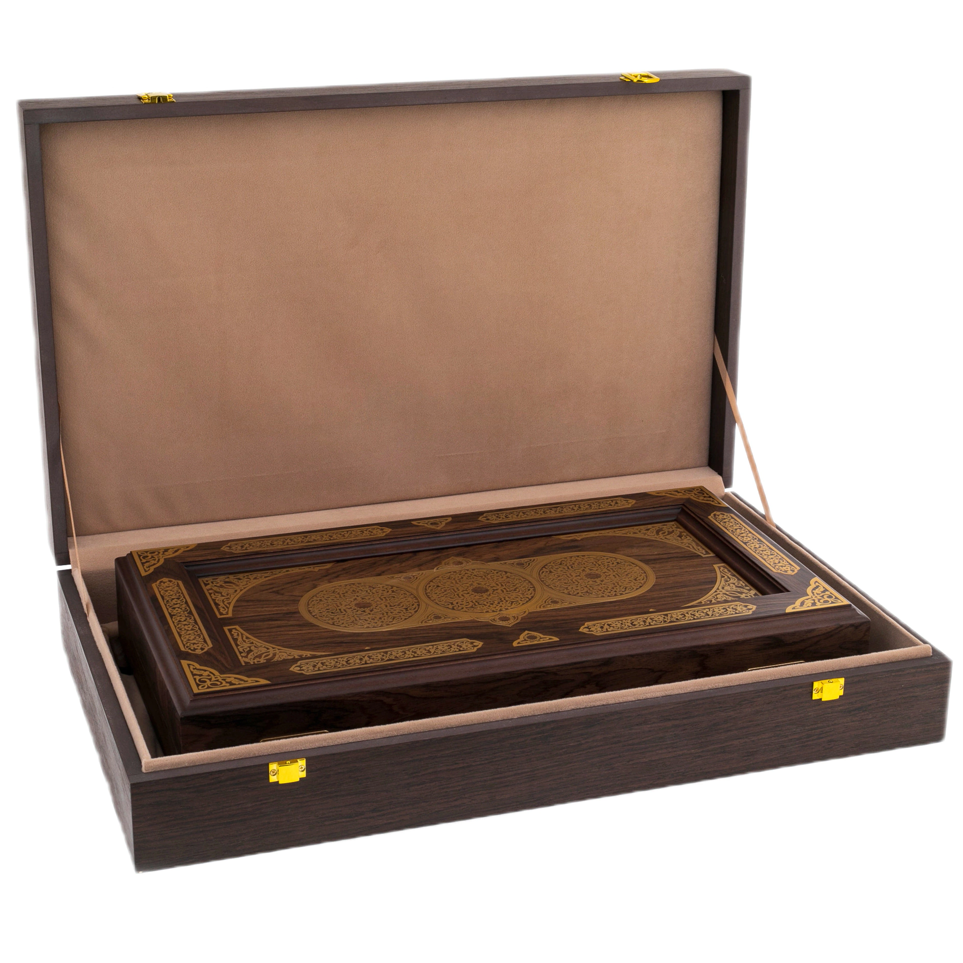 Особое внимание уделено технике исполнения: орнамент выполнен методом точной гравировки и инкрустации, благодаря чему рисунок выглядит чётким и насыщенным, а древесина сохраняет естественную выразительность. Внутреннее поле продумано до мелочей — каждая ячейка и дорожка оформлены с одинаковой тщательностью, создавая цельную композицию. Полированная поверхность подчёркивает текстуру дерева, а контраст светлых и тёмных элементов усиливает визуальную выразительность.