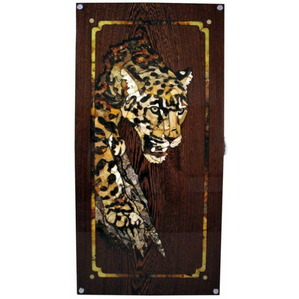 На внешней стороне игровой доски — мозаичное панно из янтаря с изображением волка. Игровое поле выдержано в том же стиле и дополнено волчьими следами. Каждый камень янтарной мозаики подобран по цвету, размеру и рисунку и гармонично смотрится на темном фоне. Игра света в кусочках янтаря создает ощущение движения — кажется, что дикий зверь замер лишь на мгновение, но в любой момент готов к прыжку. Благодаря потрясающей реалистичности мозаика напоминает картину, написанную с натуры.