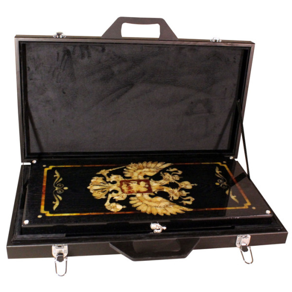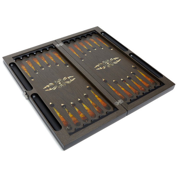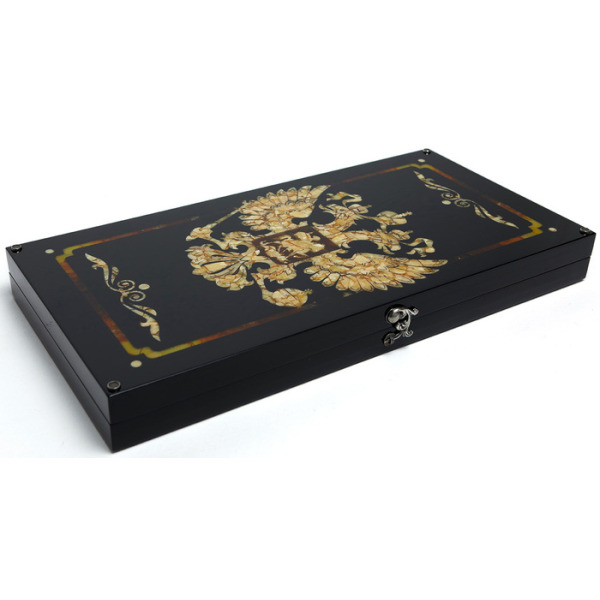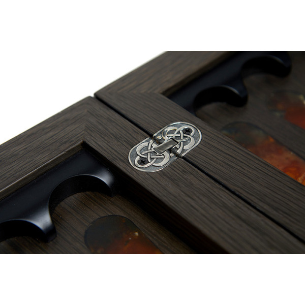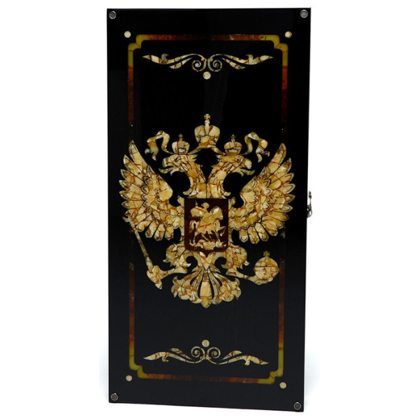 Аристократичные нарды из темного дерева украшены янтарными узорами, выполненными в стиле Ковровской мозаики. На внешней стороне игровой доски из кусочков янтаря выложен герб России. Он обрамлен янтарной рамкой и орнаментом. Игровое поле также декорировано узорами из кусочков янтаря, а фишки изготовлены из янтарного композита темных и светлых тонов и отделаны металлической чеканкой.