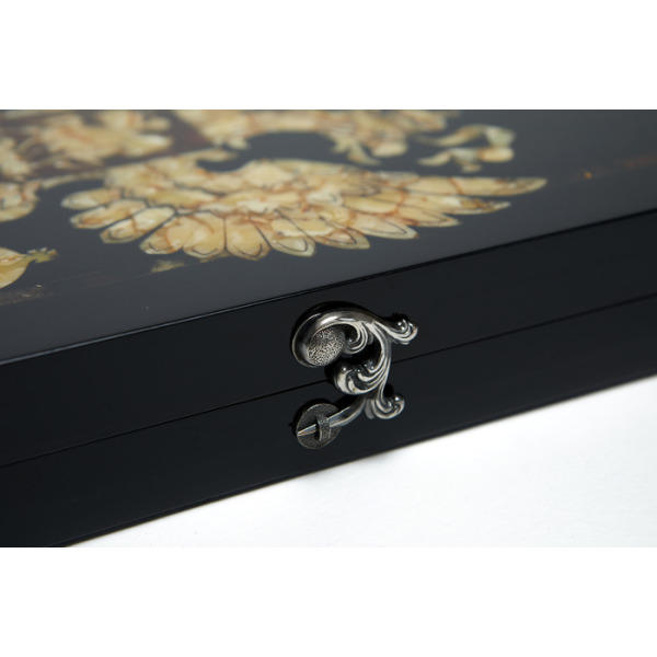 Комбинация черного цвета и теплой янтарной палитры выглядит очень гармонично. Для герба использовались камни желто-лимонных, восковых и коричневых оттенков, а геральдический щит смотрится ярко и колоритно в коньячных тонах. В узоры гармонично вплетаются и зеленоватые камни. Янтарные нарды выглядят как произведение искусства, поэтому в качестве подарка они великолепны. Подобные вещи становятся фамильной драгоценностью и передаются по наследству. Гравировка на шильде с личной монограммой подчеркнет высокий статус владельца этого раритета.