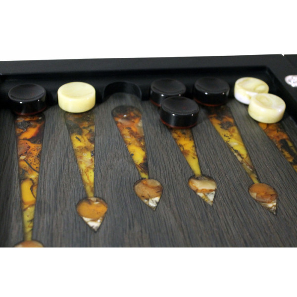 Нарды из мореного дуба и янтаря "Волк"Нарды из мореного дуба и янтаря "Волк"Нарды из мореного дуба выполнены вручную мастерами янтарно-краснодеревной мануфактуры. Изделие инкрустировано янтарем в уникальной технике Ковровской мозаики, фишки изготовлены из янтарного композита светлого и темного цвета..