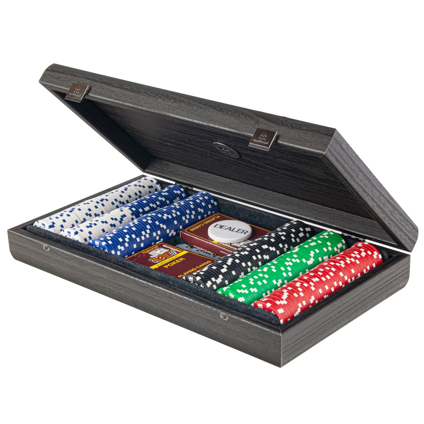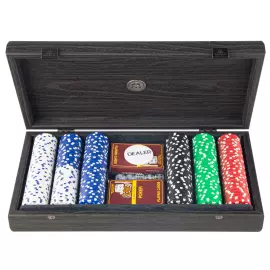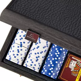 Покерный набор в деревянном футляре из дерева, верхняя часть которого покрыта черной кожей Этот роскошный набор для покера изготовлен вручную из дерева и имеет бархатный поднос внутри. В комплект входят 300 высококачественных покерных фишек по 11,5 г и 2 комплекта игральных карт — лучший подарок для серьезного игрока!