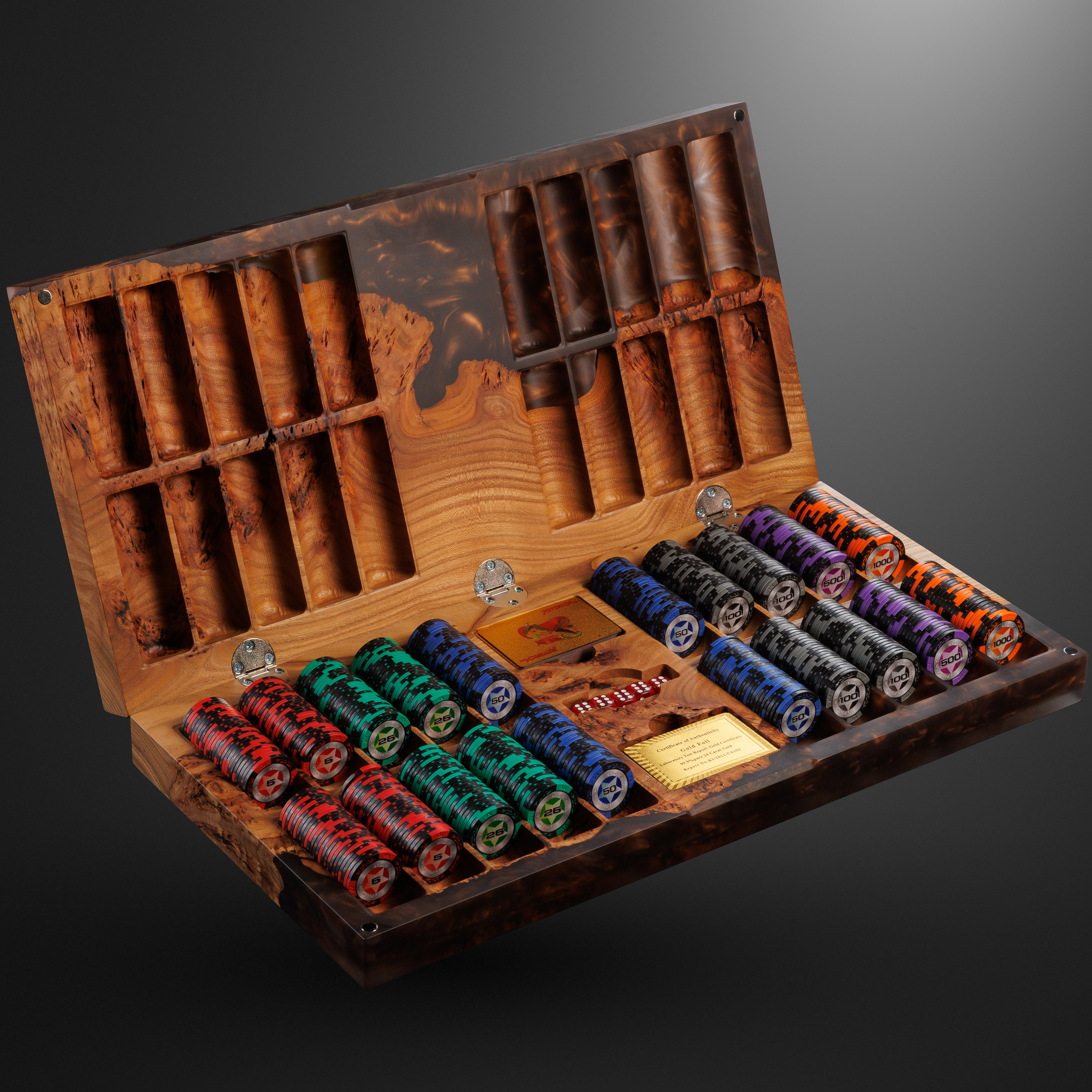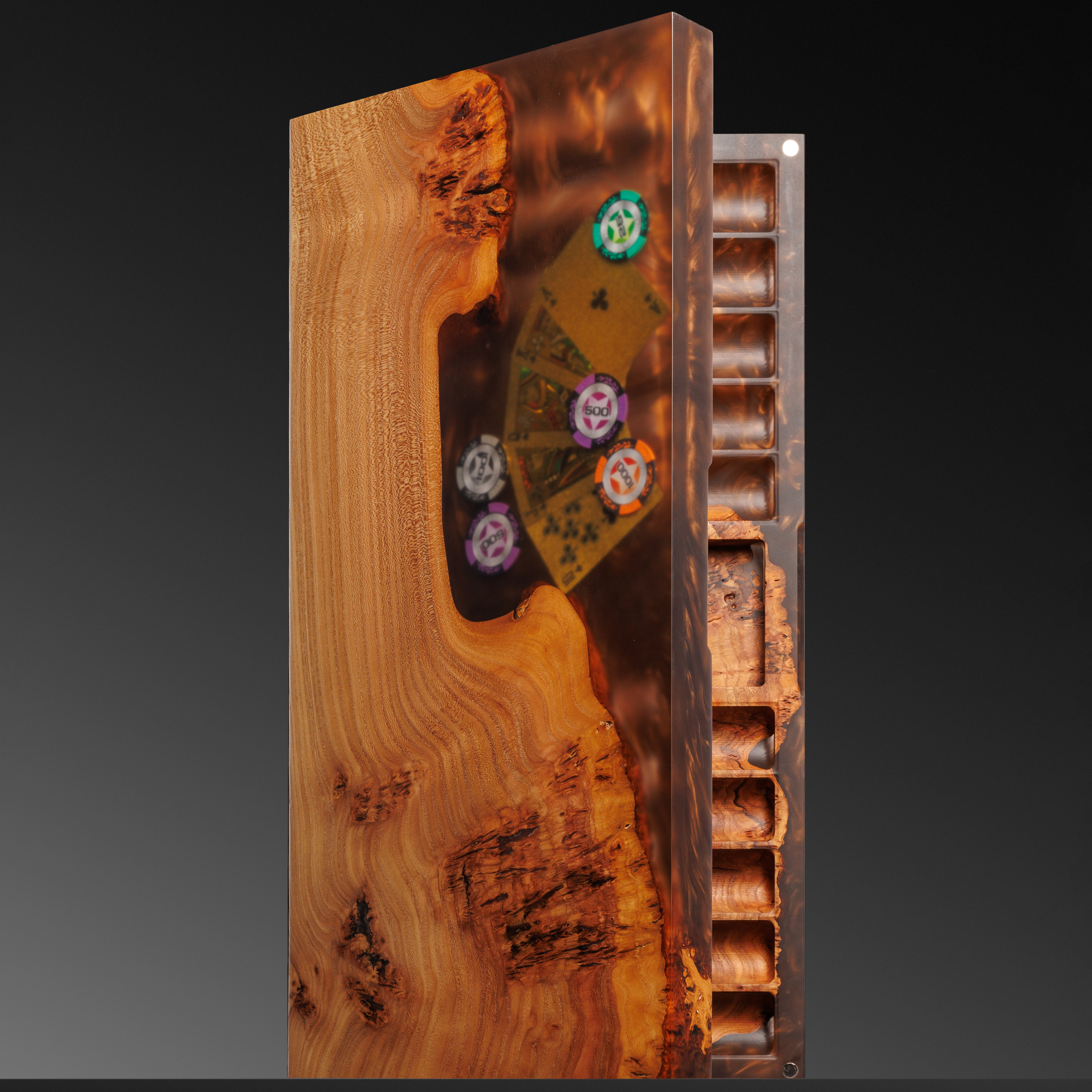 Покерный набор из карагача и эпоксидной смолы — предмет, в котором азарт встречается с эстетикой высшего класса. Редкий по красоте карагач с характерным узором капа и живыми волокнами дерева создает основу футляра, дополненного смолой с мерцающими переливами. Массивная конструкция не просто впечатляет весом и текстурой, но и организует всё необходимое для игры: отсек под фишки, карты, кости и жетоны продуман до мелочей. Каждое углубление точно вырезано, идеально подогнано и выведено вручную, подчёркивая премиальность набора.