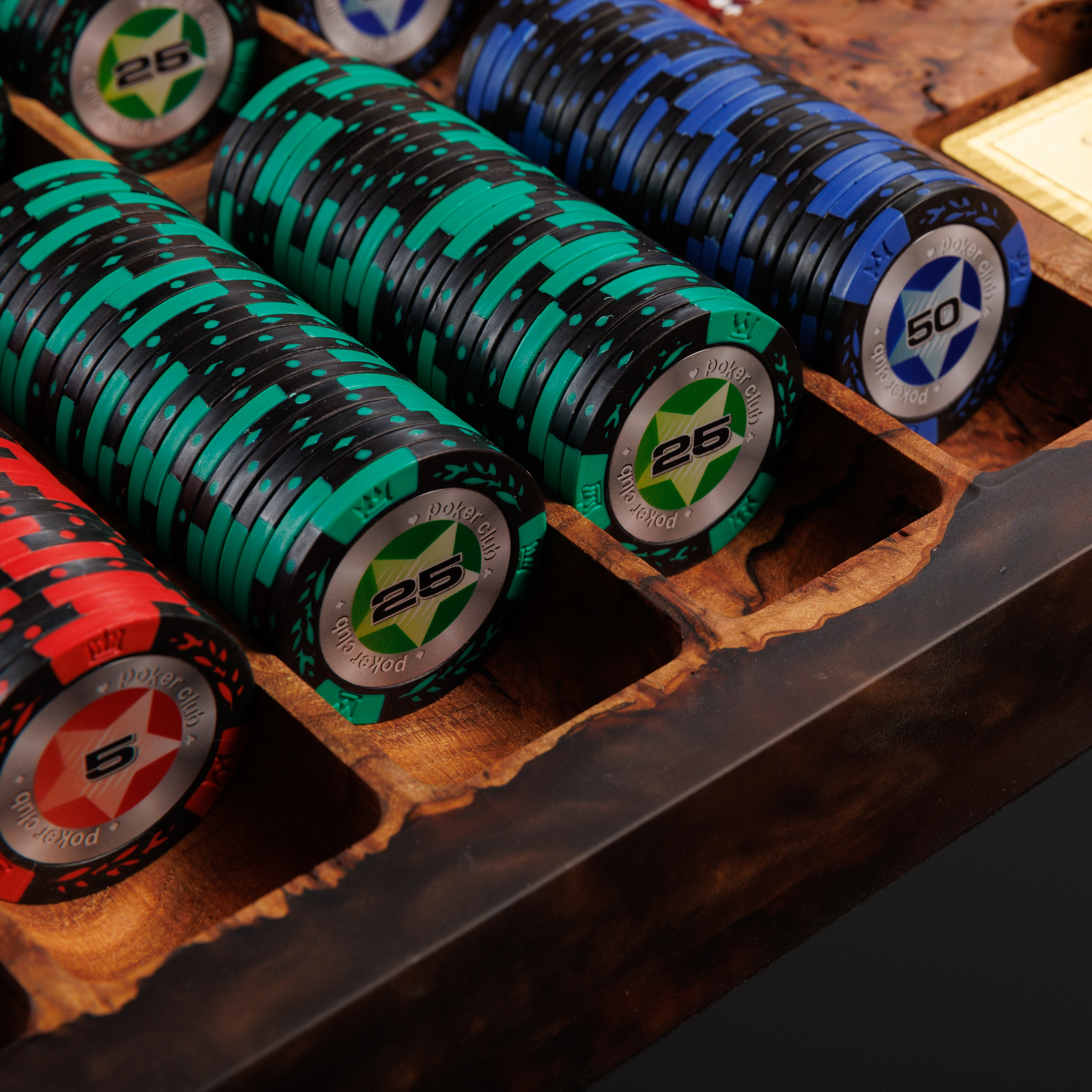 Фишки рассортированы по цветам и номиналам, а центр композиции венчают игральные колоды. Это не аксессуар для случайных игроков — это выбор тех, для кого стиль, статус и уважение к деталям идут рука об руку.