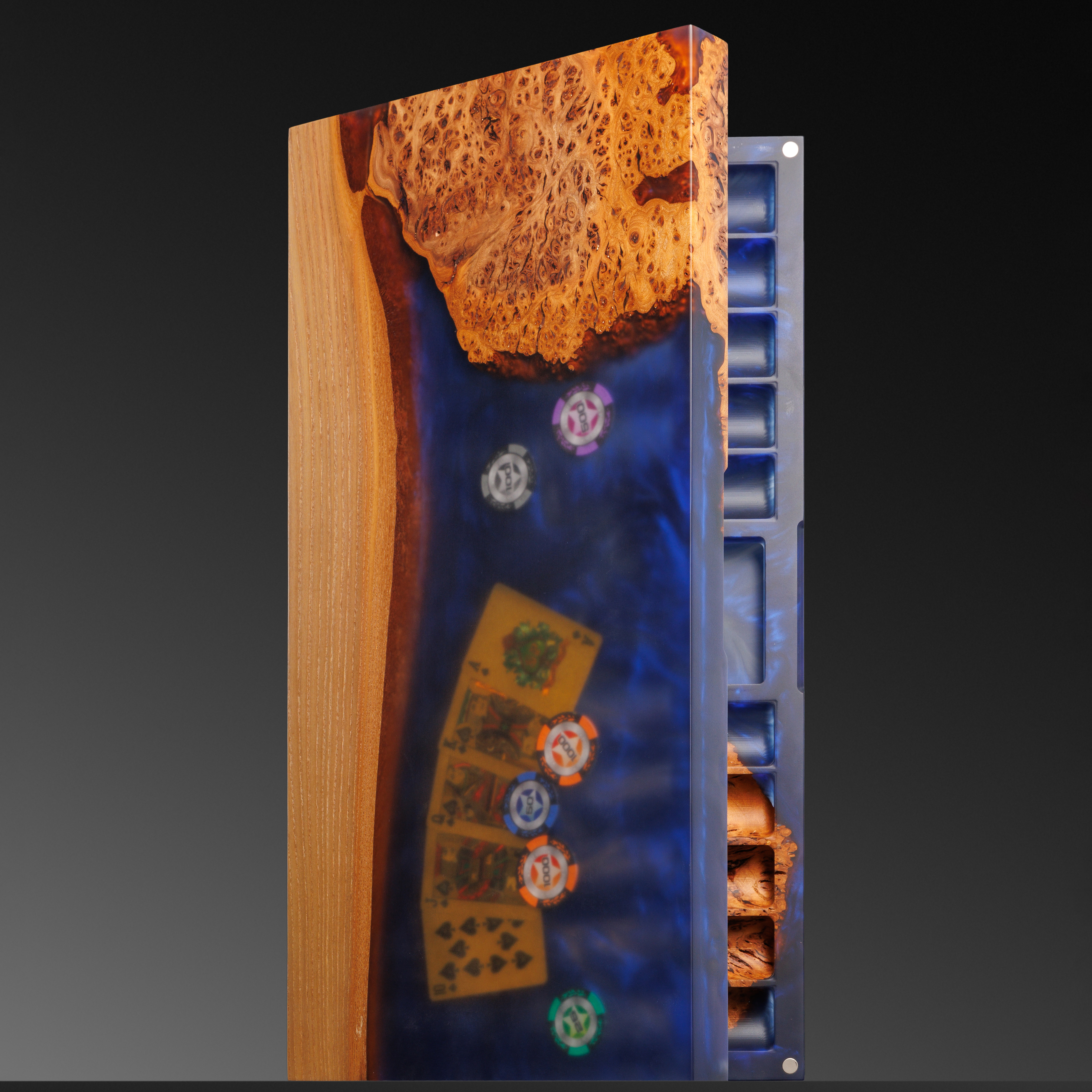 Покерный набор из карагача и эпоксидной смолы — предмет, в котором азарт встречается с эстетикой высшего класса. Редкий по красоте карагач с характерным узором капа и живыми волокнами дерева создает основу футляра, дополненного смолой с мерцающими переливами. Массивная конструкция не просто впечатляет весом и текстурой, но и организует всё необходимое для игры: отсек под фишки, карты, кости и жетоны продуман до мелочей. Каждое углубление точно вырезано, идеально подогнано и выведено вручную, подчёркивая премиальность набора.