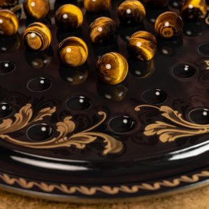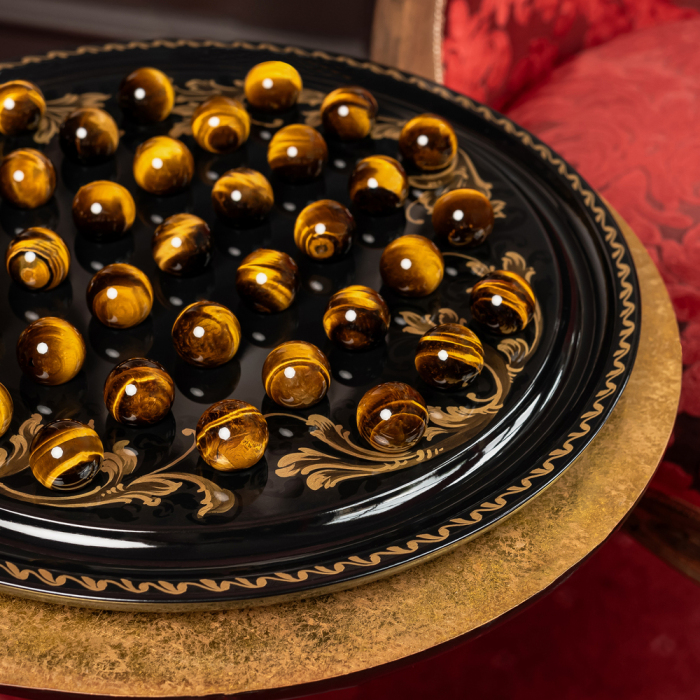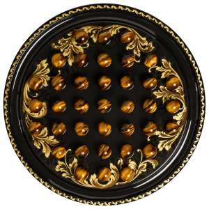 Игровые шары в наборе выполнены из камня тигровый глаз. Шелковые переливы минерала гармонируют с золотом росписи на игровом поле.