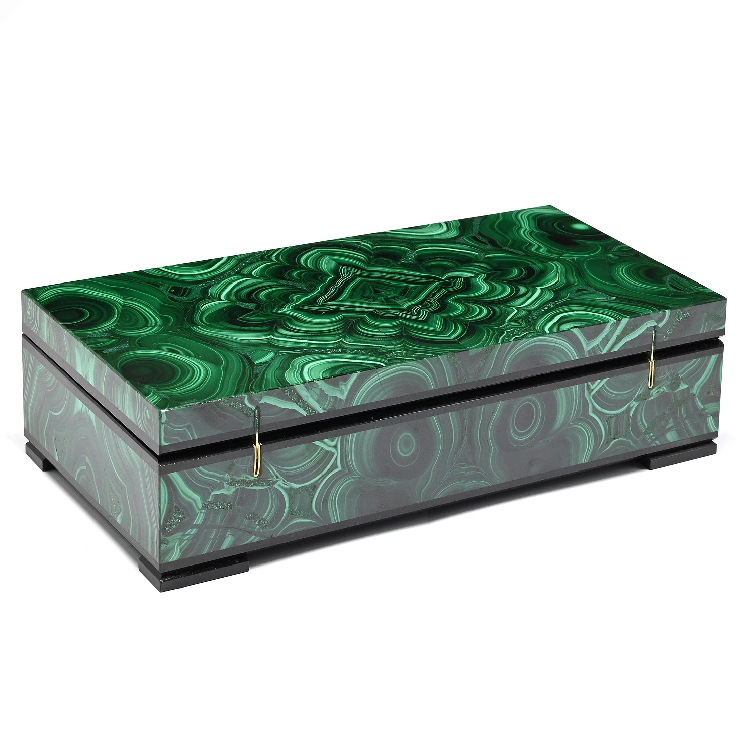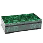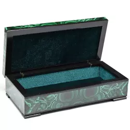 Изделие изготовлено из натурального малахита в сочетании с прочным основанием, обеспечивающим устойчивость и долговечность конструкции. Внутреннее пространство аккуратно отделано мягким бархатным материалом, который бережно защищает украшения, часы или денежные купюры. Крышка шкатулки плотно закрывается, сохраняя содержимое в безопасности и создавая ощущение завершённости формы.