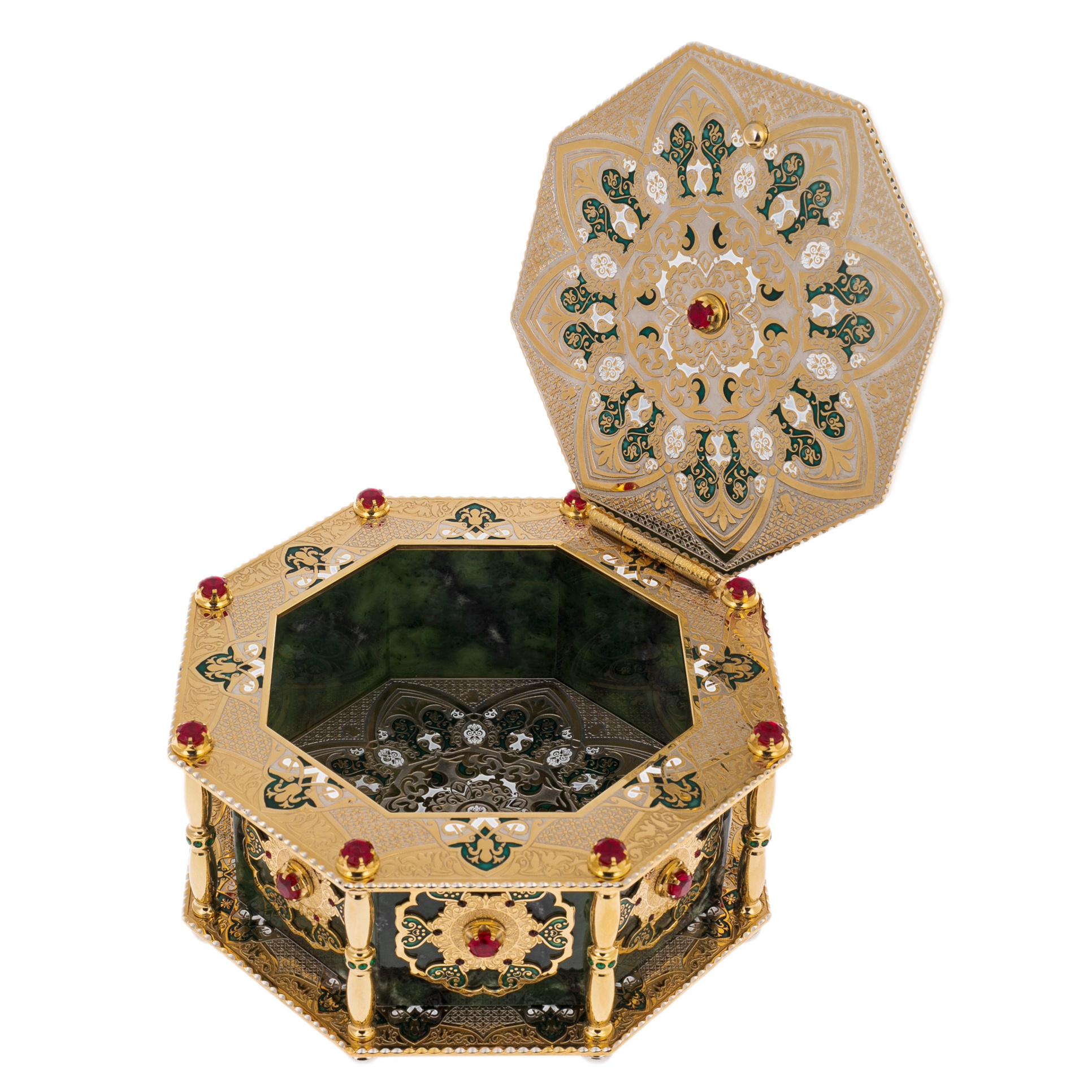 Основание из глубокого зелёного нефрита, камня императорских покоев, будто олицетворяет мощь земли, тайную силу природы, которая веками зачаровывала правителей и завоевателей. Зеленоватые прожилки, как застывшие капли первозданного времени, окутывают ларец мистической тишиной, намекая на бессмертие и вечное возрождение.