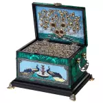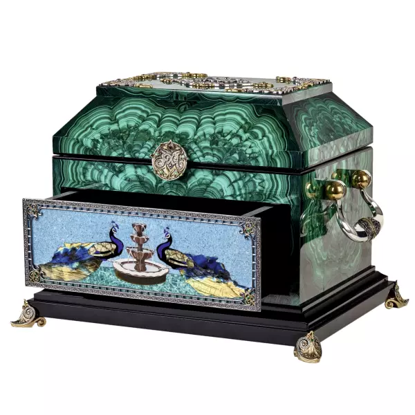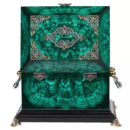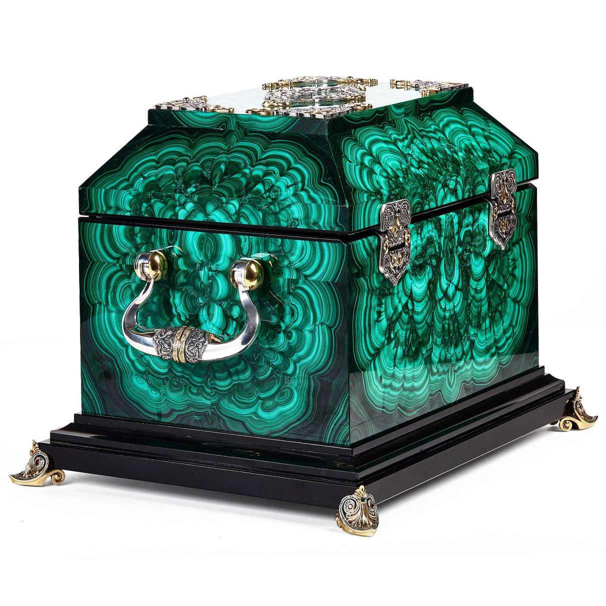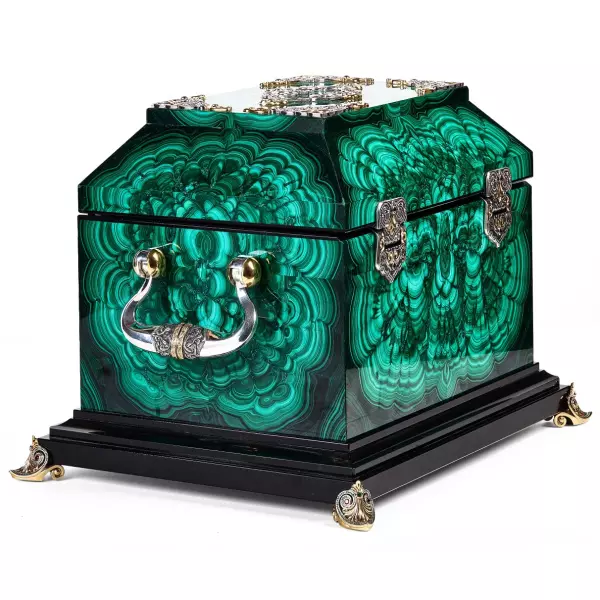 Ларец из малахита и серебра «Семейная сокровищница» — масштабное художественное произведение, в котором соединены ювелирное искусство, камнерезная традиция и глубокая символика, обращённая к теме семьи, преемственности и духовной связи поколений. Этот предмет не просто предназначен для хранения ценностей — он сам является ценностью, воплощающей память, историю и личное пространство, где сохраняется самое значимое.