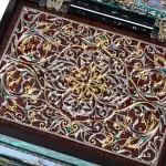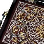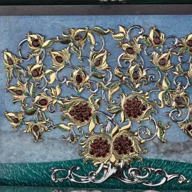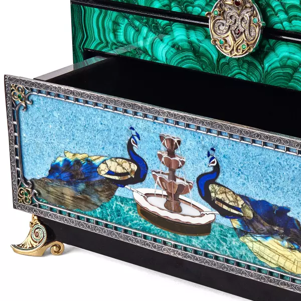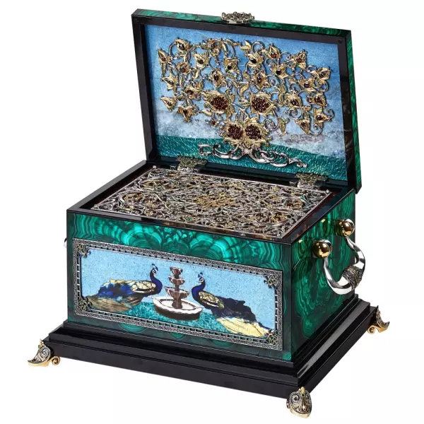 Композиция раскрывается как многослойный художественный рассказ. Внутренняя сторона крышки украшена гранатовым деревом — древним символом семьи, изобилия и продолжения рода. Плоды выполнены из натуральных гранатов, листья — из изумрудов, а сверкающие акценты создают бриллианты, придающие изображению глубину и живое мерцание. На внешней панели размещено мозаичное изображение павлинов у фонтана — символов красоты, достоинства и долголетия. Эта сцена, собранная из ярких самоцветов, придаёт ларцу особую декоративную выразительность и усиливает его символическое содержание.
