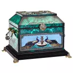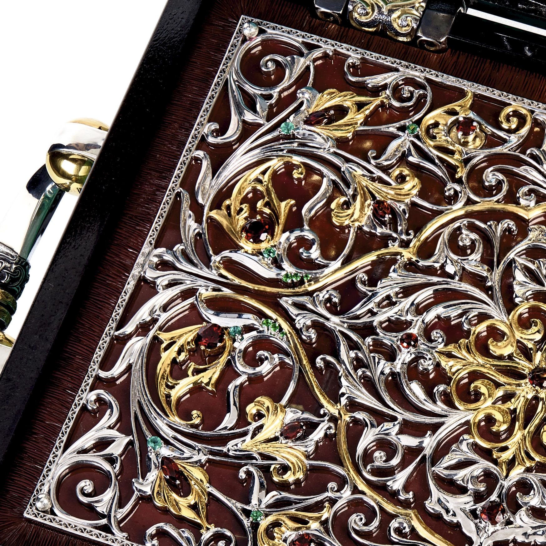 Конструкция дополнена ажурными серебряными элементами с позолотой, изящной фурнитурой и надёжным замком, фиксирующим крышку. Несмотря на внушительные размеры и вес, изделие сохраняет продуманную эргономику и может перемещаться благодаря прочной конструкции.