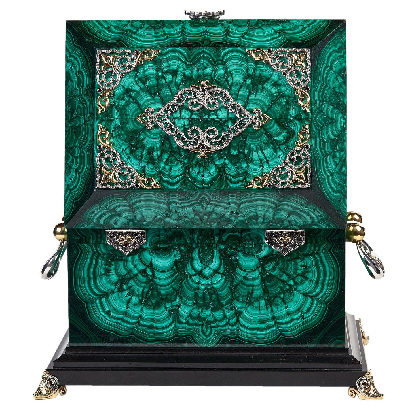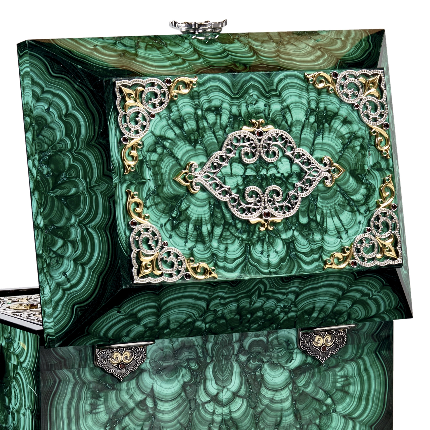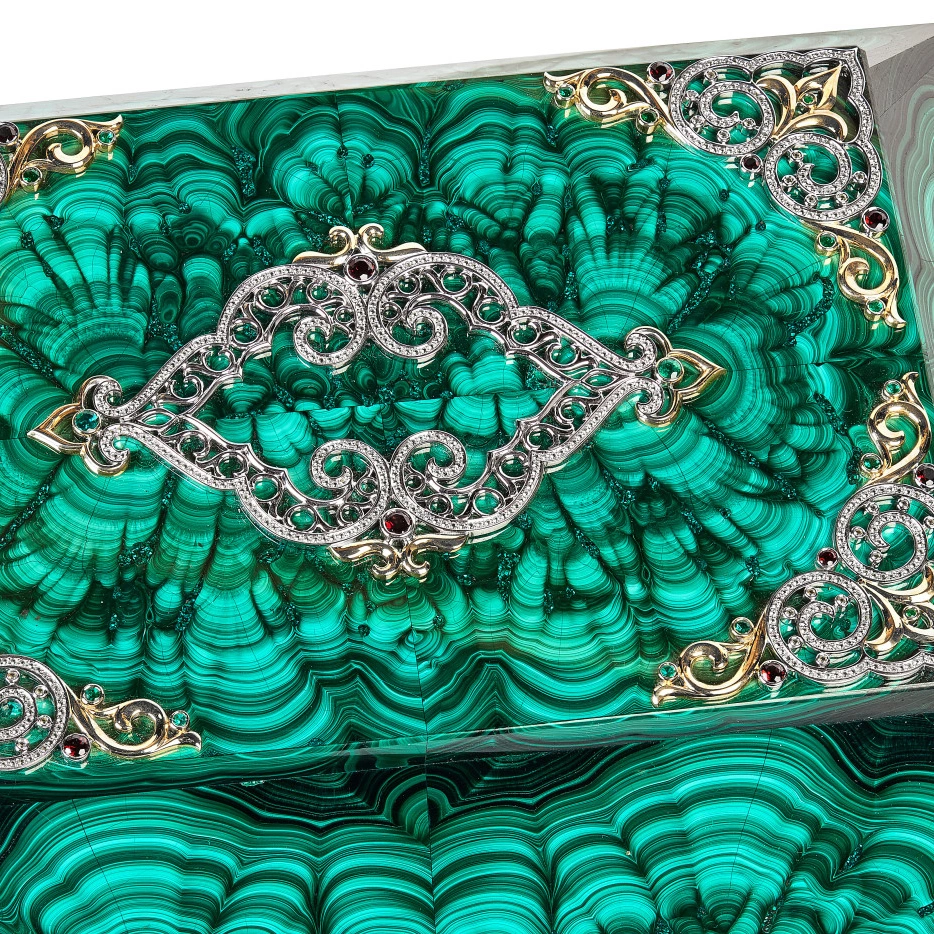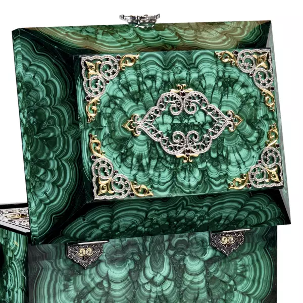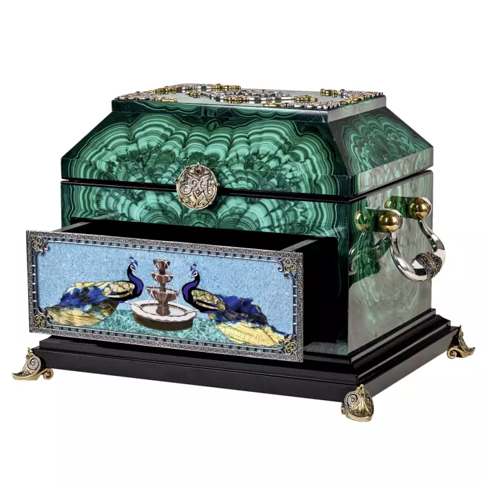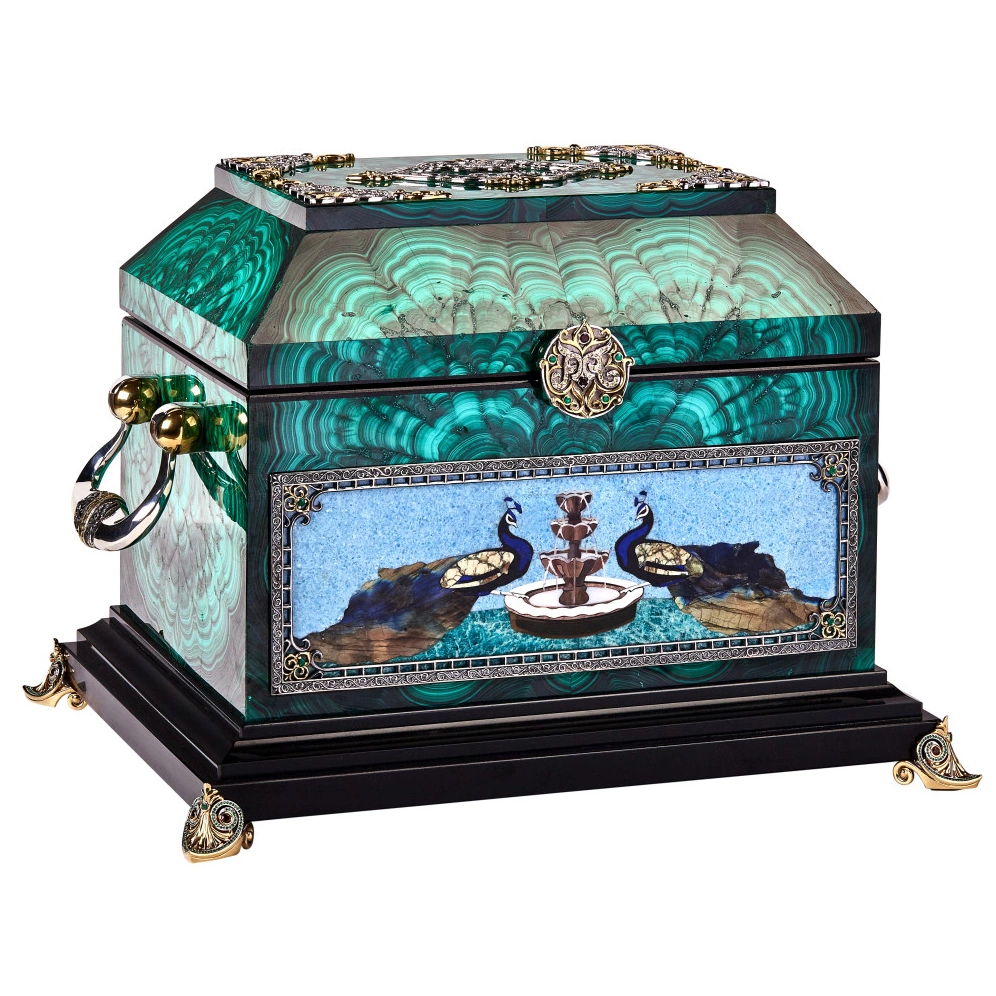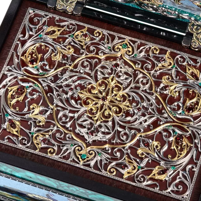 Основой композиции служит малахит — камень, издавна почитаемый в России и любимый русской знатью. Его насыщенный зелёный цвет символизирует плодородие, процветание и жизненную силу. Причудливый природный рисунок малахита, напоминающий кружево восточных узоров, усиливает ощущение живого материала, в котором каждая линия словно отражает переплетение человеческих судеб. Мастера, обладающие тонким чувством камня, выполнили ларец в технике мозаики с исключительной точностью, благодаря чему создаётся впечатление цельного монолита. Работа с малахитом требует высочайшего мастерства, опыта и художественного вкуса, что особенно заметно в плавности переходов и идеальной подгонке элементов.