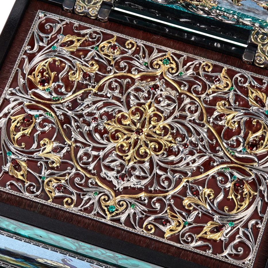 Под крышкой скрывается декоративный «ковёр», выполненный из яшмы, золота, серебра и драгоценных камней, дополненный реалистичной бахромой. Этот элемент не только завершает композицию, но и скрывает потайной механизм: незаметная кнопка открывает бархатный тайник, предназначенный для хранения самых ценных предметов. Такая деталь превращает ларец в личное пространство, доступ к которому имеет только его владелец.