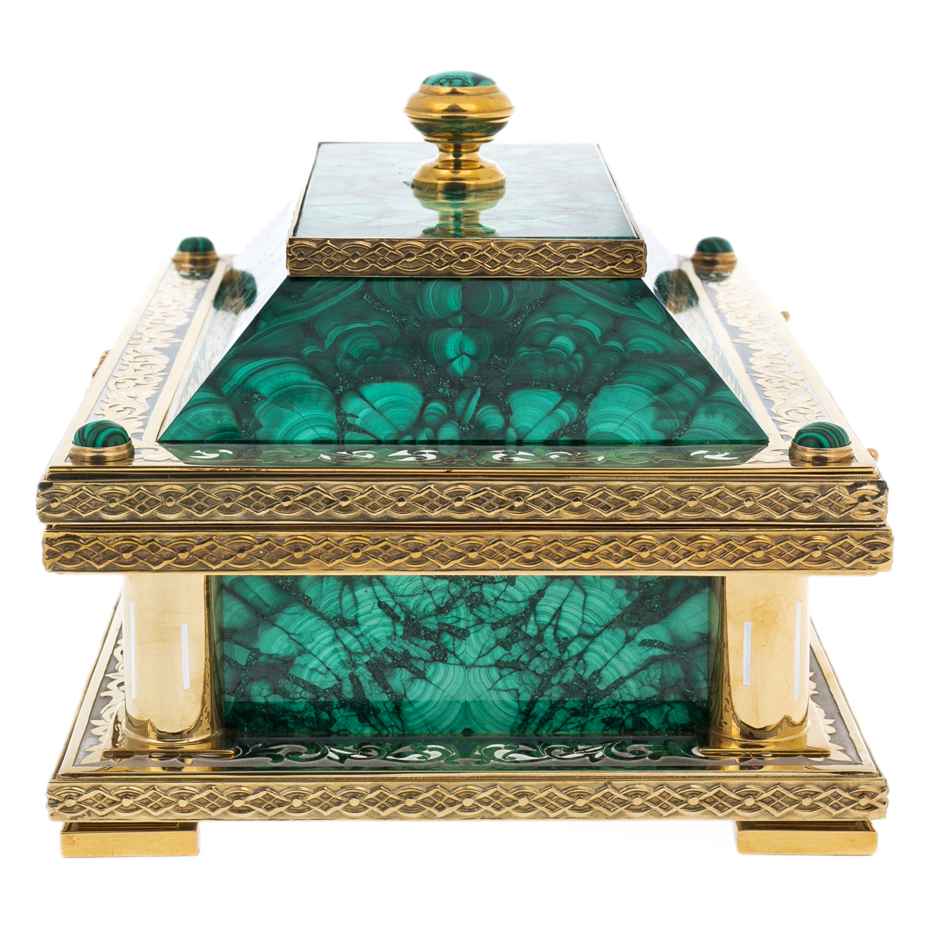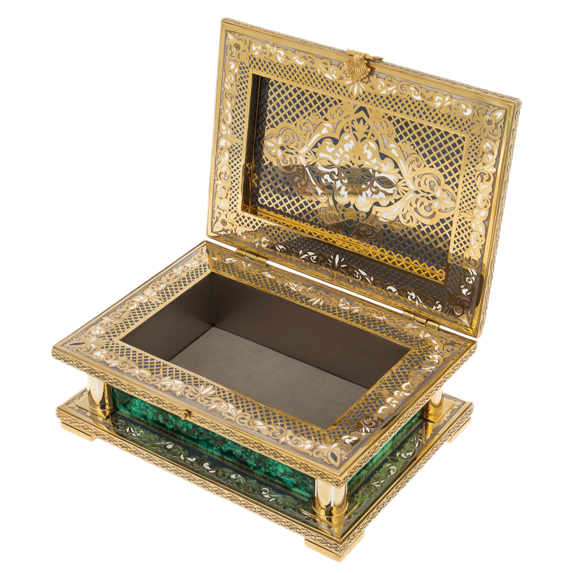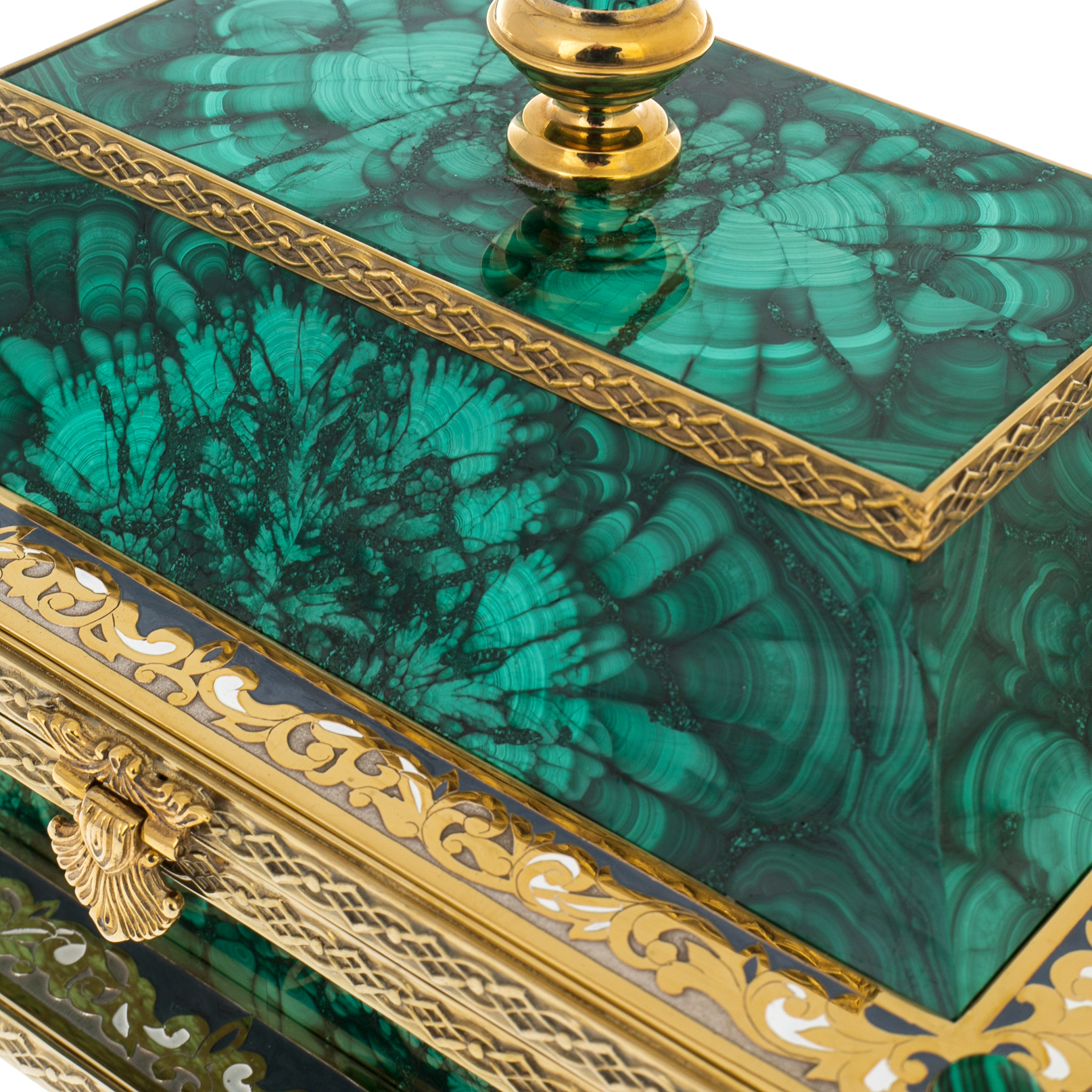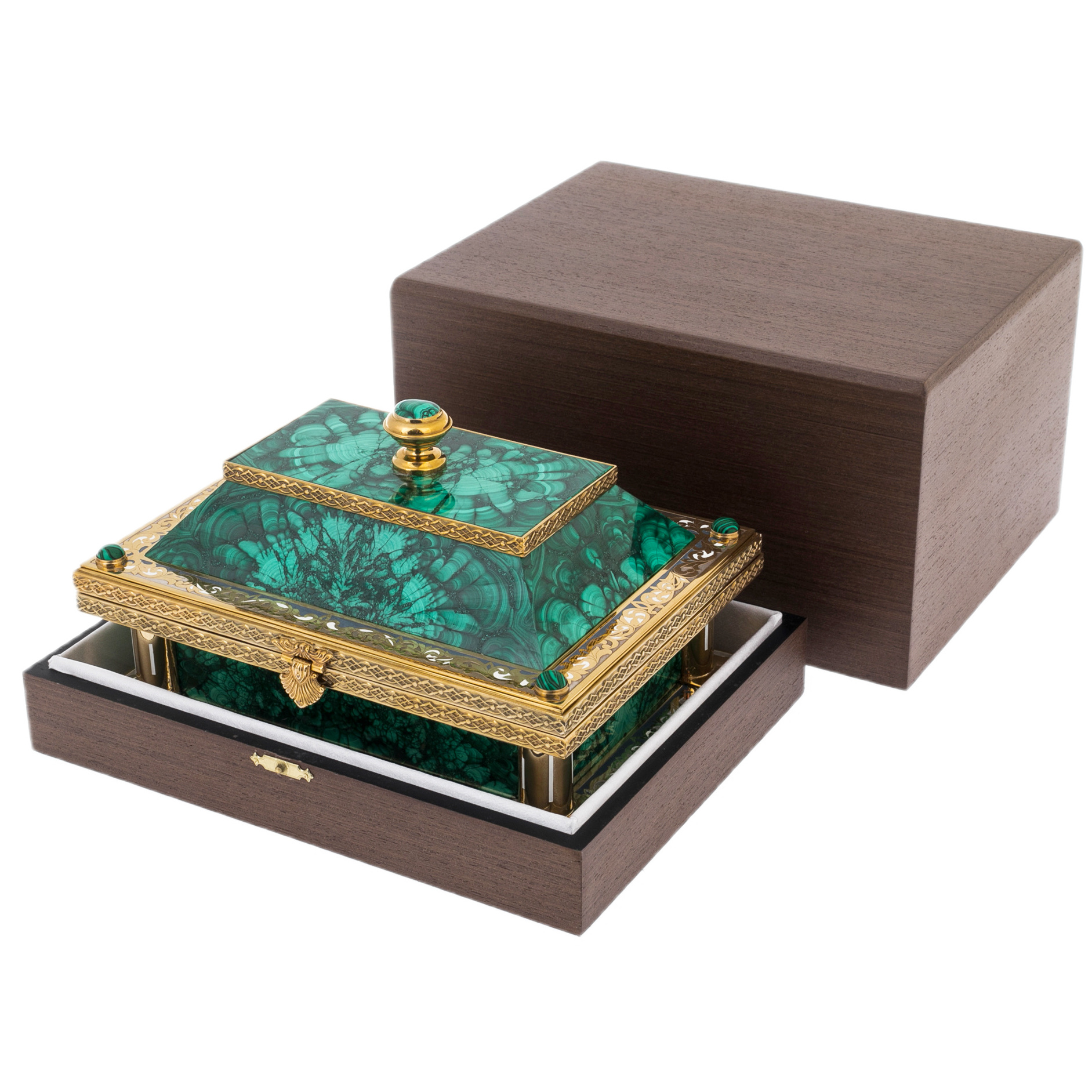 Элегантные формы ларца, обрамленные изысканными золотыми элементами, рассказывают о благородстве и величии. Золото, сверкающее на солнце, символизирует богатство и процветание, в то время как малахит, обладая целебными свойствами и мистической аурой, добавляет ларцу защиты и силы. Этот контраст, соединяющий в себе мощь природы и искусство человека, создает гармонию, способную поддержать владельца ларца в любых начинаниях — словно древний страж, хранящий самые сокровенные мечты.