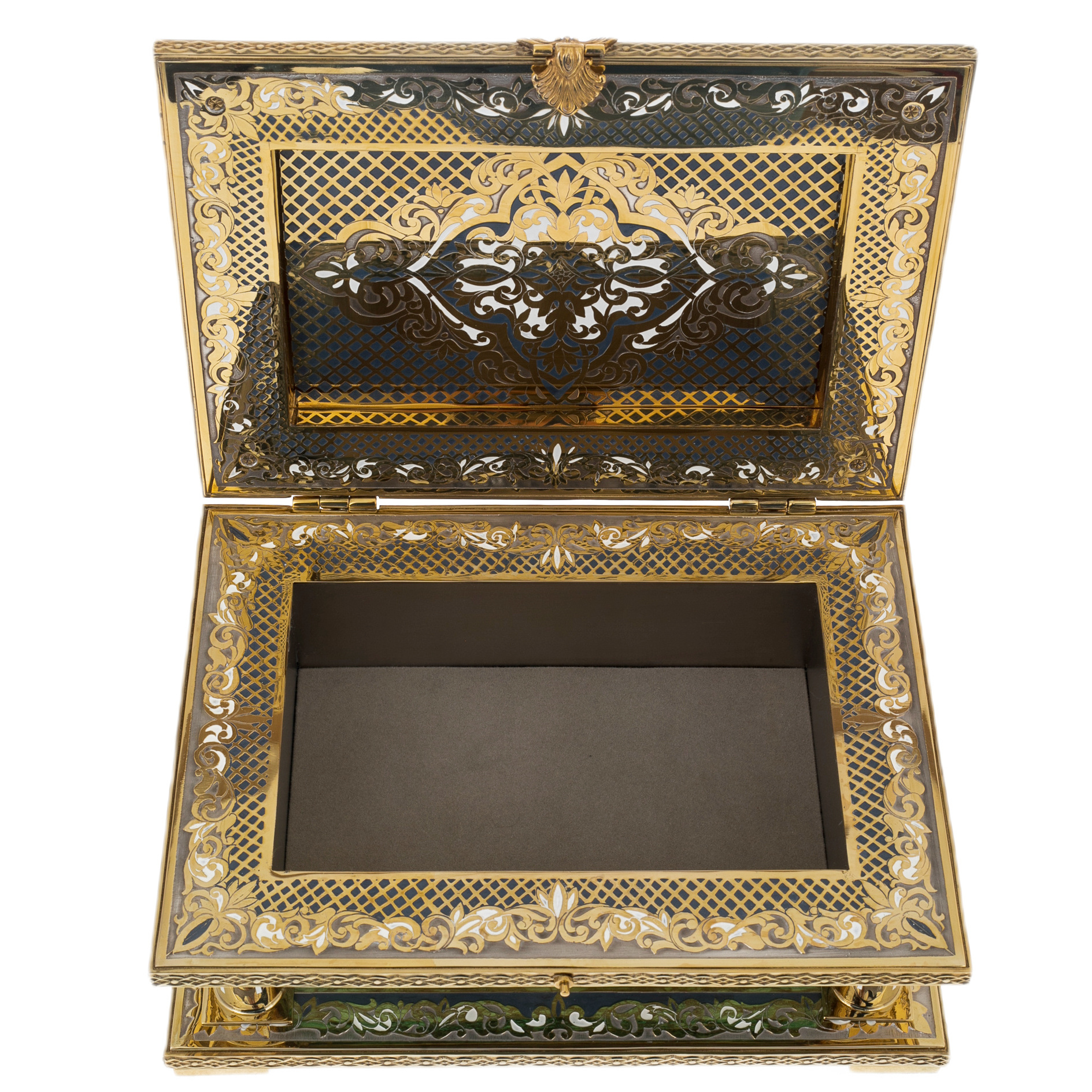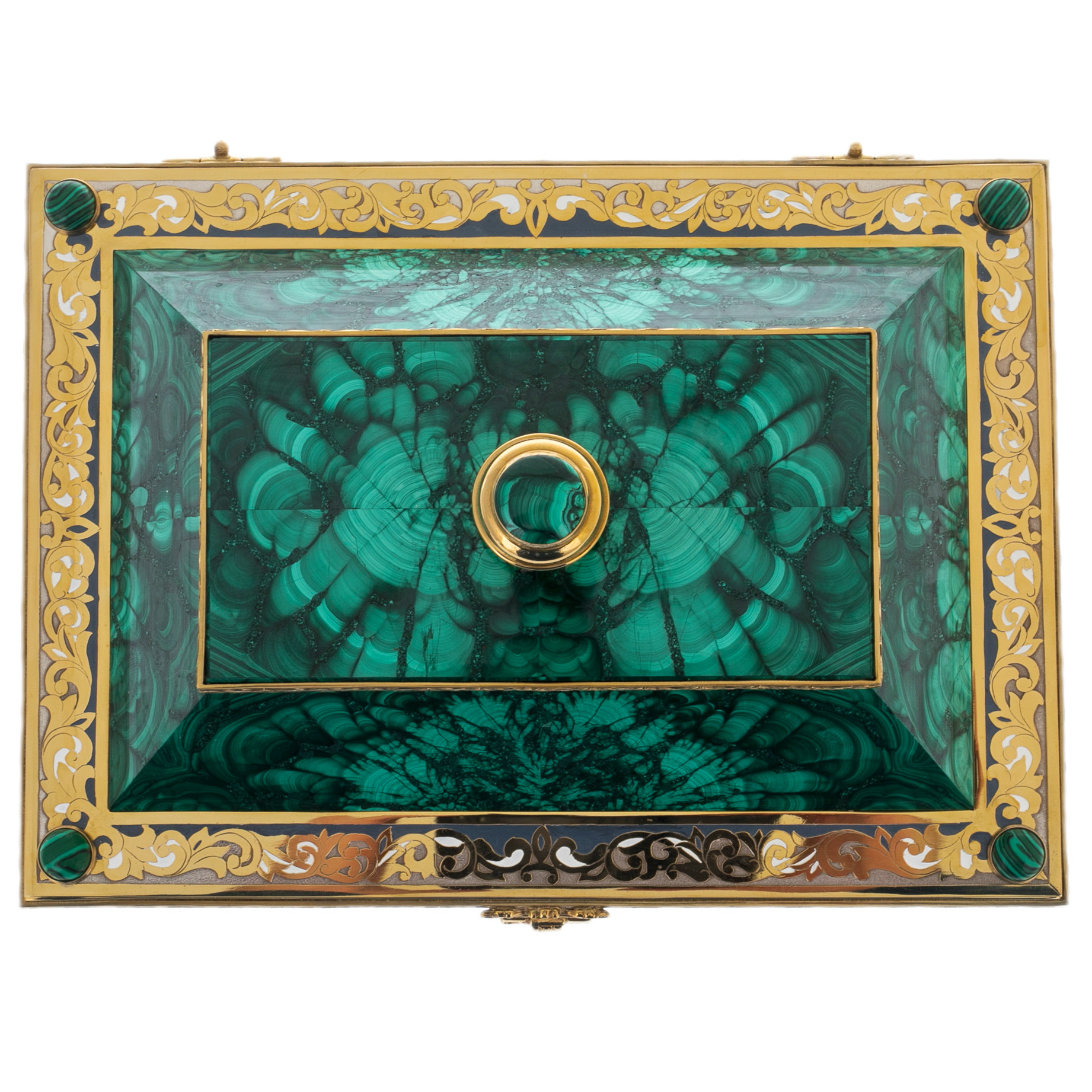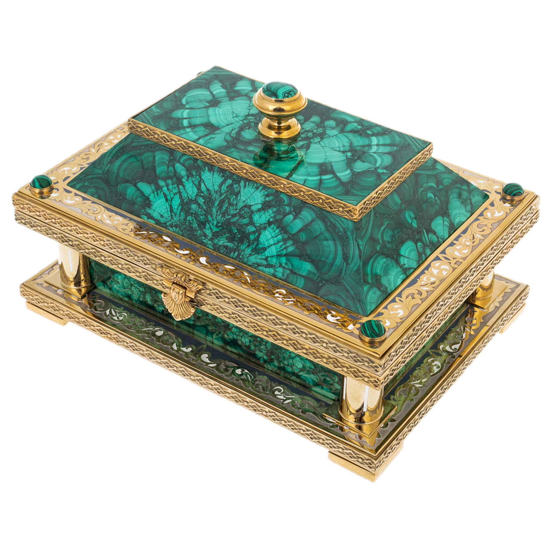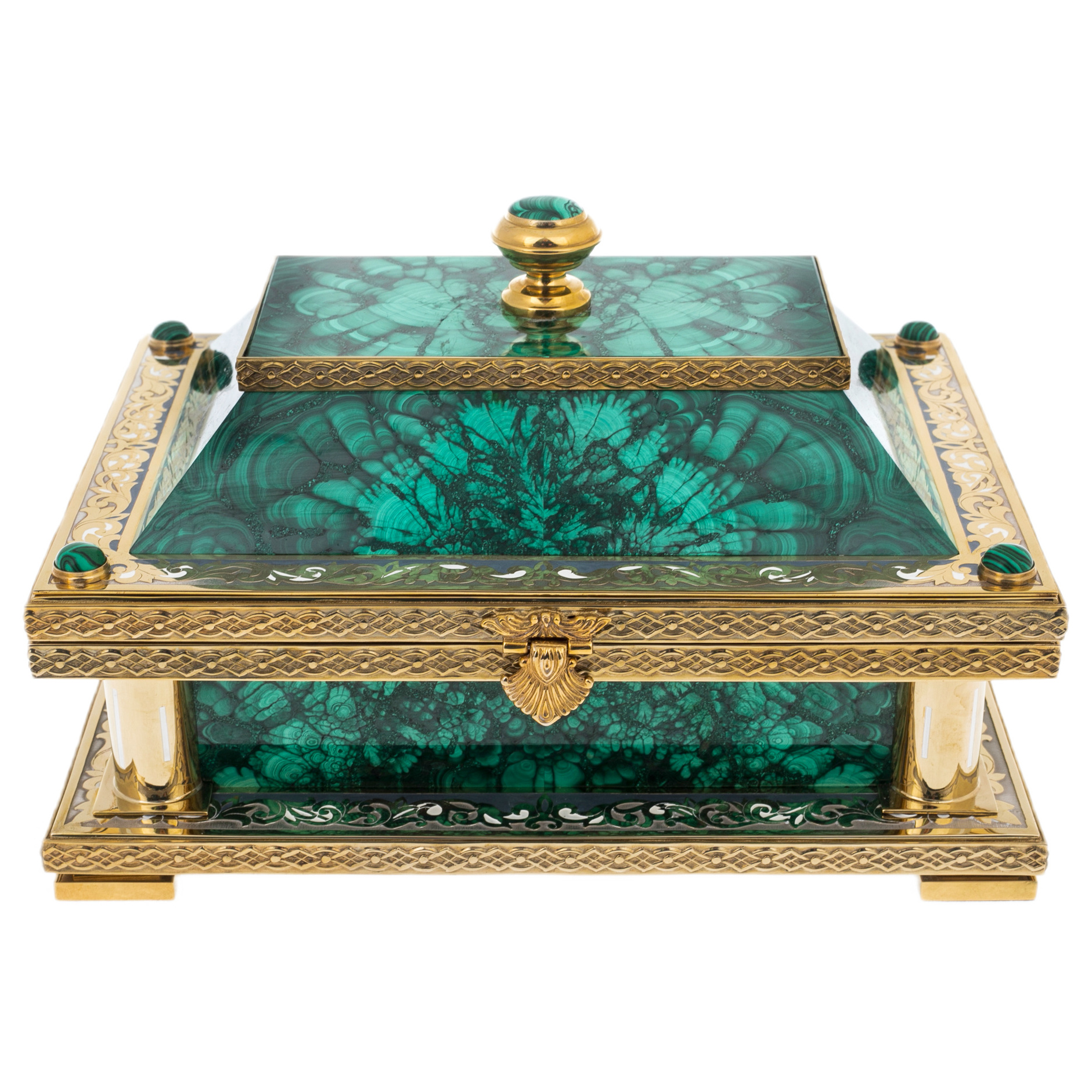 Элегантные формы ларца, обрамленные изысканными золотыми элементами, рассказывают о благородстве и величии. Золото, сверкающее на солнце, символизирует богатство и процветание, в то время как малахит, обладая целебными свойствами и мистической аурой, добавляет ларцу защиты и силы. Этот контраст, соединяющий в себе мощь природы и искусство человека, создает гармонию, способную поддержать владельца ларца в любых начинаниях — словно древний страж, хранящий самые сокровенные мечты.