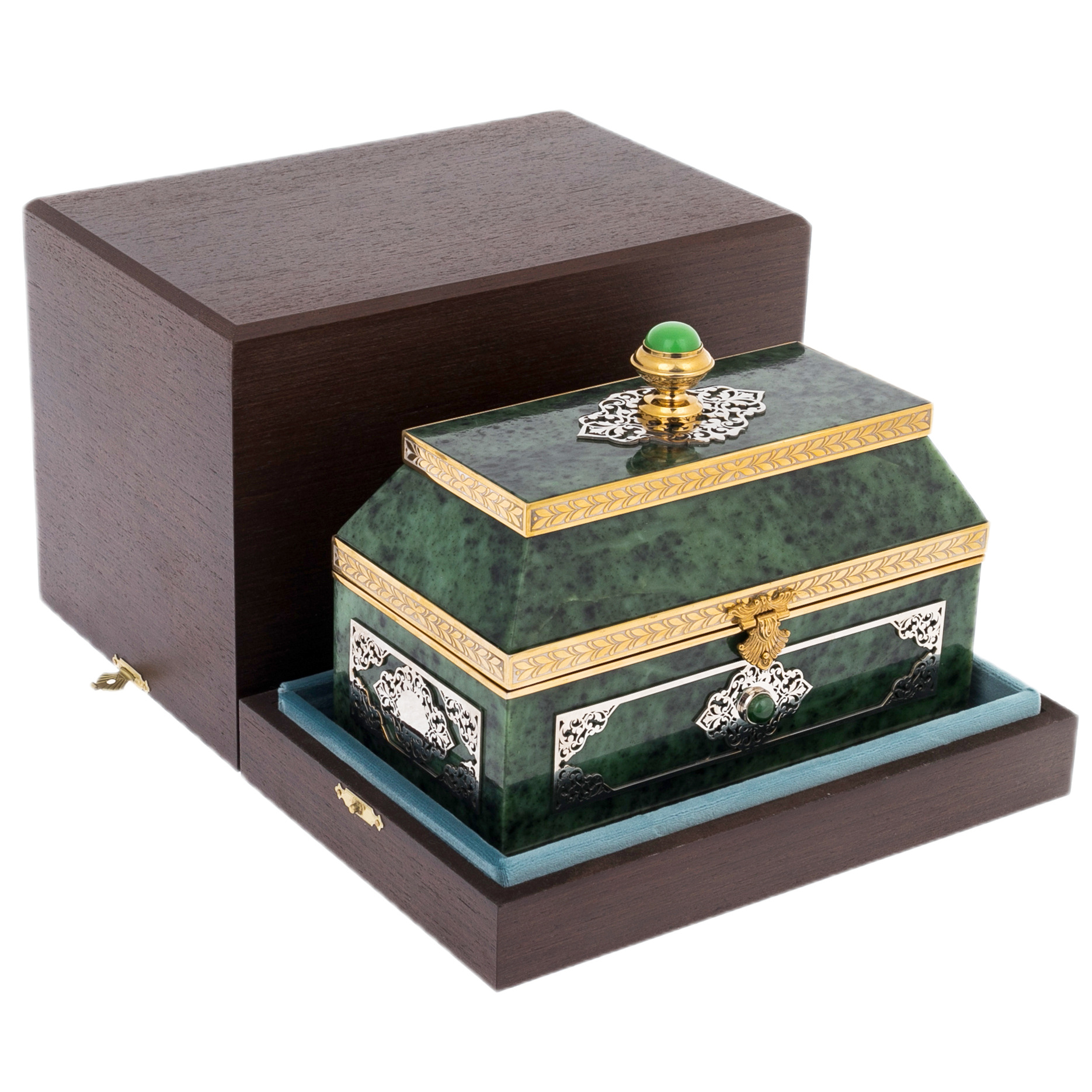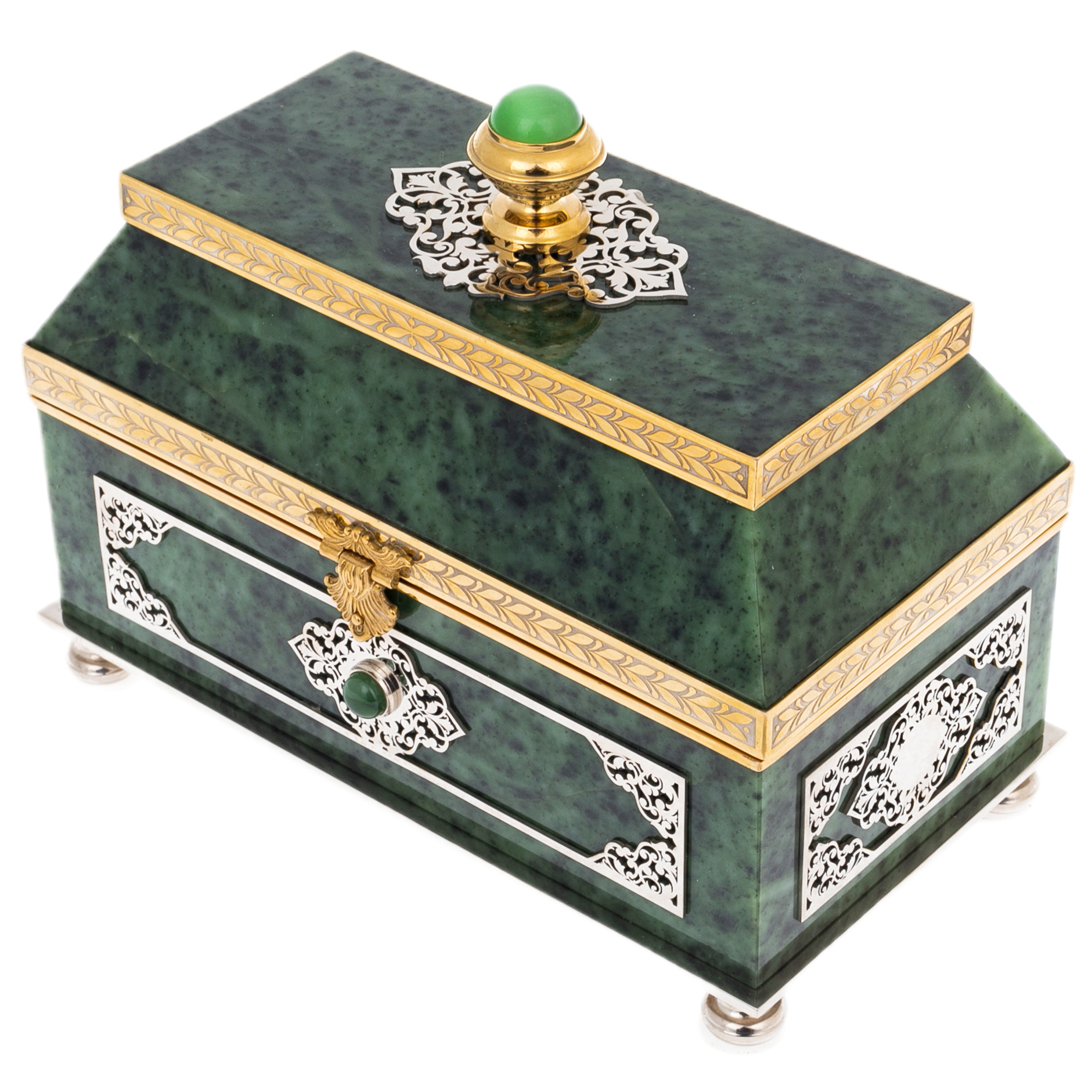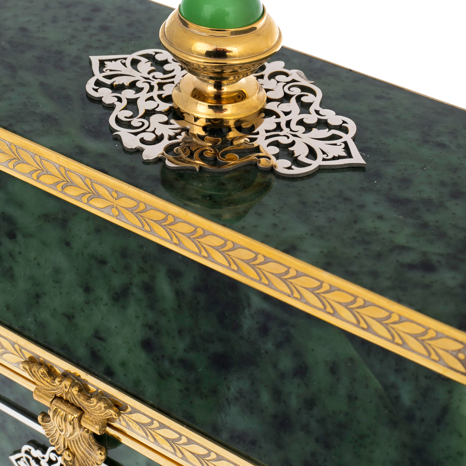 Ларец из нефрита «Царский» — исключительный предмет коллекционного уровня, выполненный в традициях императорской декоративной культуры. Корпус из природного нефрита глубокой зелени сформирован из идеально отшлифованных плит, отполированных до зеркального блеска. Крышка оформлена гранёным куполом, увенчанным нефритовым кабошоном, оправленным в золочёную тумбу, дополненную тончайшим ажуром ручной работы. Этот акцент уравновешивает декоративная вставка на передней панели — та же форма, тот же камень, то же ощущение завершённой композиции.