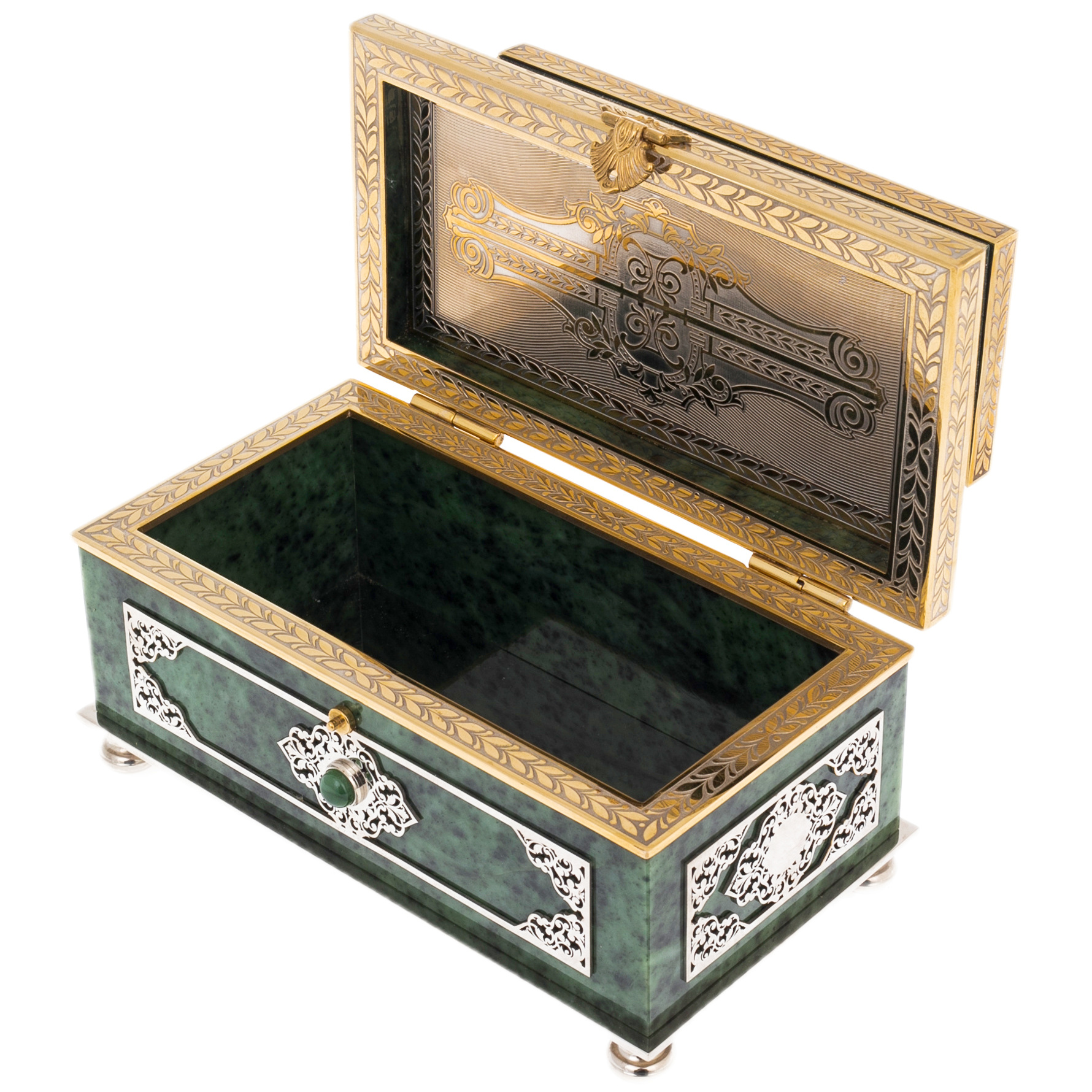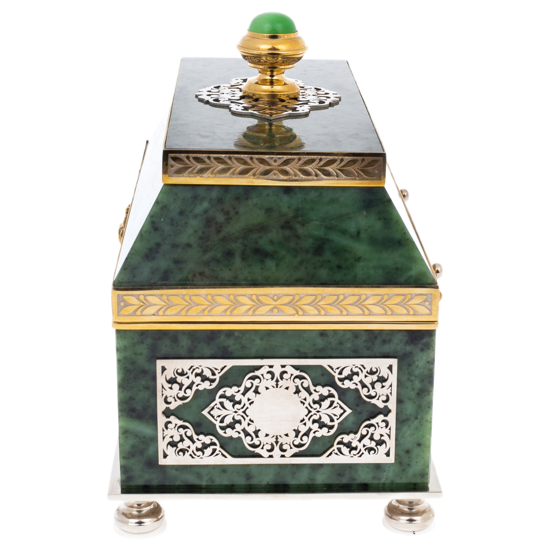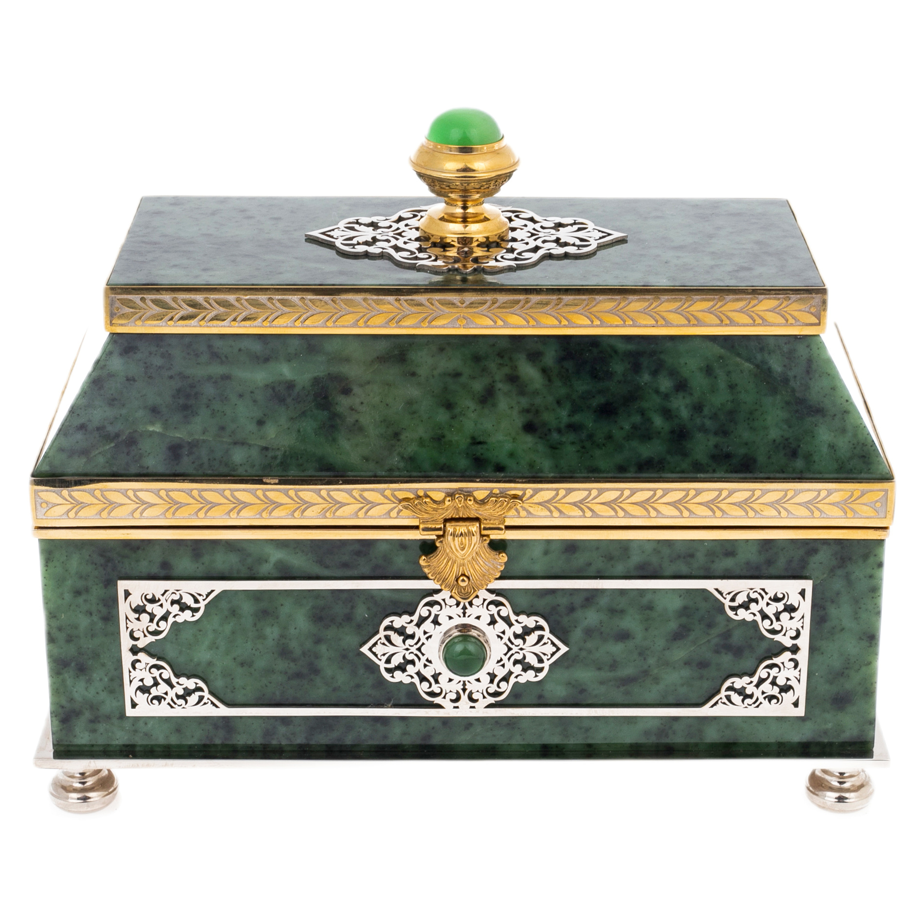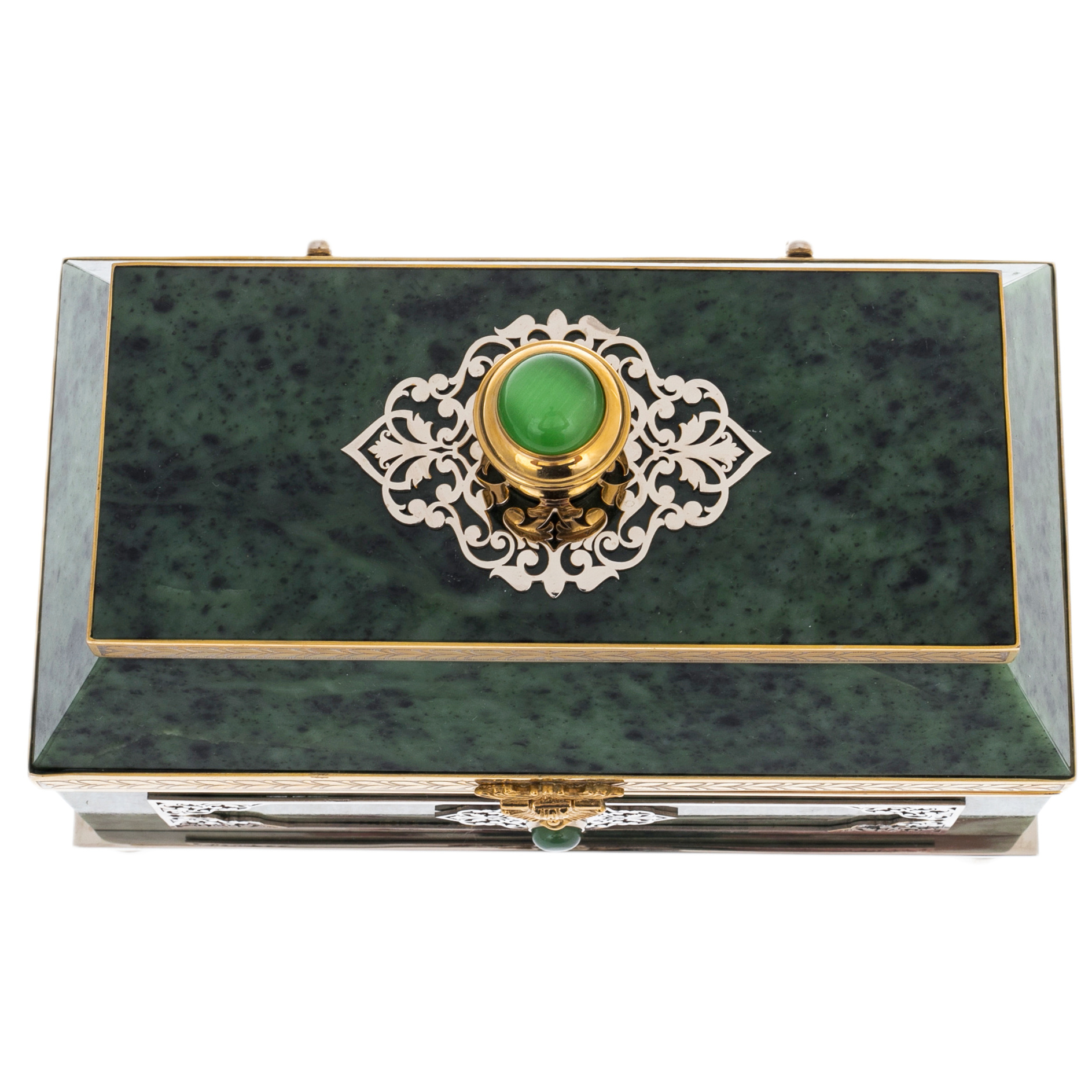 Ларец из нефрита «Царский» — исключительный предмет коллекционного уровня, выполненный в традициях императорской декоративной культуры. Корпус из природного нефрита глубокой зелени сформирован из идеально отшлифованных плит, отполированных до зеркального блеска. Крышка оформлена гранёным куполом, увенчанным нефритовым кабошоном, оправленным в золочёную тумбу, дополненную тончайшим ажуром ручной работы. Этот акцент уравновешивает декоративная вставка на передней панели — та же форма, тот же камень, то же ощущение завершённой композиции.
