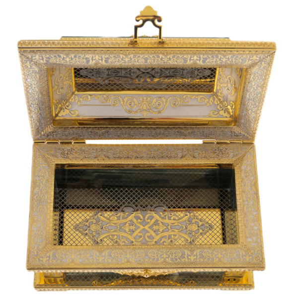 Шкатулка хранится в солидном деревянном кейсе на шелковой драпировке.