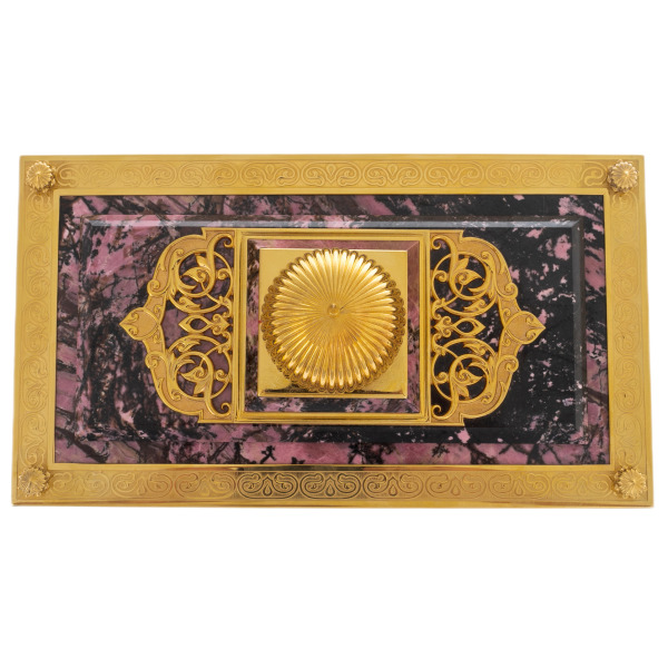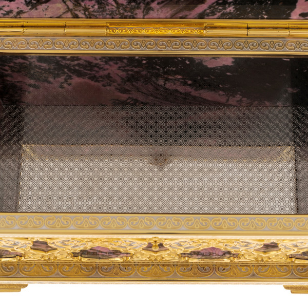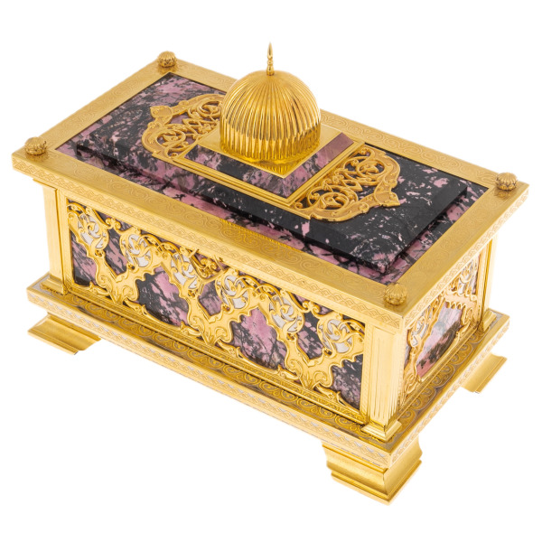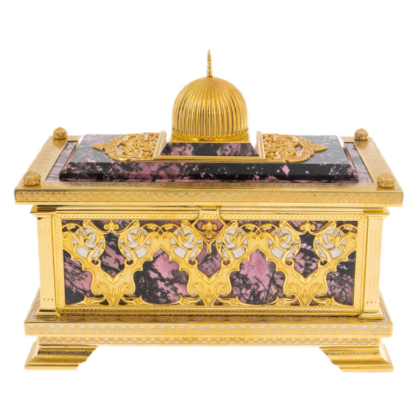 Ларец "Сокровищница" от мастеров Златоуста — это не просто предмет для хранения, а истинный символ власти и наследия, передаваемого из поколения в поколение. Созданный из благородного родонита, этот ларец воплощает в себе гармонию природного совершенства и искусства, превратившись в шедевр, достойный украшать самые изысканные интерьеры. Его величественный вид подчеркивает статус владельца, отражая его стремление к сохранению и приумножению ценностей, будь то фамильные украшения, памятные фотографии, открытки или важные документы.