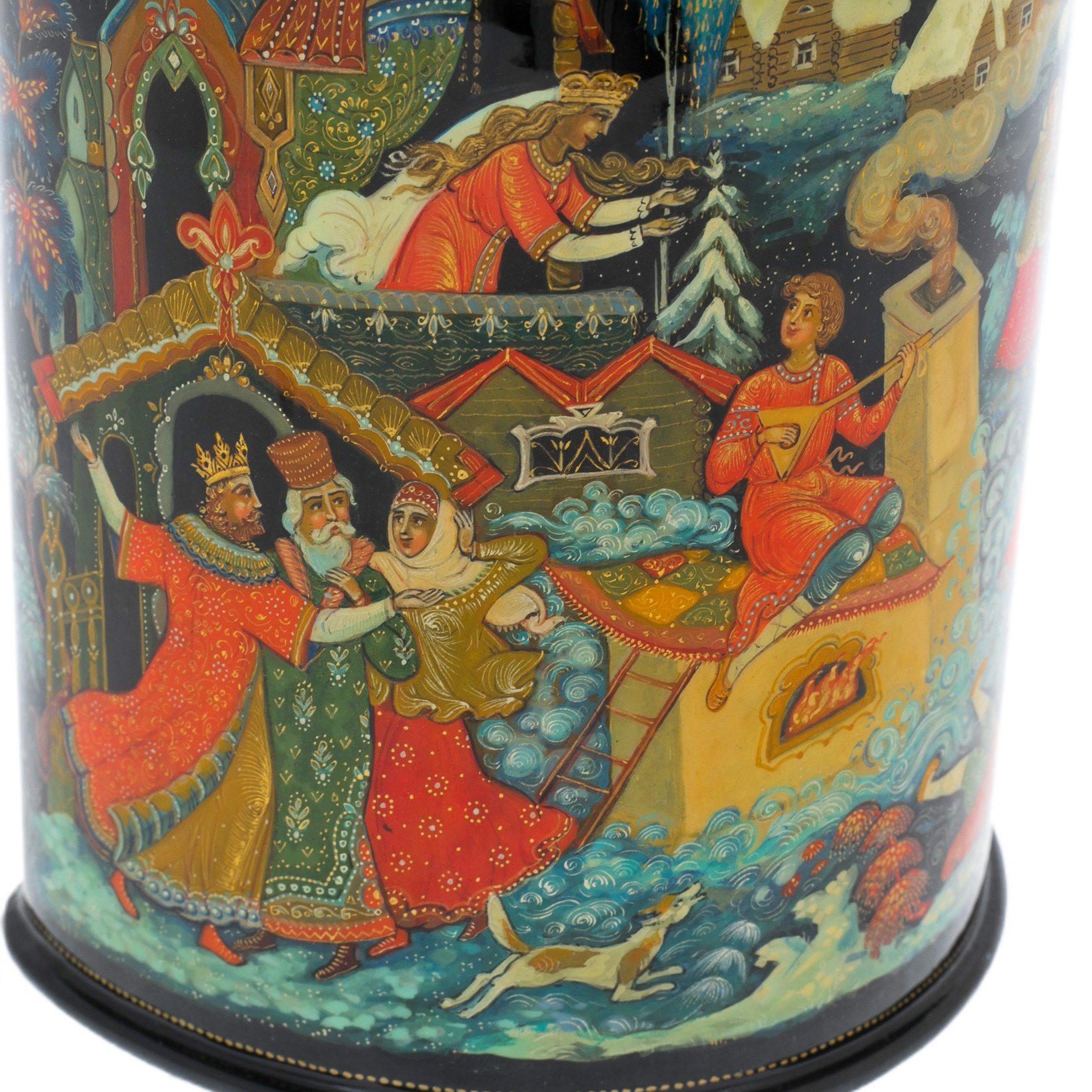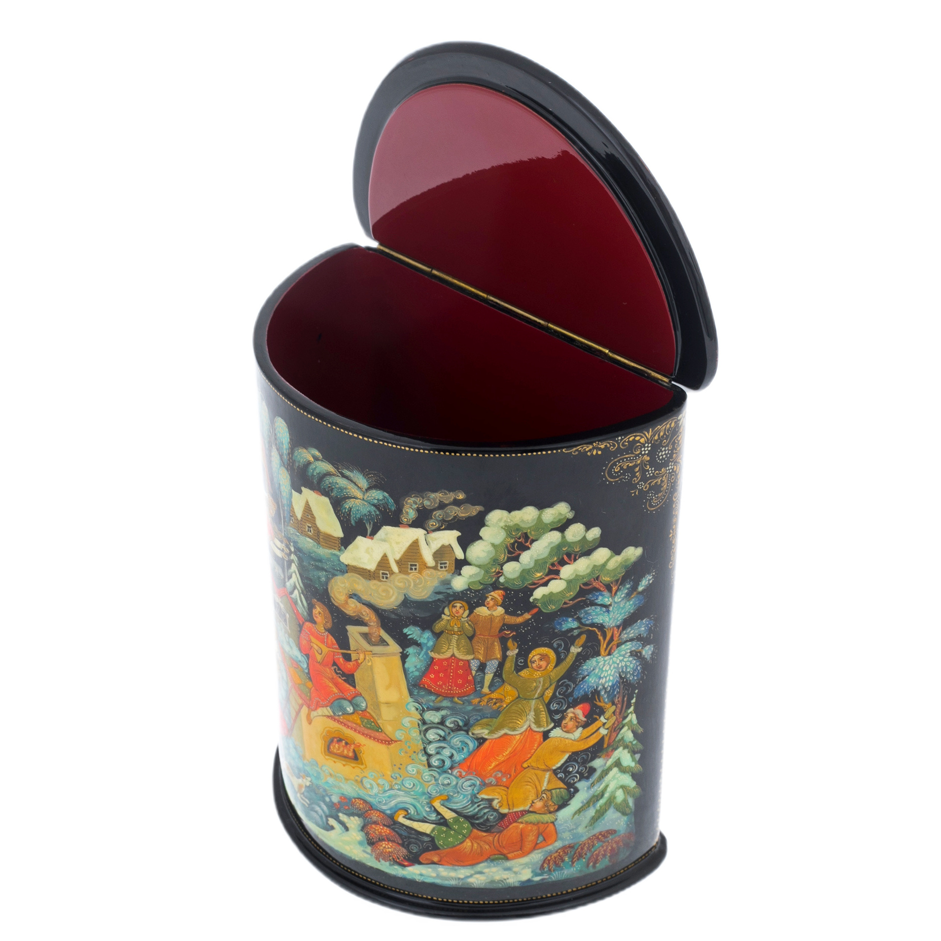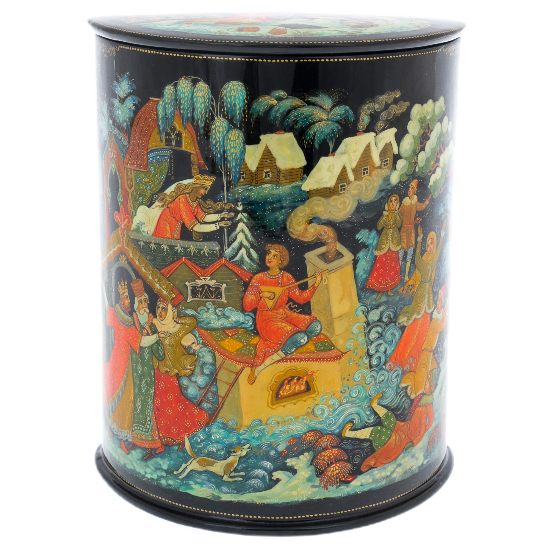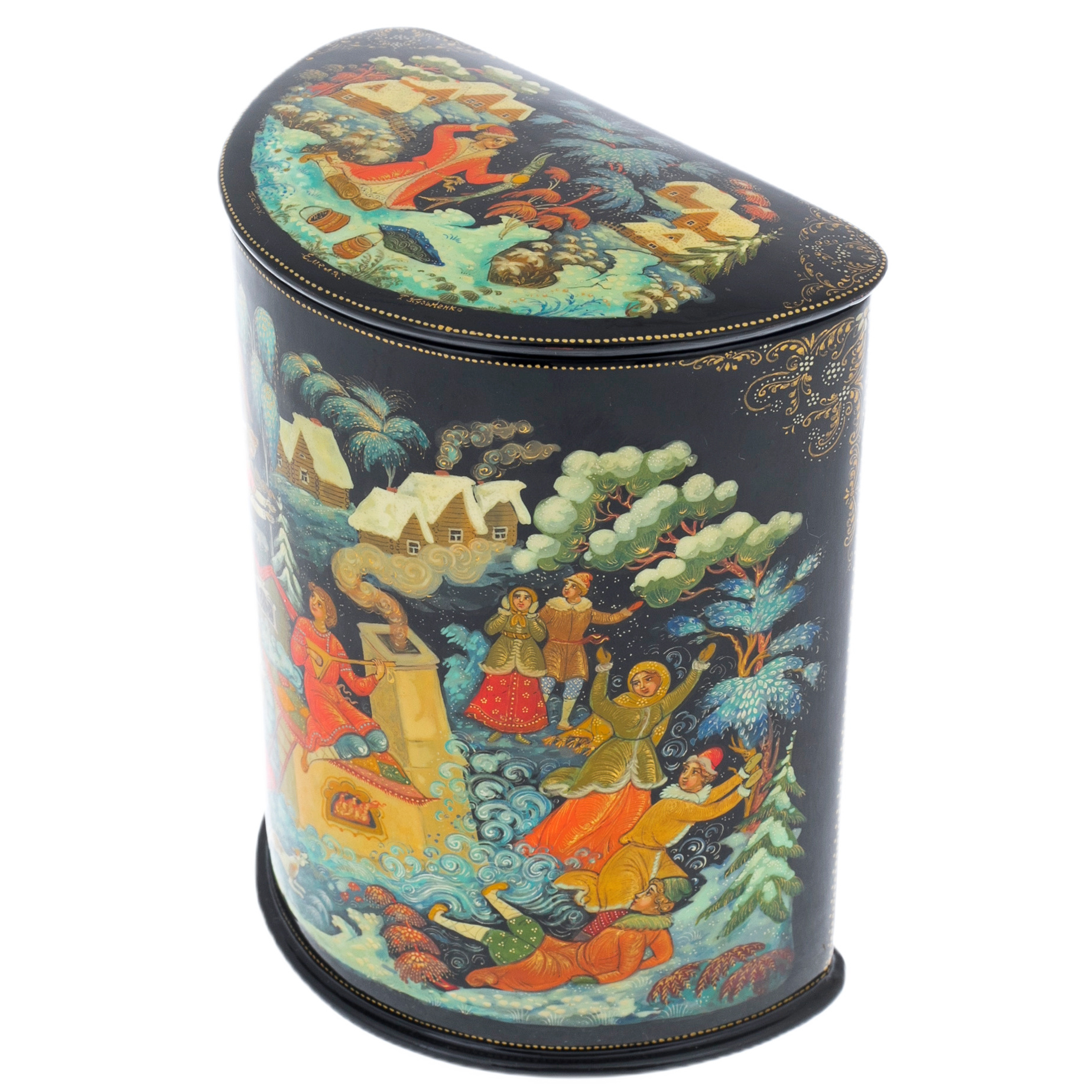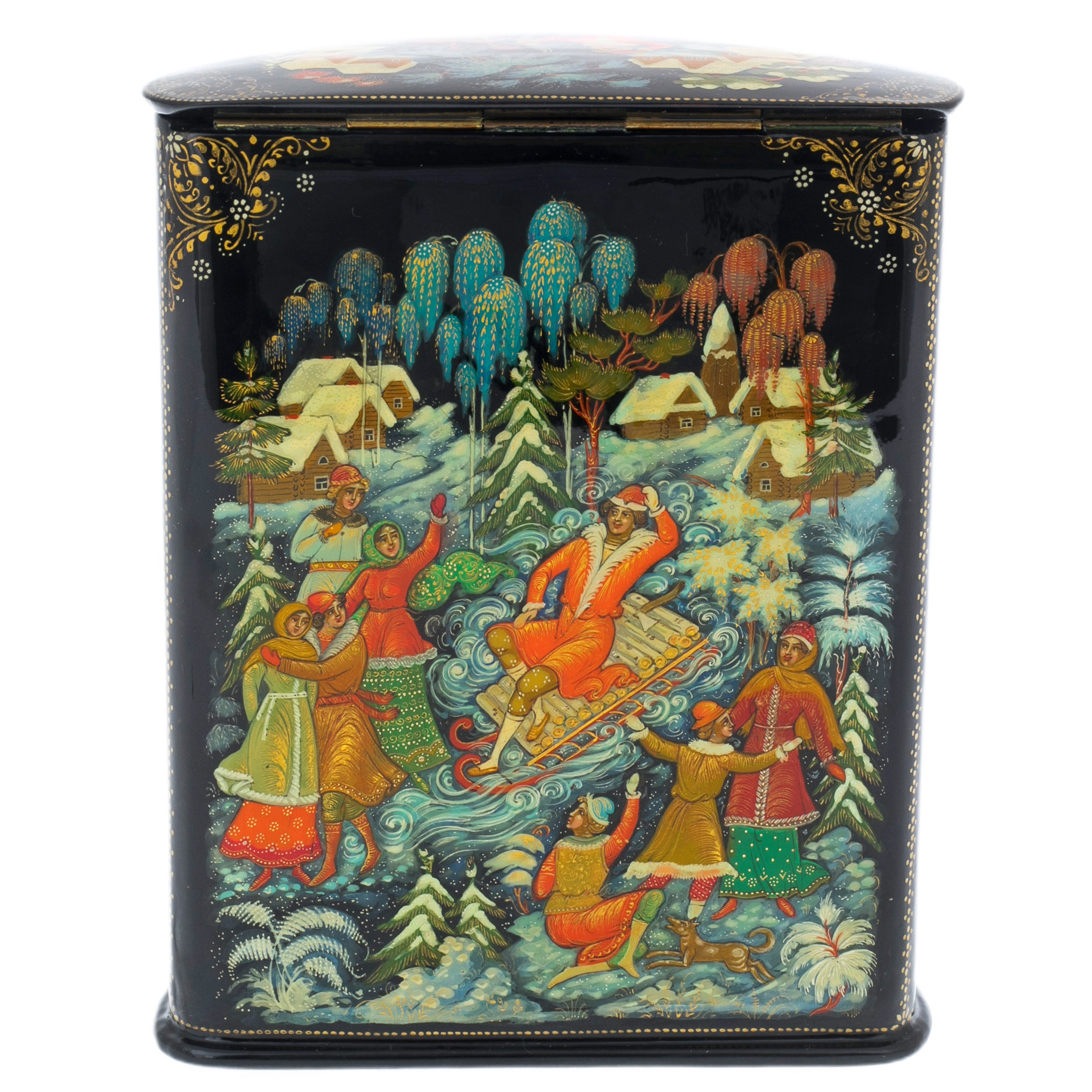 Этот ларец, вдохновленный сказкой "По щучьему велению", представляет собой не просто предмет интерьера, а настоящую сокровищницу эмоций и воспоминаний. Изготовленный с любовью и вниманием к деталям, он стал отражением богатой русской культуры и мастерства, воплощенного в каждом штрихе. Созданный из прессованного высококачественного древесного картона, пропитанного горячим льняным маслом, он обретает прочность и долговечность, а черный масляный лак, покрывающий поверхность, придает ему благородный блеск, словно ночное небо, усыпанное звездами.