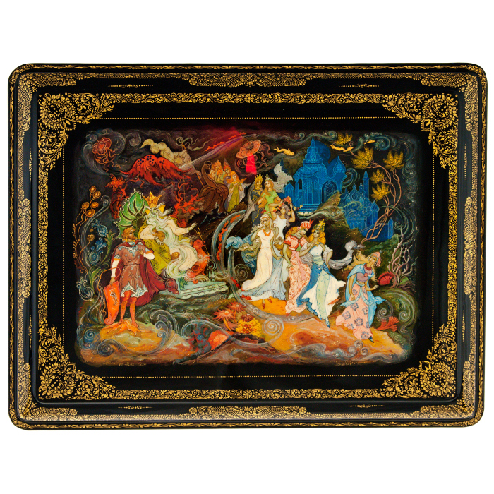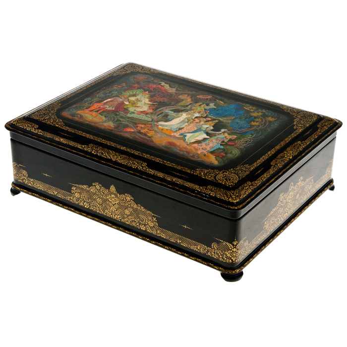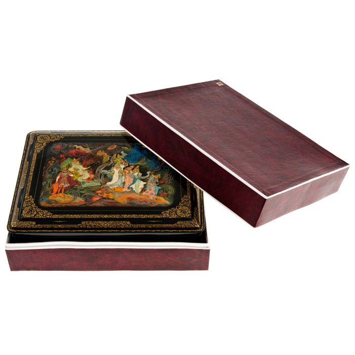 Ларец «Садко» — это не просто предмет хранения, а целая симфония, воплощённая в лаковой миниатюре. На крышке — сцена морского царства из былинной повести: герой с гуслями, окружённый стихией, красавицами и мифическим водным миром. Каждая фигура выписана с живописной точностью, словно вынырнув из волны в тот самый момент, когда звенит последняя струна. Яркие краски, наложенные на чёрный фон, вспыхивают, как капли росы на солнце, а золото, вплетённое в композицию, звучит так же, как звучал бы серебряный голос Садко на гуслях.