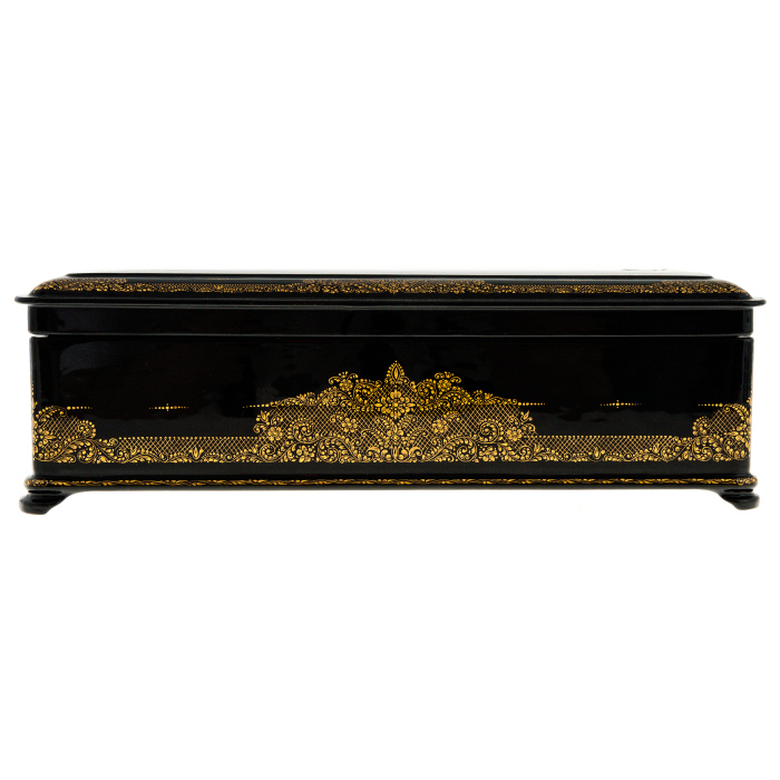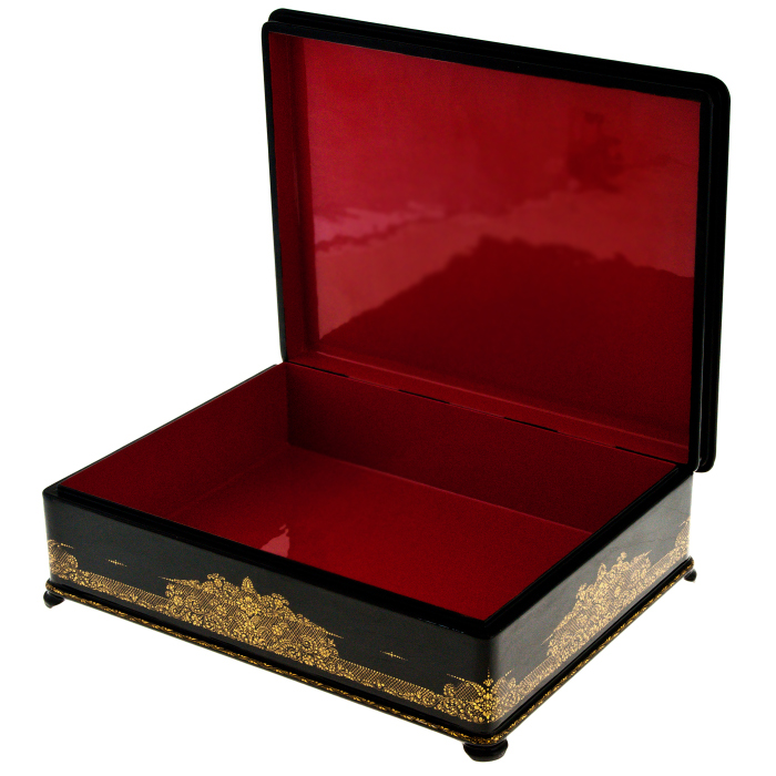 Внутри ларца — глубокий вишнёвый лак, нанесённый вручную и отполированный до зеркального блеска. Его гладкие поверхности рождают ощущение тишины и глубины, будто в нем покоятся не украшения, а воспоминания. Просторная форма позволяет разместить серьёзную коллекцию ювелирных изделий, а изящные ножки придают ларцу лёгкость и возвышенность. По периметру — золотое кружево, ритмически обвивающее корпус, словно морская пена, рассыпающаяся по чёрному зеркалу.