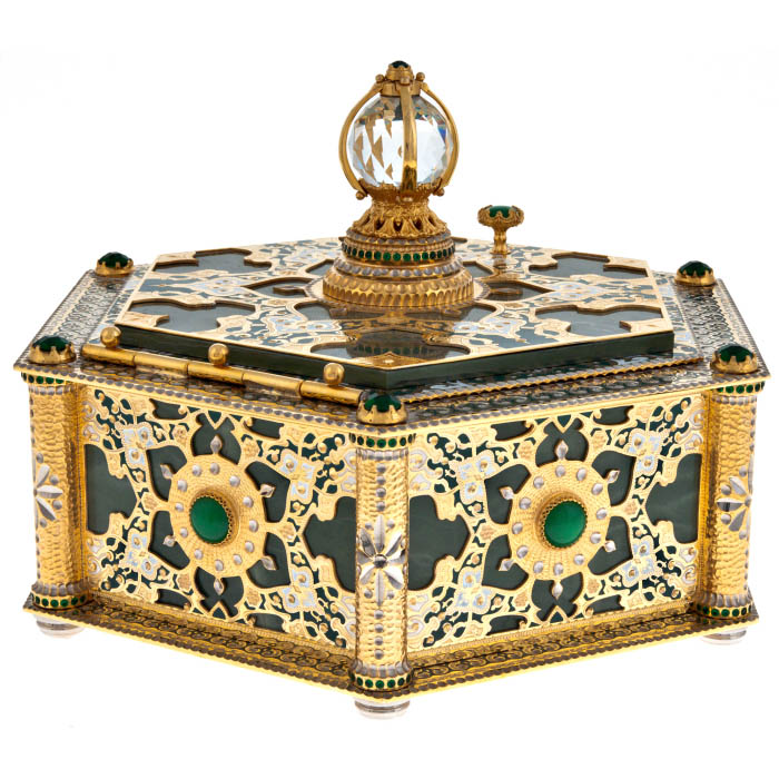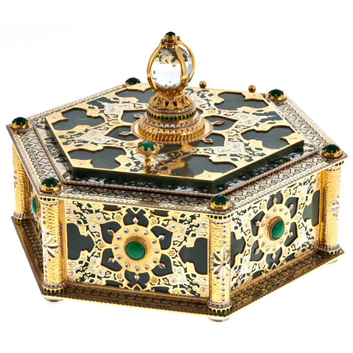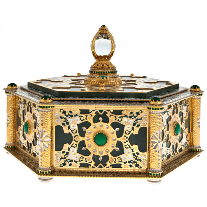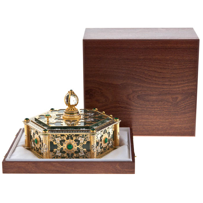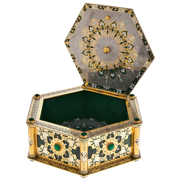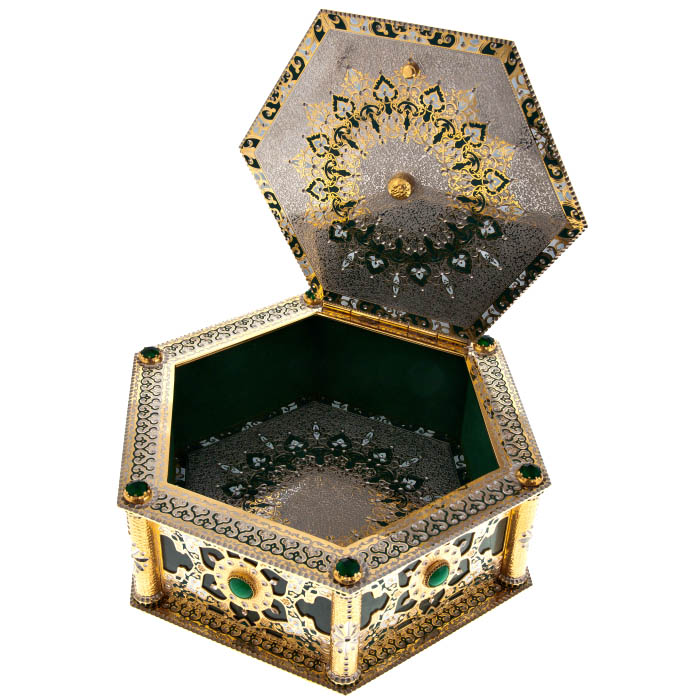 Этот великолепный шестигранный ларец, созданный мастерами из Златоуста, является воплощением царственной роскоши и утонченной красоты. Каждая его грань — словно отражение бесконечной тайны, где изысканная гравировка, выполненная на металле, рассказывает о величии прошлого и возвышенных идеалах. Ларец, украшенный зелеными камнями, напоминает о древних сокровищах, охраняемых тайными знаниями и скрытыми желаниями, достойными лишь избранных.