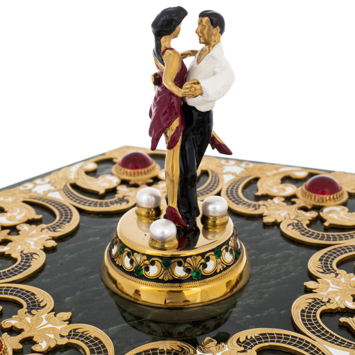 Верхняя плоскость украшена шестиугольной композицией, создавшей обрамление для миниатюрной скульптуры двух танцоров. Фигуры, выполненные в яркой ручной росписи, передают движение, эмоцию и выверенную пластику танго, придавая всей шкатулке характер произведения, созданного для созерцания. Эмалевые элементы, жемчужные вставки, барочный узор, гравировка — каждая деталь исполнена с предельной аккуратностью, подчёркивающей ручной труд мастеров. Крышка поднимается плавно, открывая внутреннее пространство, облицованное нефритом, а с обратной стороны взгляд встречает ещё одну миниатюру — изображение пары в танце, выполненное в той же стилистике.
