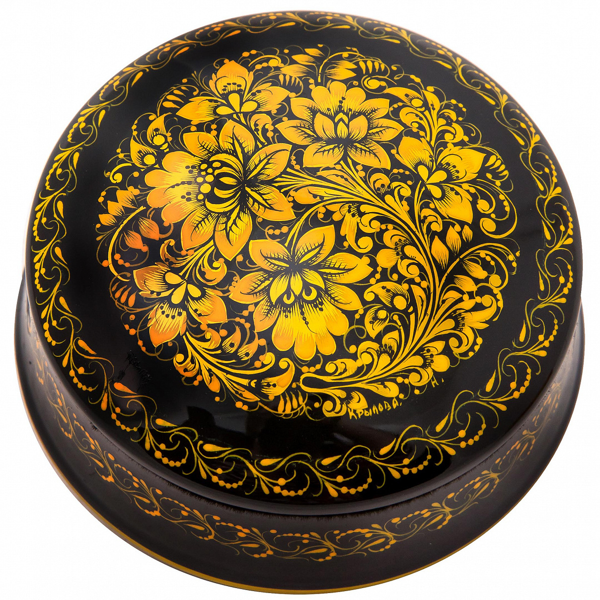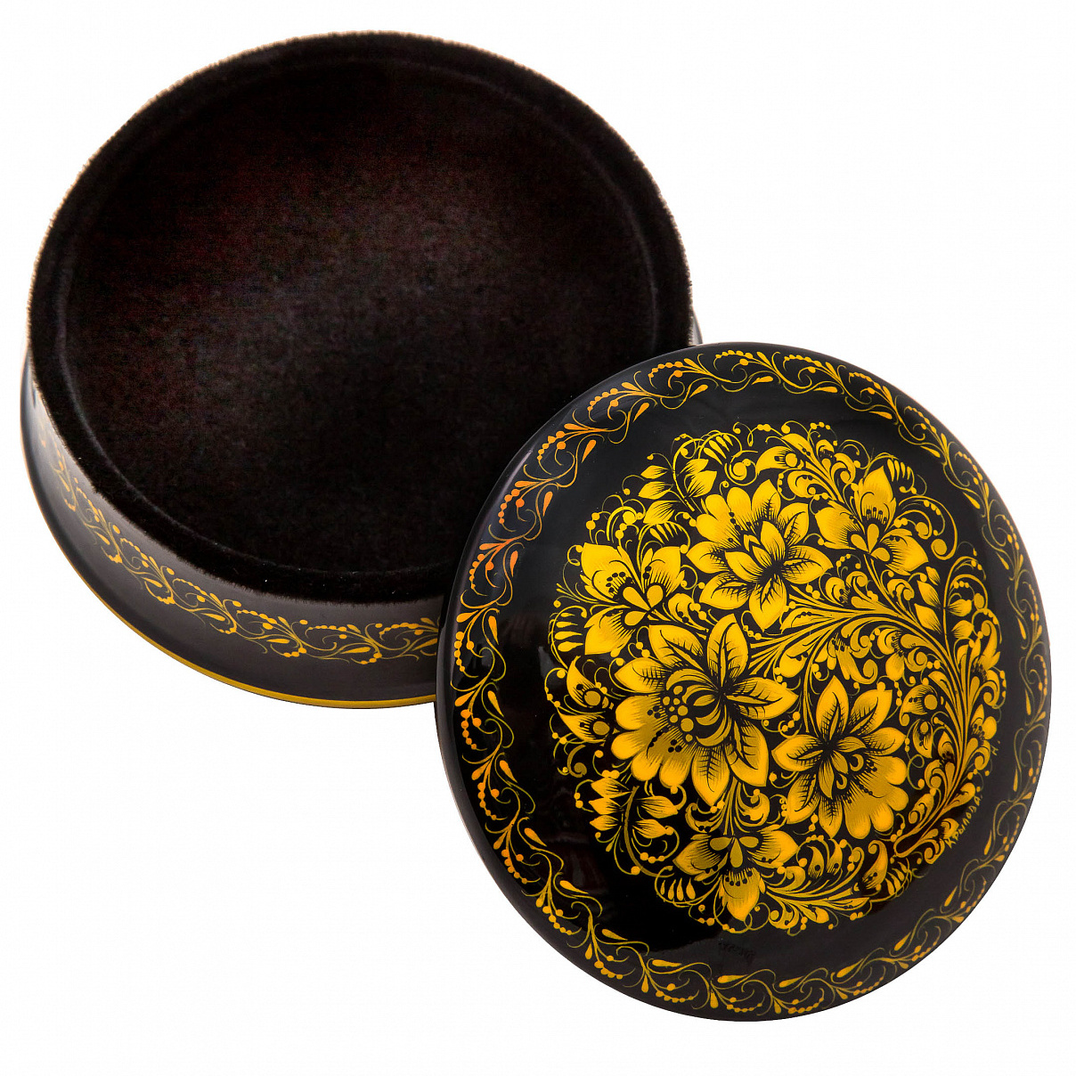 Коробка с миниатюрной росписью изготовлена в полном соответствии с традиционной хохломской технологией золочения. Выточена из цельного дерева вручную. Имеет авторскую роспись в технике фонового письма. Роспись «Кудрина». Лаковое покрытие и многократный высокотемпературный обжиг делает изделие влагозащищенным и износоустойчивым. Все применяемые при производстве материалы натуральны и экологичны. Удивительная миниатюрная шкатулка со съемной крышкой и флокированной внутренней поверхностью - универсальный подарок для представительниц прекрасного пола. Она украсит интерьер, создав в нем праздничный акцент. На каждом изделии имеется подпись автора росписи.
