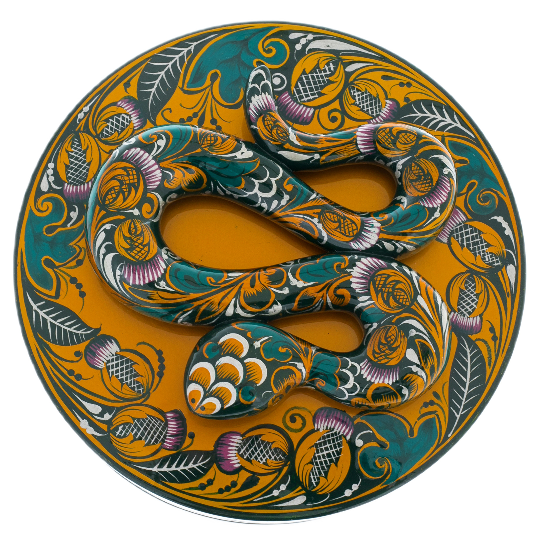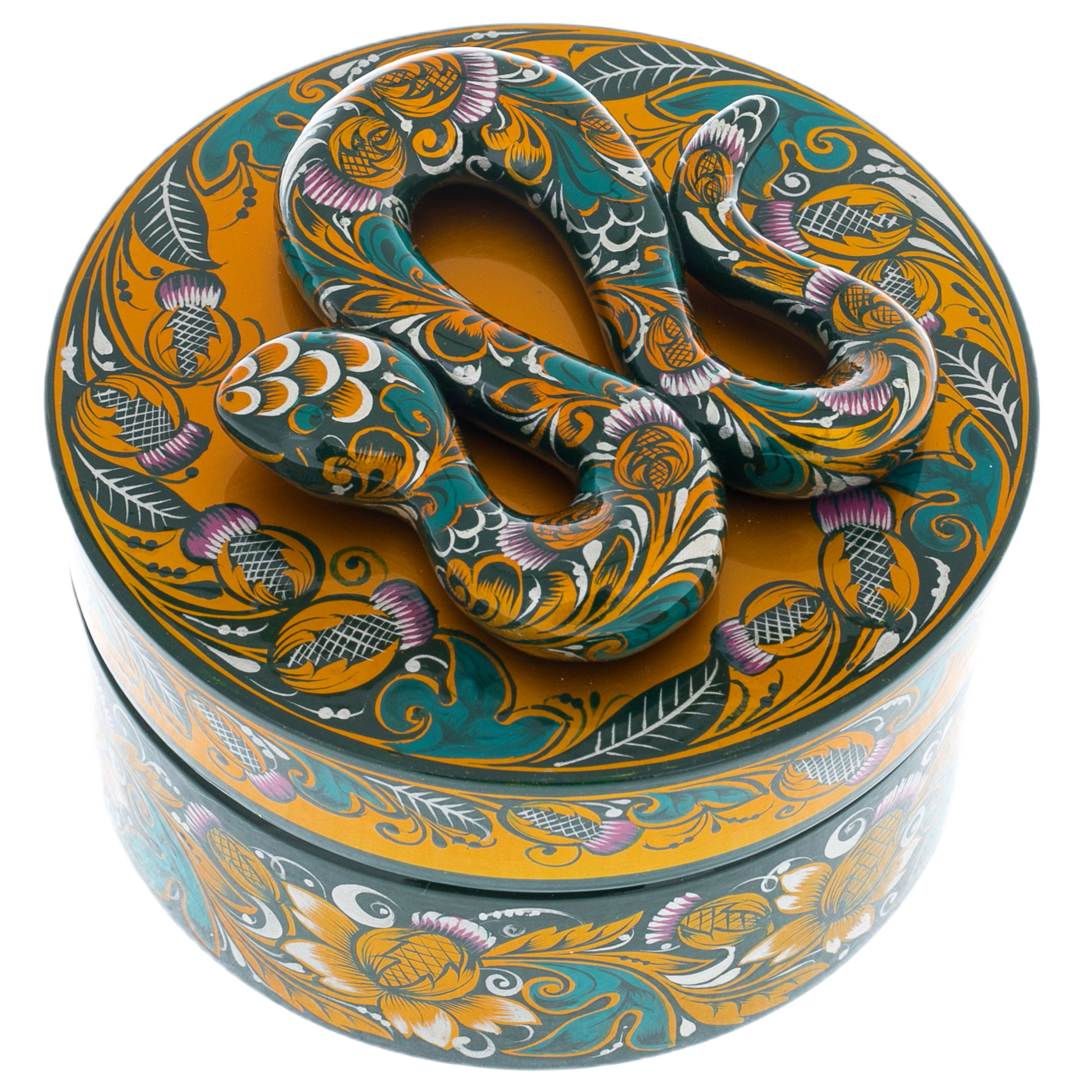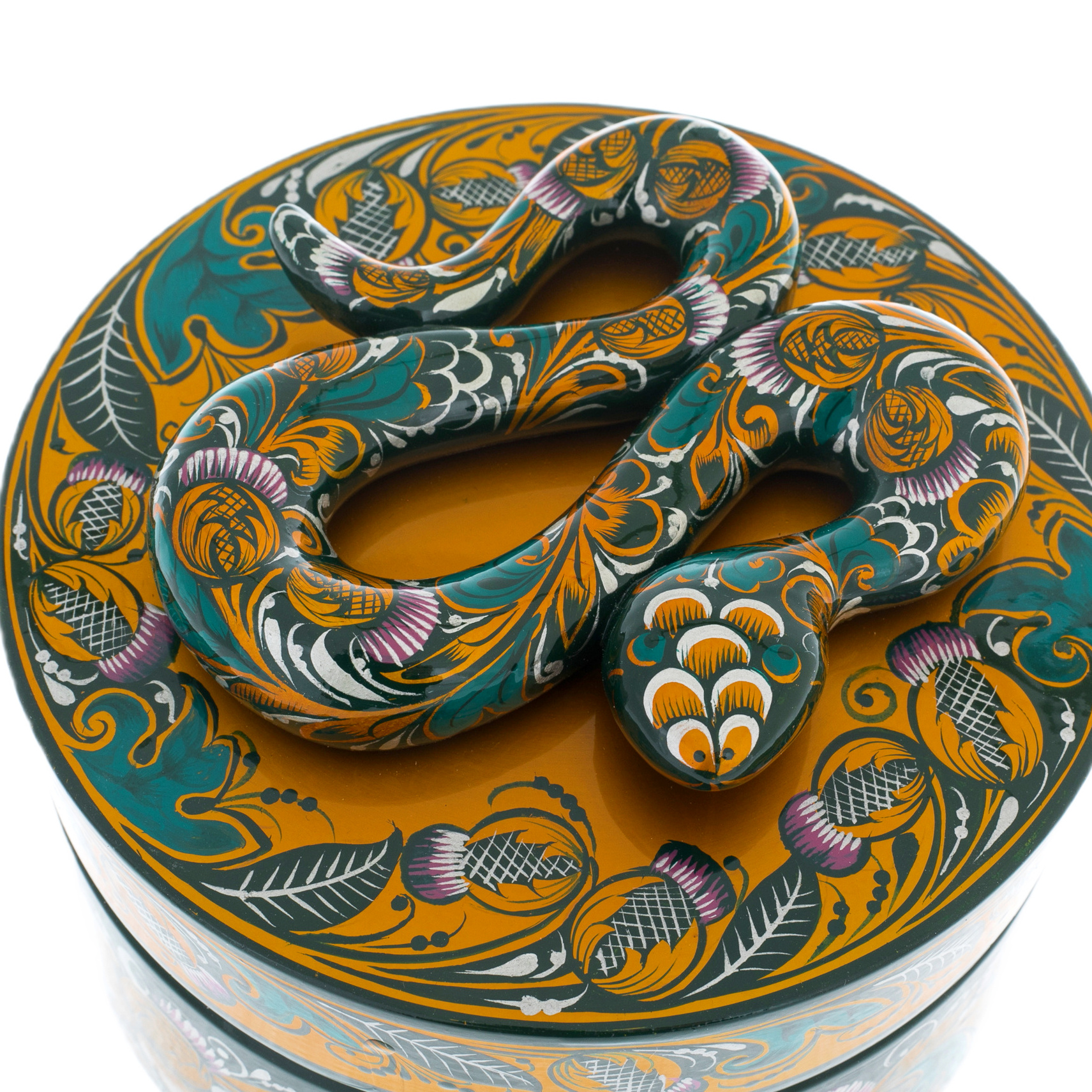 На крышке шкатулки расположена выполненная в объёмной технике змея, символ мудрости и вечности. Её изогнутые линии и переливы зелёного с золотом завораживают, как древний мифический оберег, защищающий покой и богатство. Обрамленная цветочным орнаментом, она кажется живой — её взгляд загадочен, а формы наполнены скрытой силой и грацией.