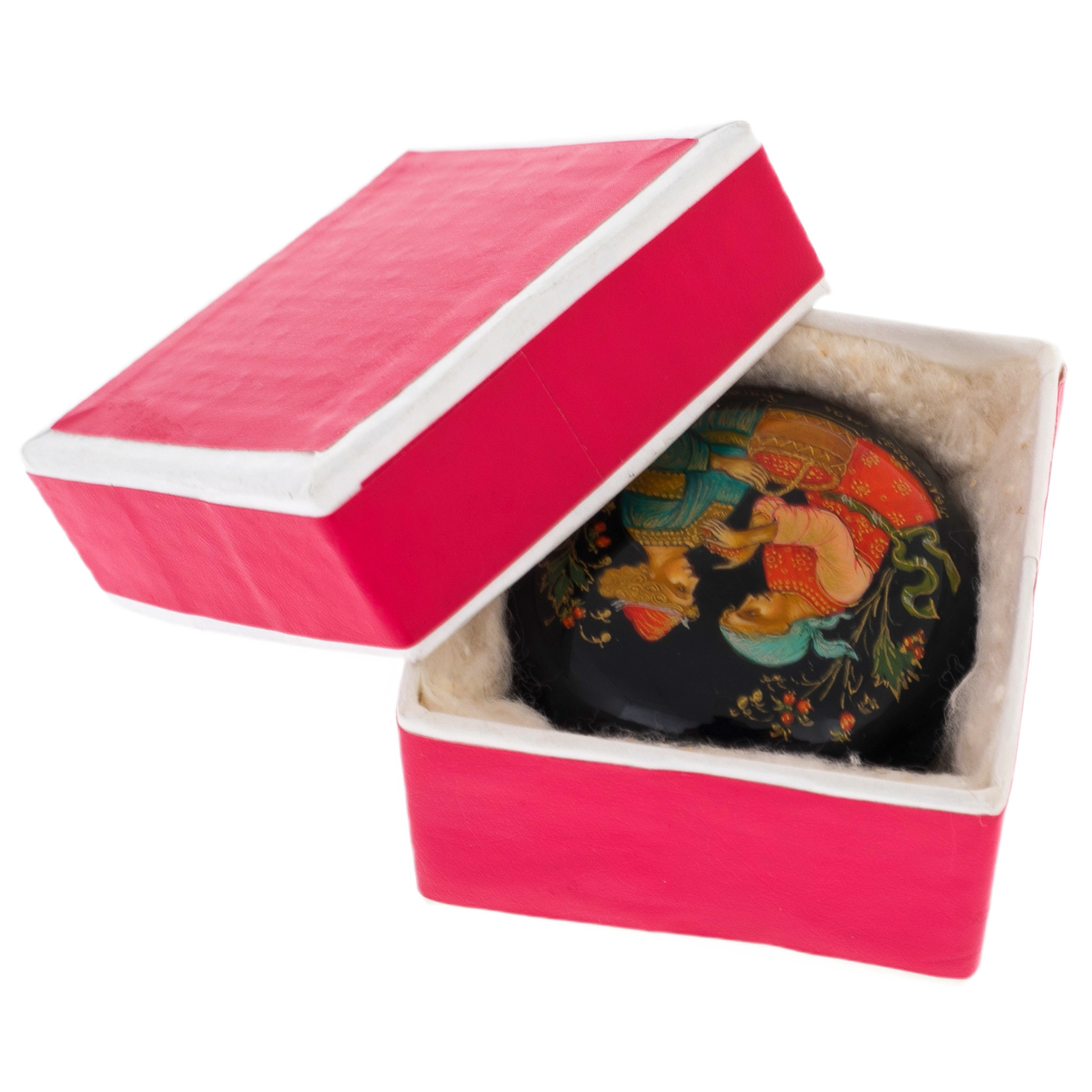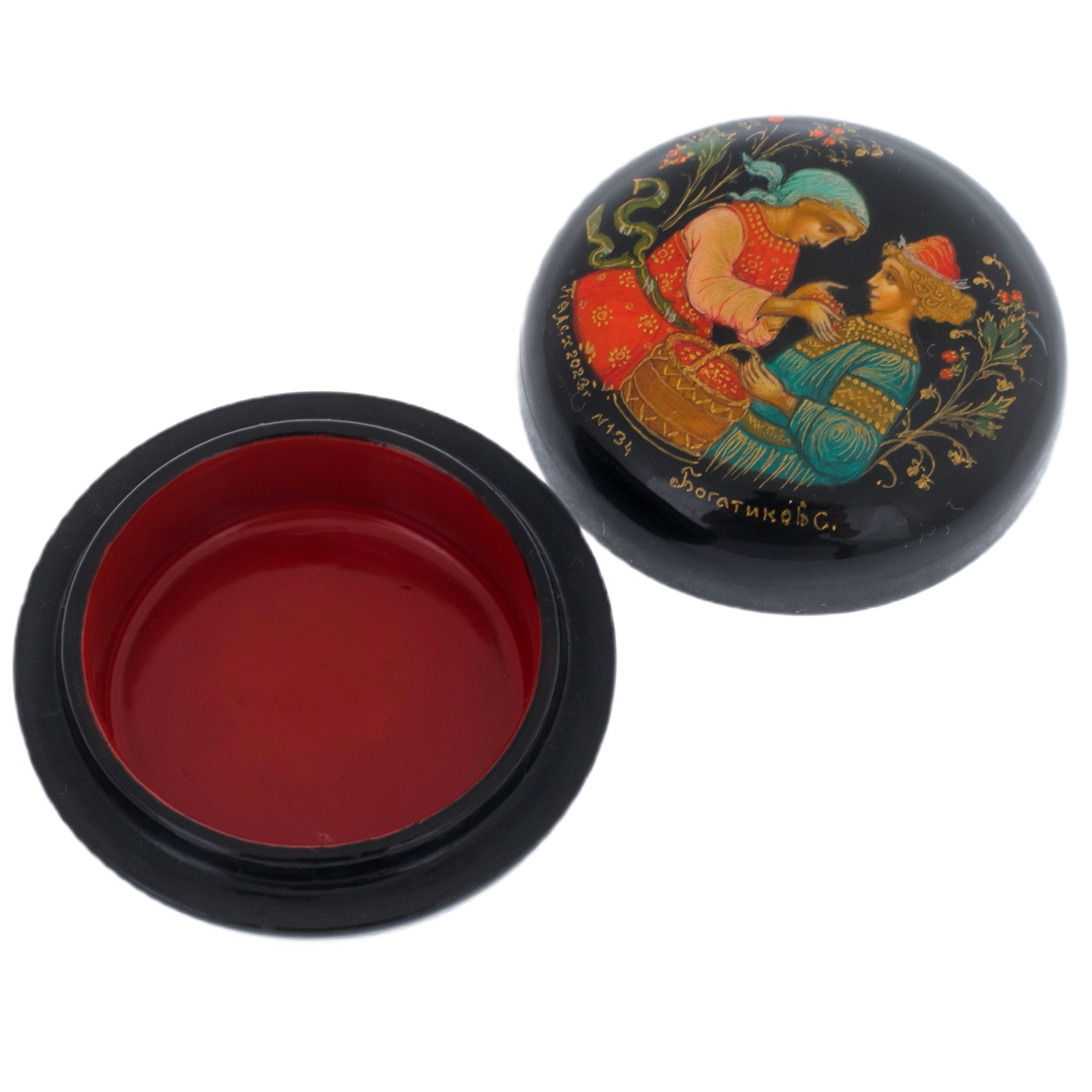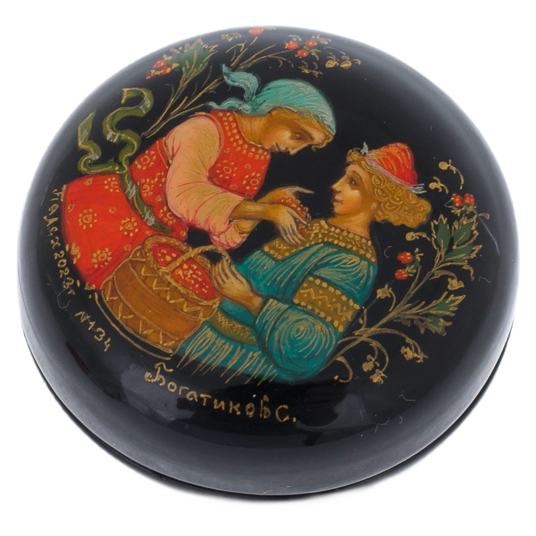 Пудреница "Парочка" — это нежное напоминание о трепетных мгновениях юной любви, запечатленное кистью талантливого мастера. На крышке оживает сцена из русских сказок: девушка в ярком праздничном сарафане с корзиной спелых ягод порыве искренности и нежности наклоняется к юноше в богатом наряде. В их взглядах читается доверие, робкое очарование, способное тронуть самые холодные сердца. Парочка окружена цветочным орнаментом, плавно тянущимся по черному фону, словно ночной сад, усыпленный звездами.