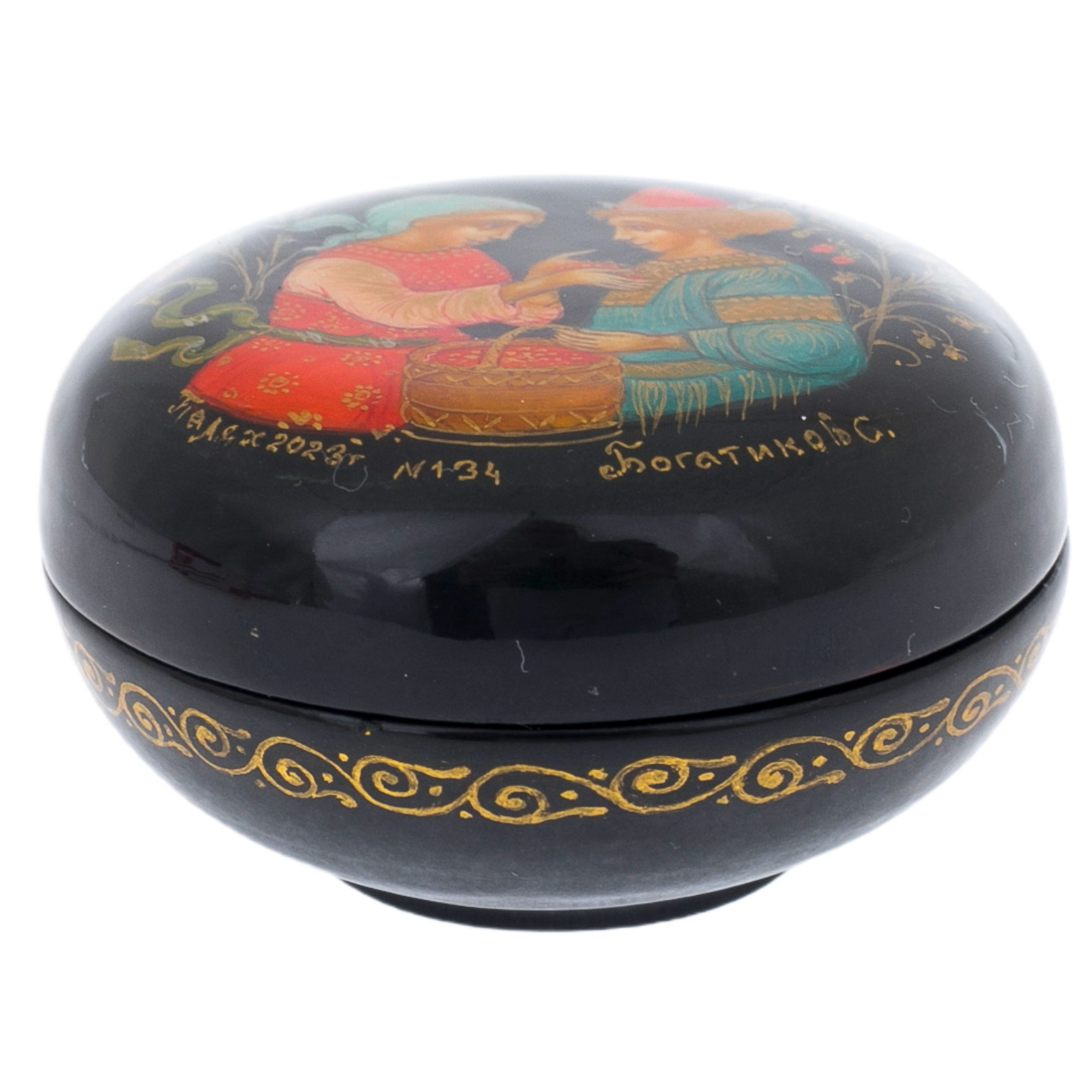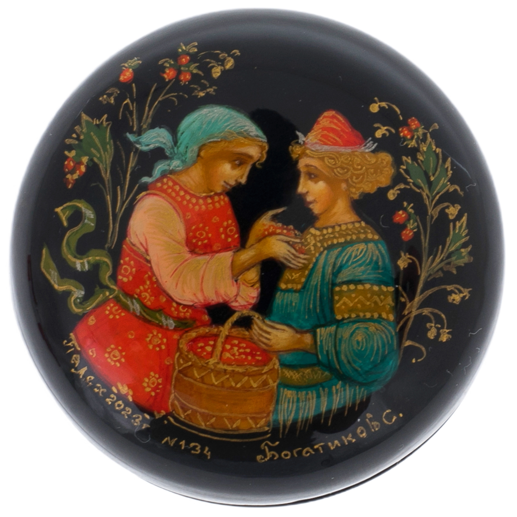 Блестящий черный лак, покрывающий поверхность пудреницы, контрастирует с яркостью росписи, выделяя каждый штрих и золотой акцент, напоминающий россыпь солнечных лучей в густой тени. Этот предмет, созданный в технике Палехской миниатюры, переносит вас в мир, где каждое прикосновение к его поверхности словно пробуждает древние предания. Мастер с особой точностью передал черты персонажей, одежду, детали корзины, лепестки на фоне, чтобы каждый элемент создавал гармоничный образ, полный тайной и глубокой эмоциональной силы.