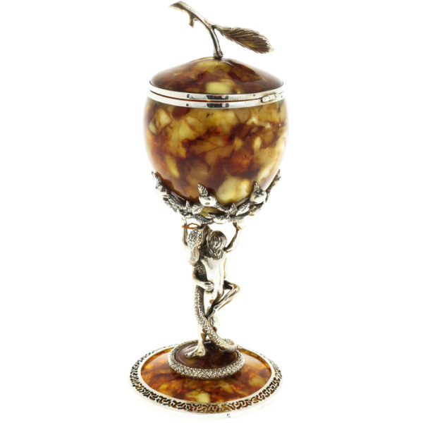 Очаровательная янтарная шкатулка покоится на ножке, выполненной в виде скульптурной композиции из бронзы или серебра. Переплетенные тела Адама и Евы, срывающей яблоко; змий, обвивающий влюбленную пару — символы библейского искушения. Сама шкатулка по форме напоминает яблоко с бронзовыми или серебряными листьями.
