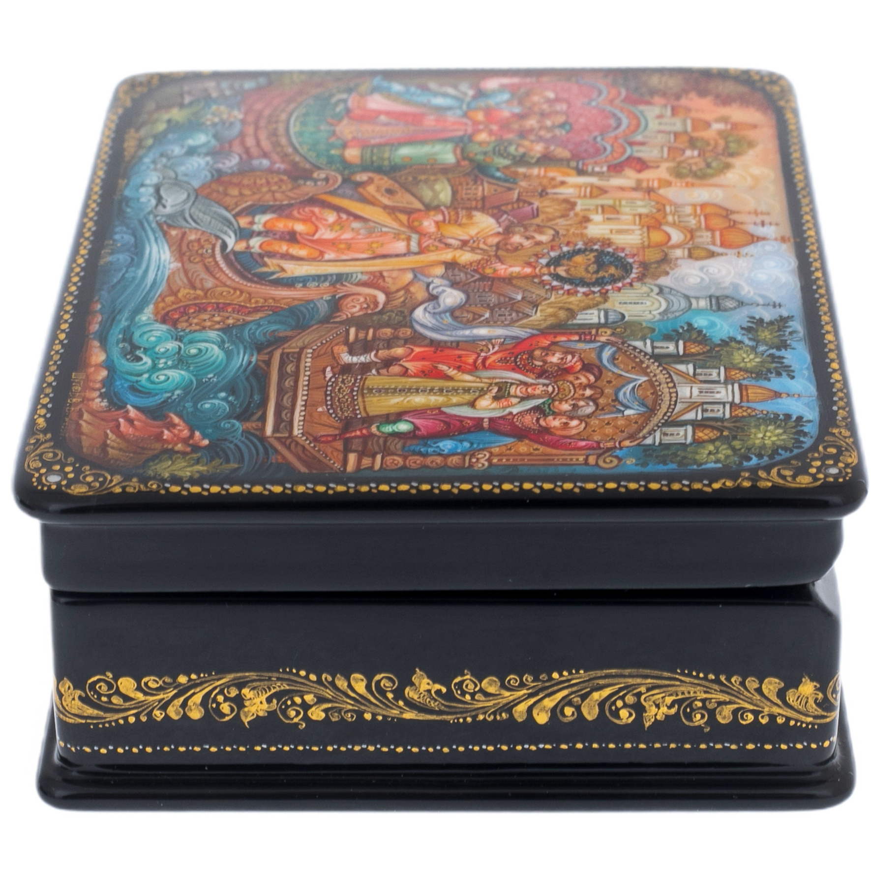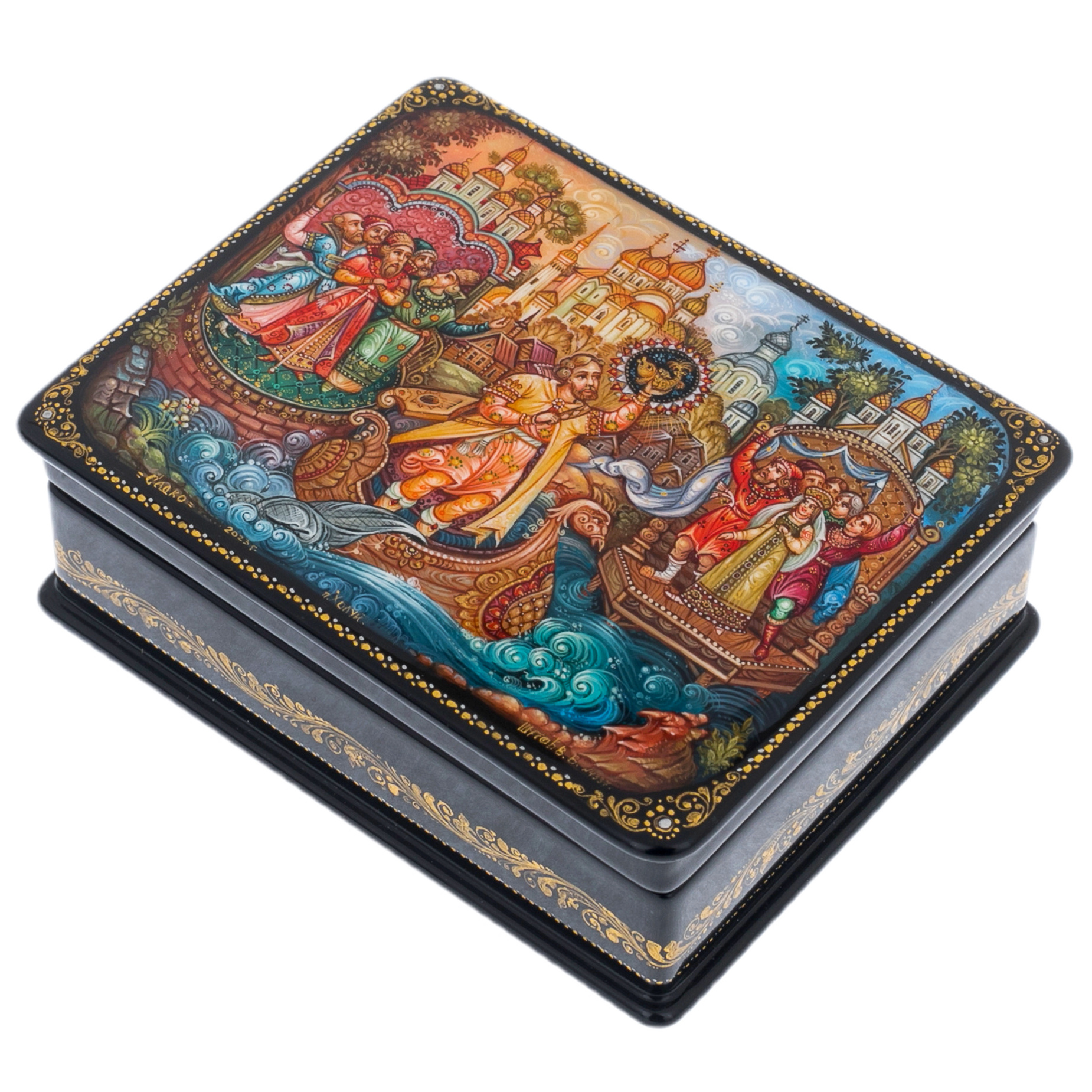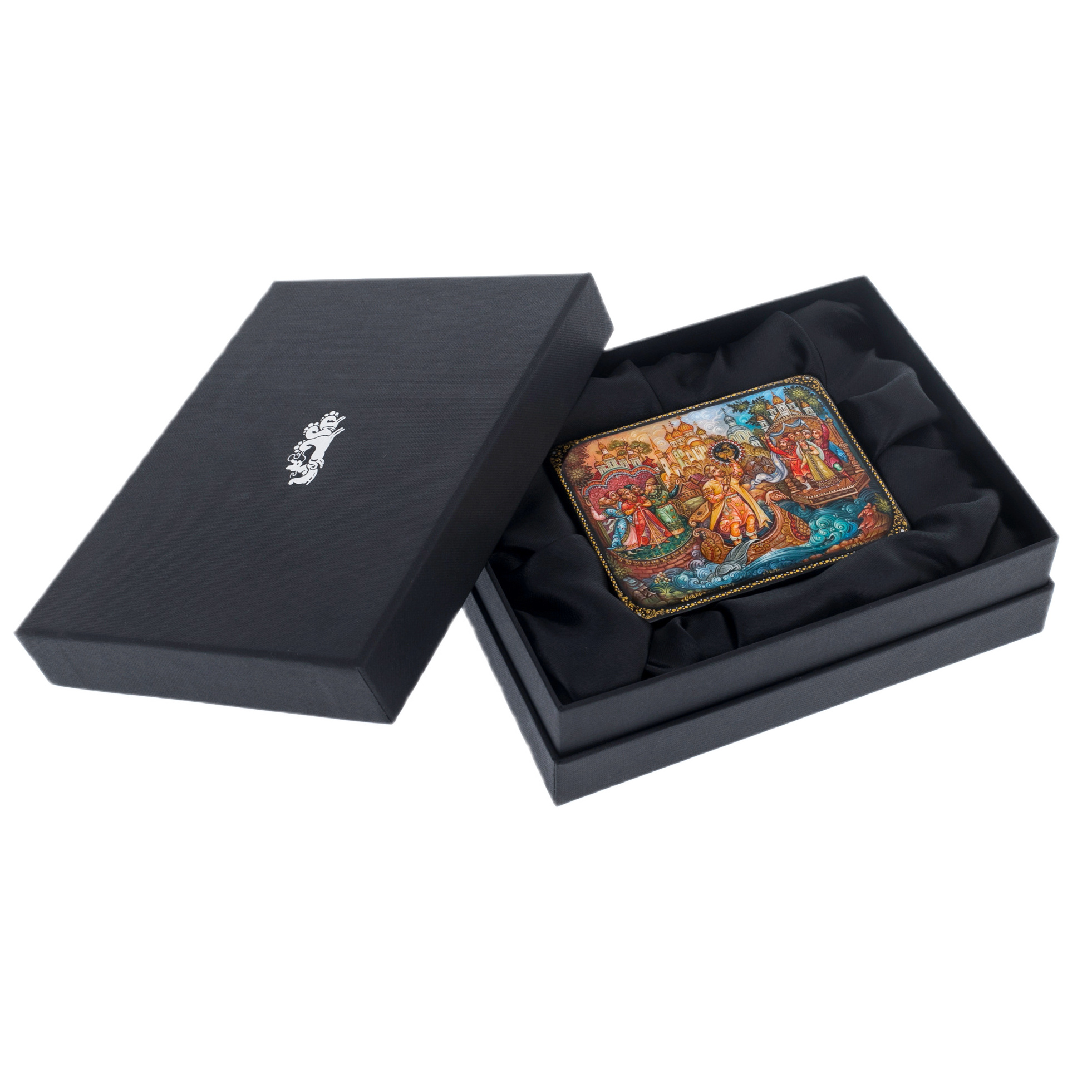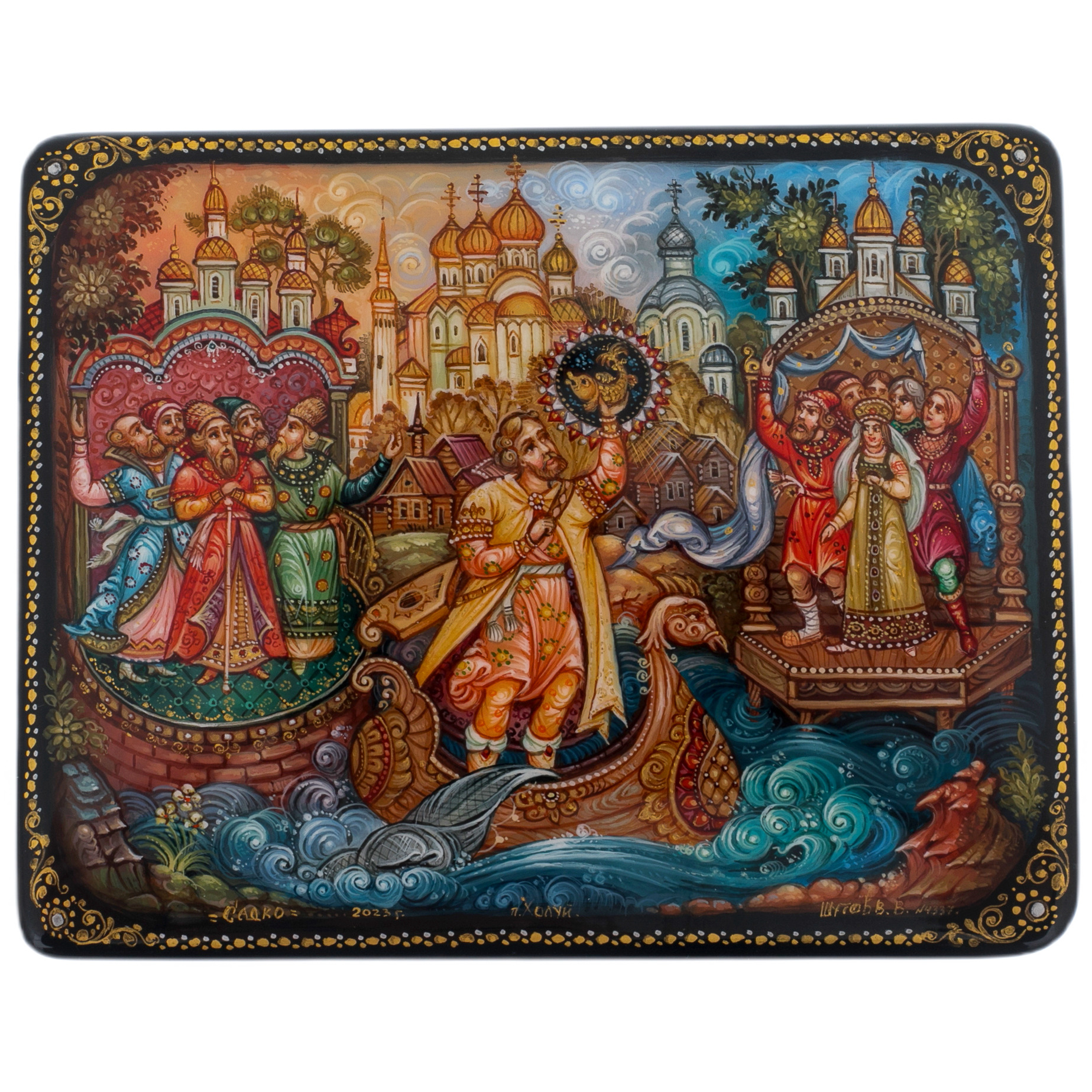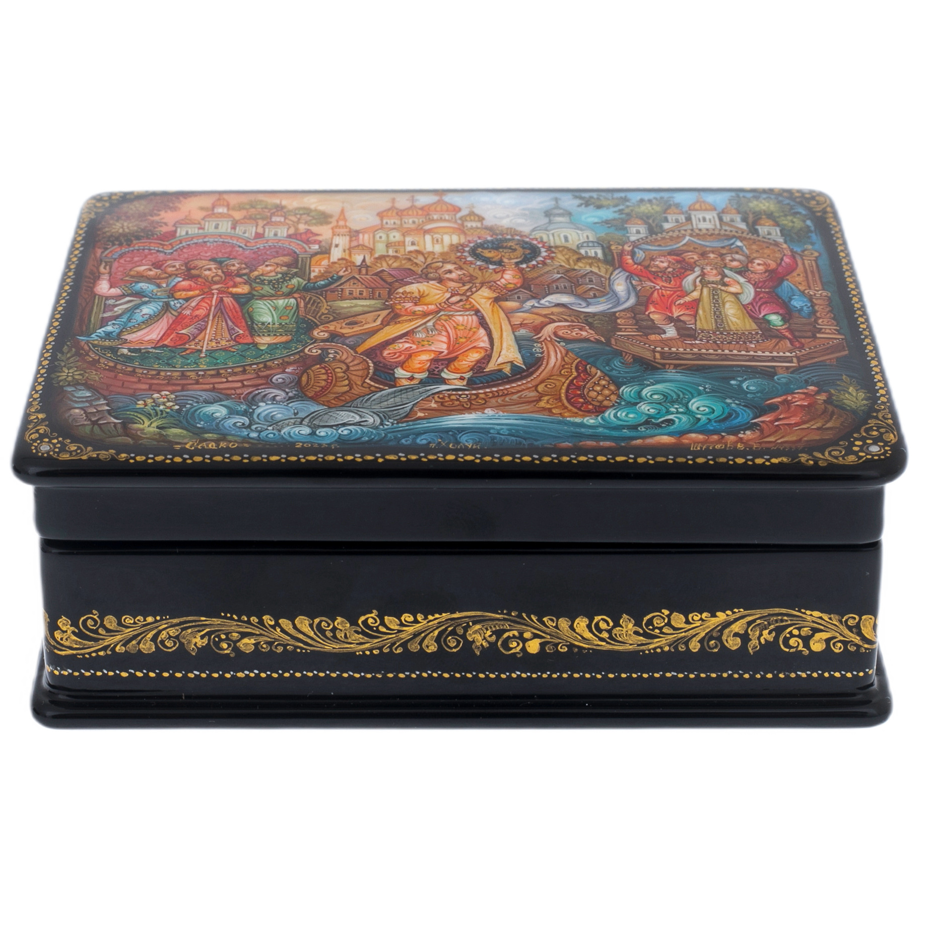 Шкатулка "Садко" — это великолепие русского лубка, ожившего в форме и красках, мастерски выполненное художниками холуйской школы. На ее крышке, словно на миниатюрном полотне, развернулся сюжет о Садко — русском купце, артистичном герое, отправившемся покорять морские глубины. Лица персонажей светятся, живут в каждом штрихе, как будто рассказывают древнюю сказку, где каждое мгновение — это ода славе и величию.