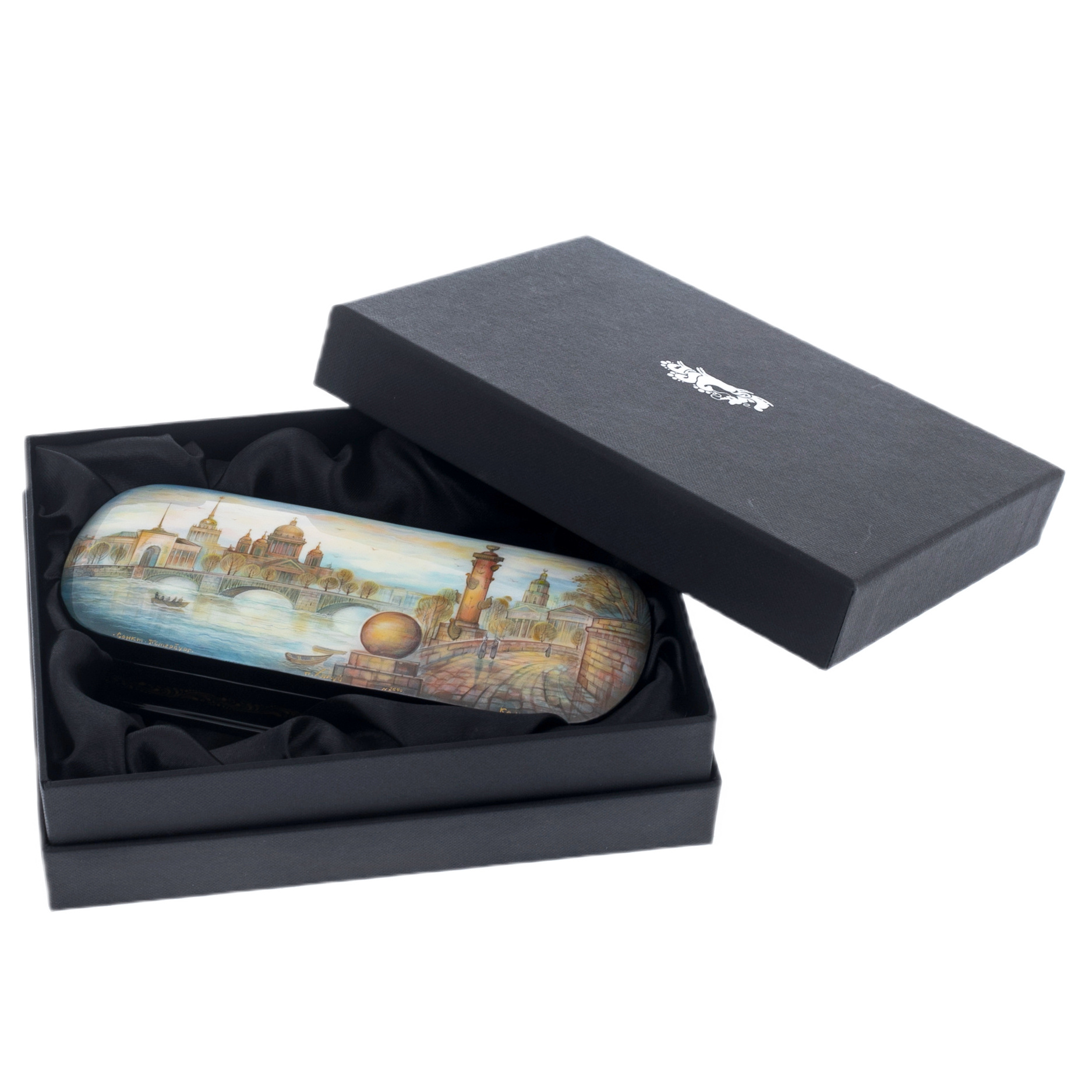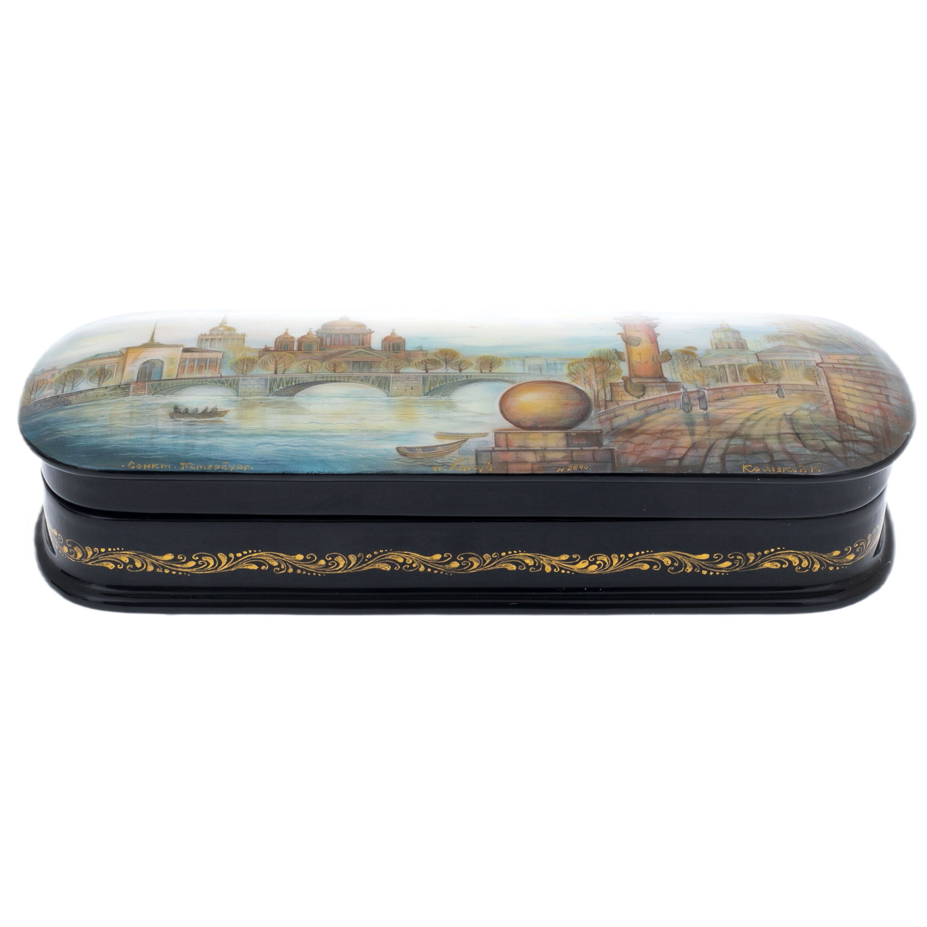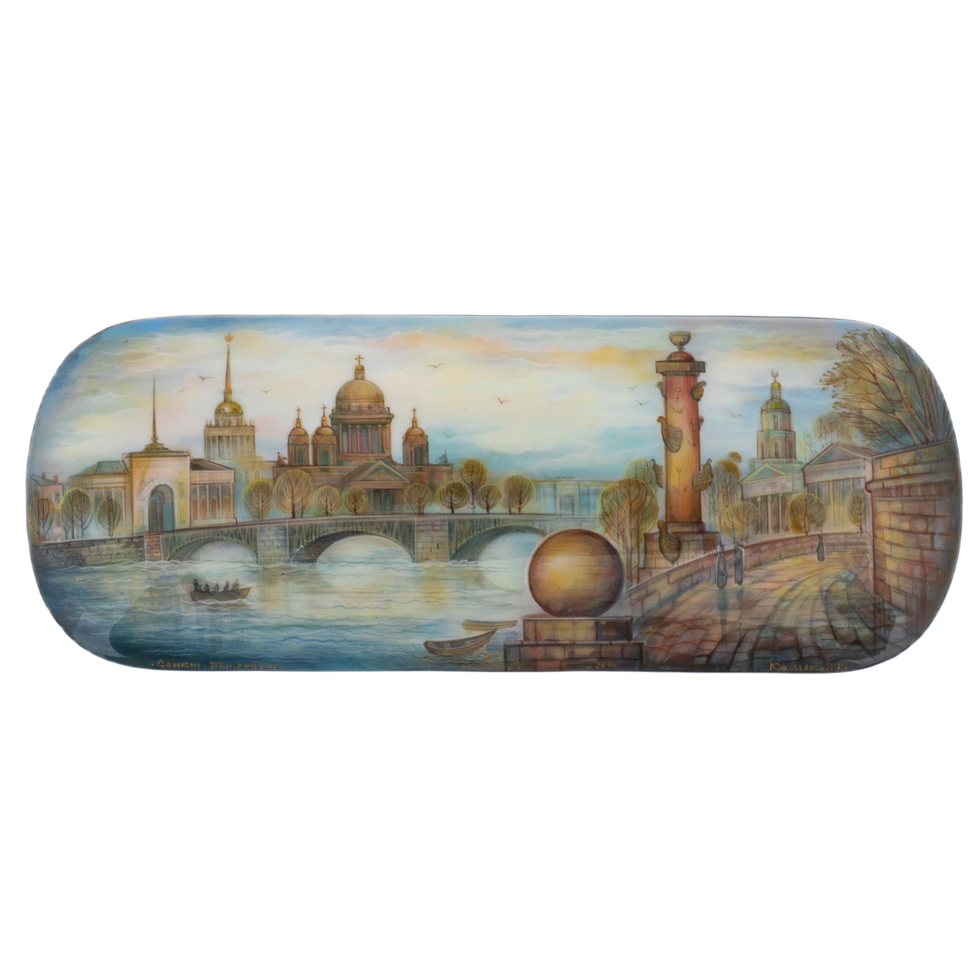 Шкатулка "Санкт-Петербург" от мастеров холуйской школы — это настоящее произведение искусства, вдохновленное величием и неповторимой красотой города на Неве. На её крышке изображены Ростральные колонны, строгие и величественные, словно символы надежности и непоколебимости, а также величественный мост, раскинувшийся над гладью реки. Утренний свет окутывает этот городской пейзаж, пронизывая его легкой дымкой, в которой каждый элемент приобретает таинственный, почти эфемерный оттенок. Внимание к деталям — от нежных оттенков листьев до отражения в воде — создает ощущение присутствия и причастности к этому удивительному миру Петербурга.