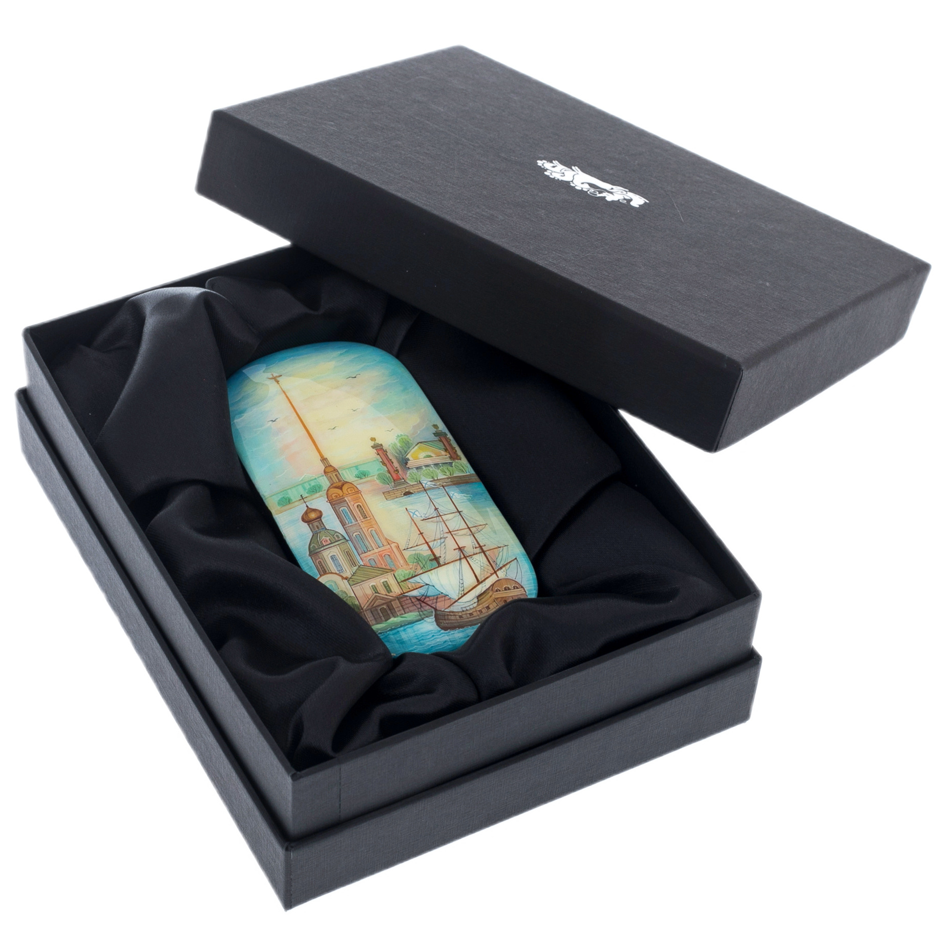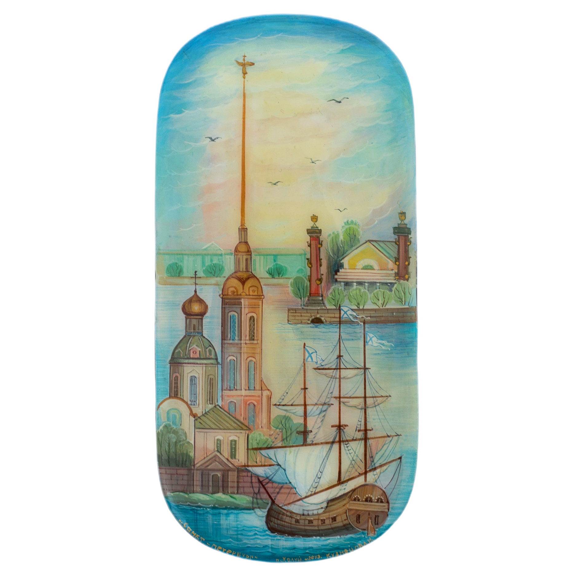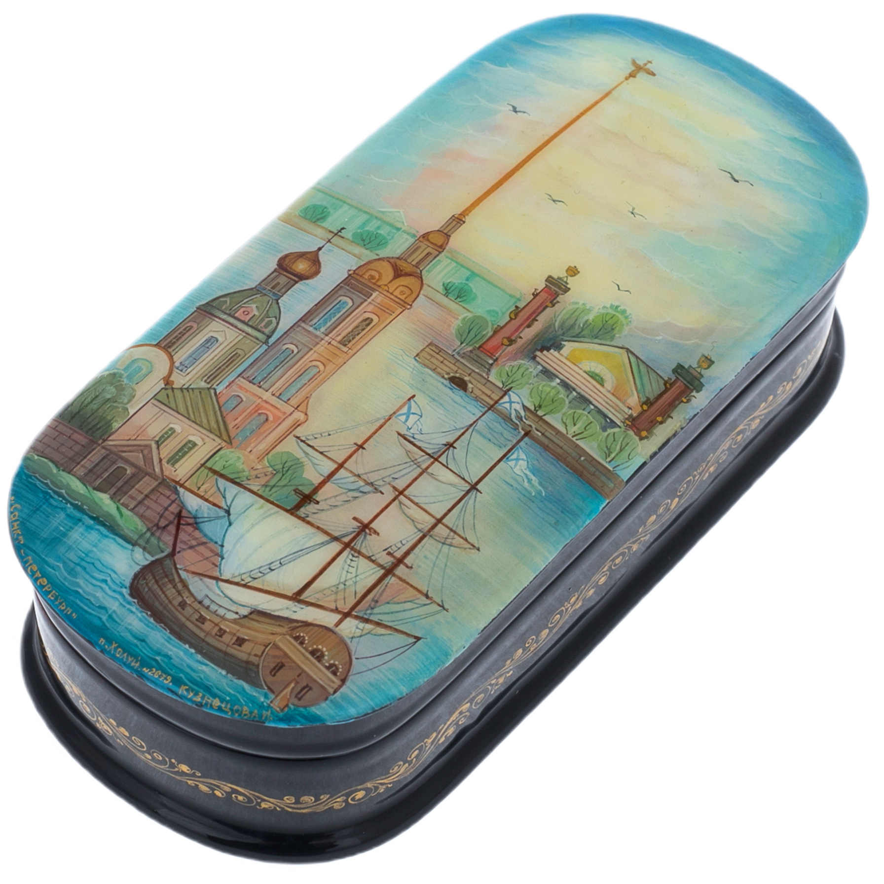 Шкатулка "Санкт-Петербург" — это драгоценный сувенир, воплотивший в себе дух одного из самых величественных городов мира. На её крышке раскинулась панорама Санкт-Петербурга, где величественные здания Петропавловской крепости, стройный шпиль и флаги над мачтами корабля погружают в атмосферу былых эпох. Художник холуйской школы мастерски передал романтику Северной столицы, где реки и каналы отражают небеса, а архитектура словно дышит историей. Каждый штрих и цветовой переход наполняют картину лёгкостью и утончённостью, создавая ощущение умиротворения и спокойствия.